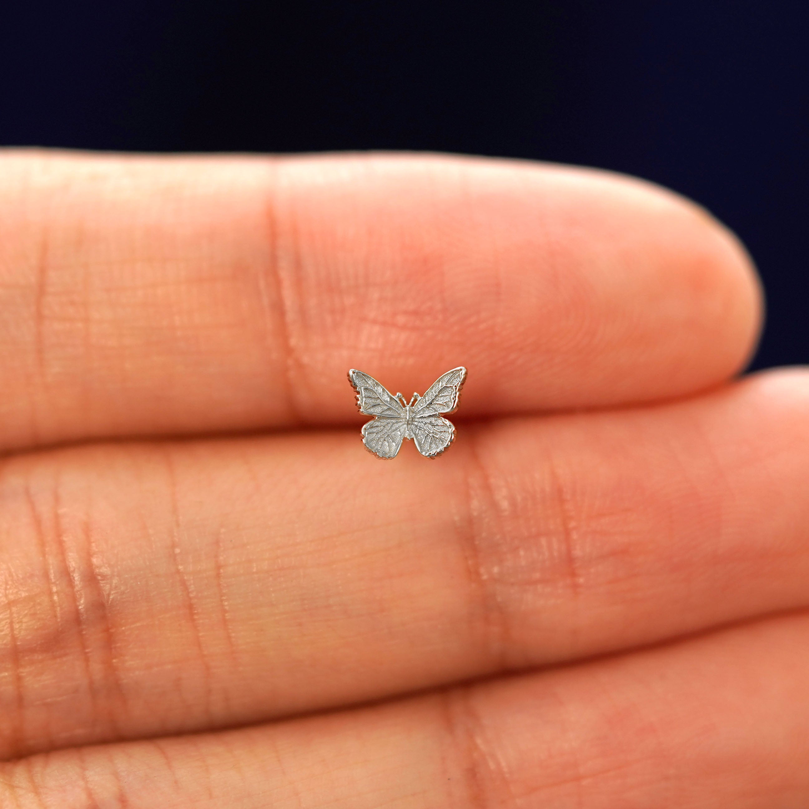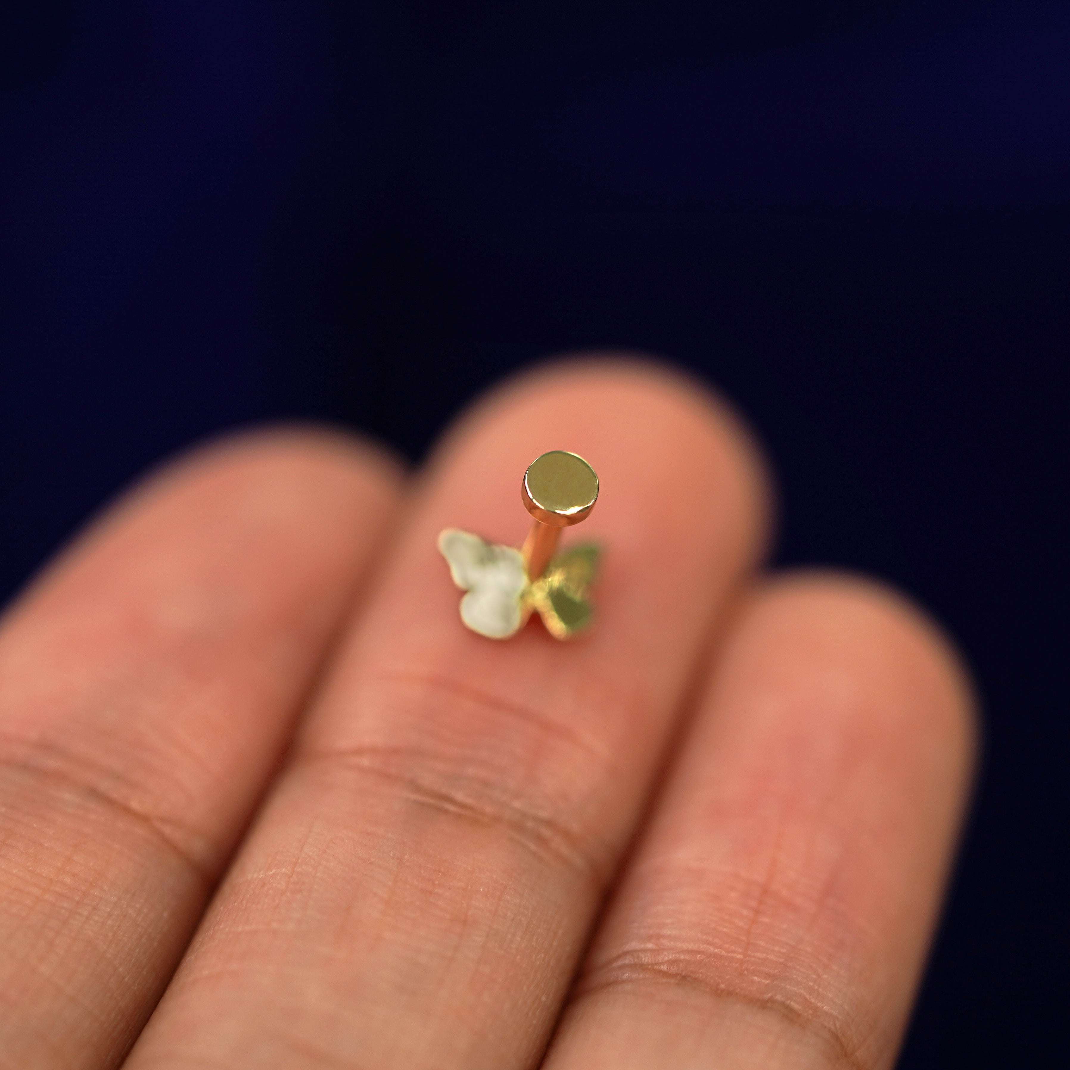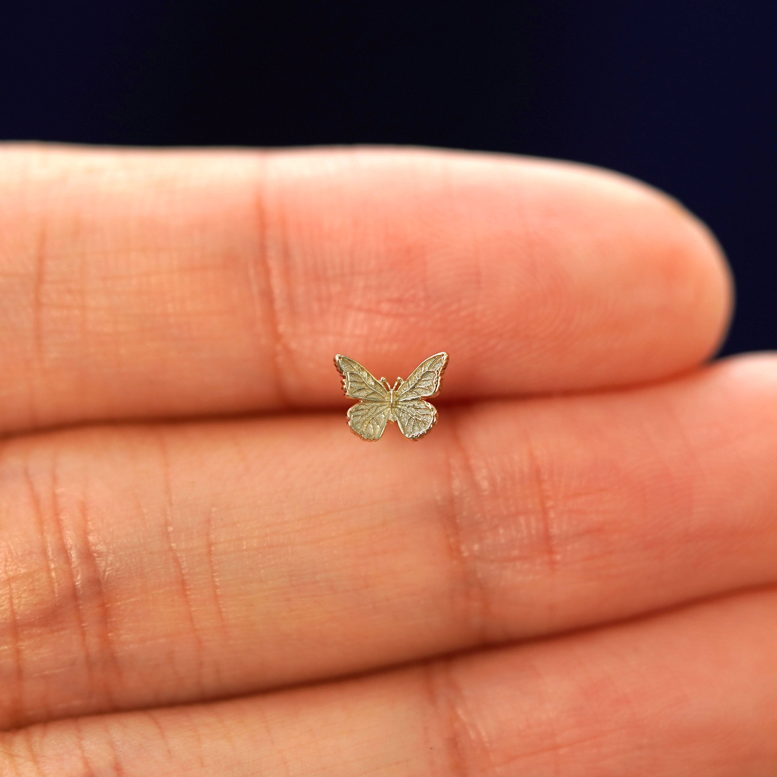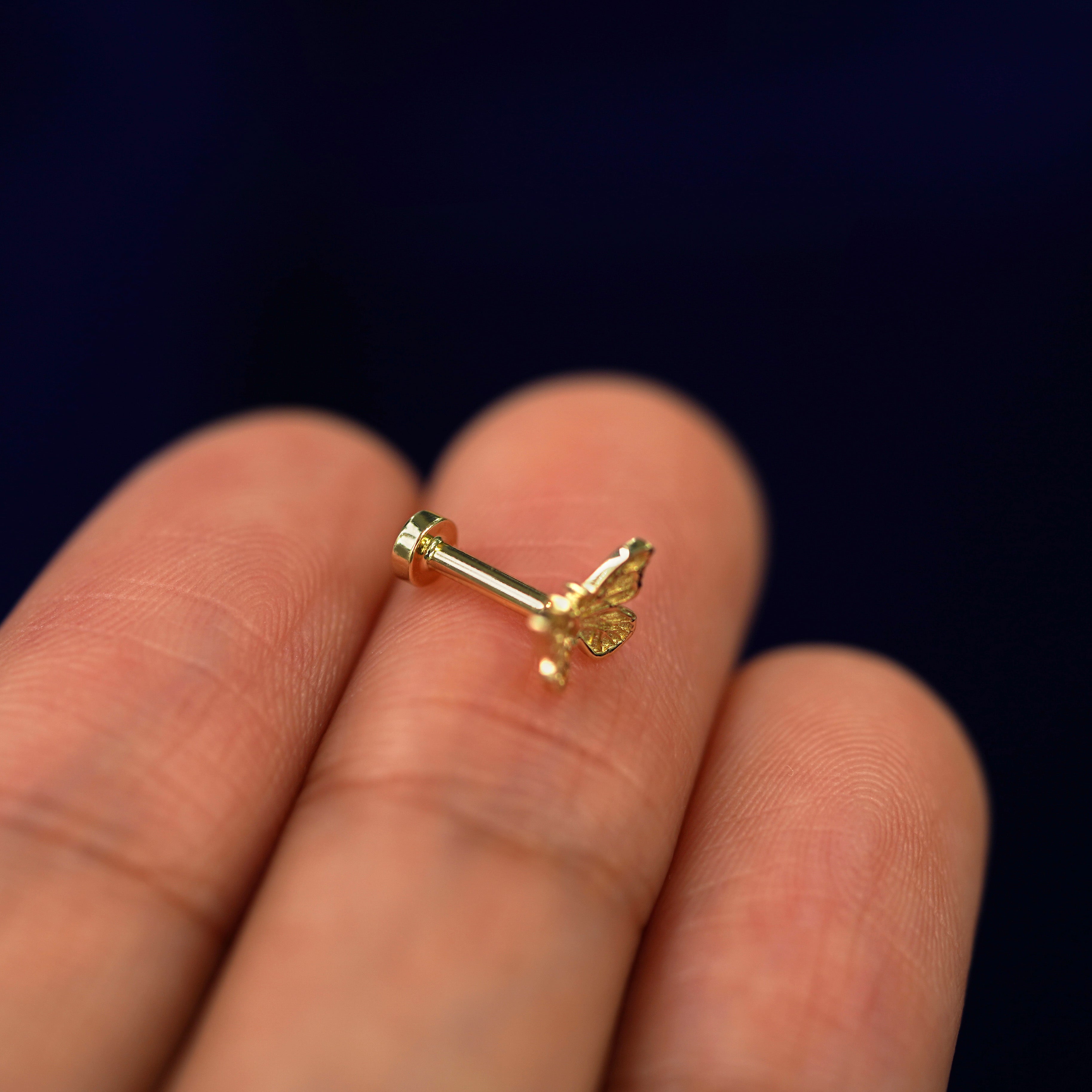 This tiny butterfly is a chic solid 14k gold threadless stud that’s perfect for lobe or cartilage piercings. This mini butterfly flatback earring features intricate detailing that makes it really stand out. Our flatback backings are crafted only in 14k yellow gold to avoid sensitivity.