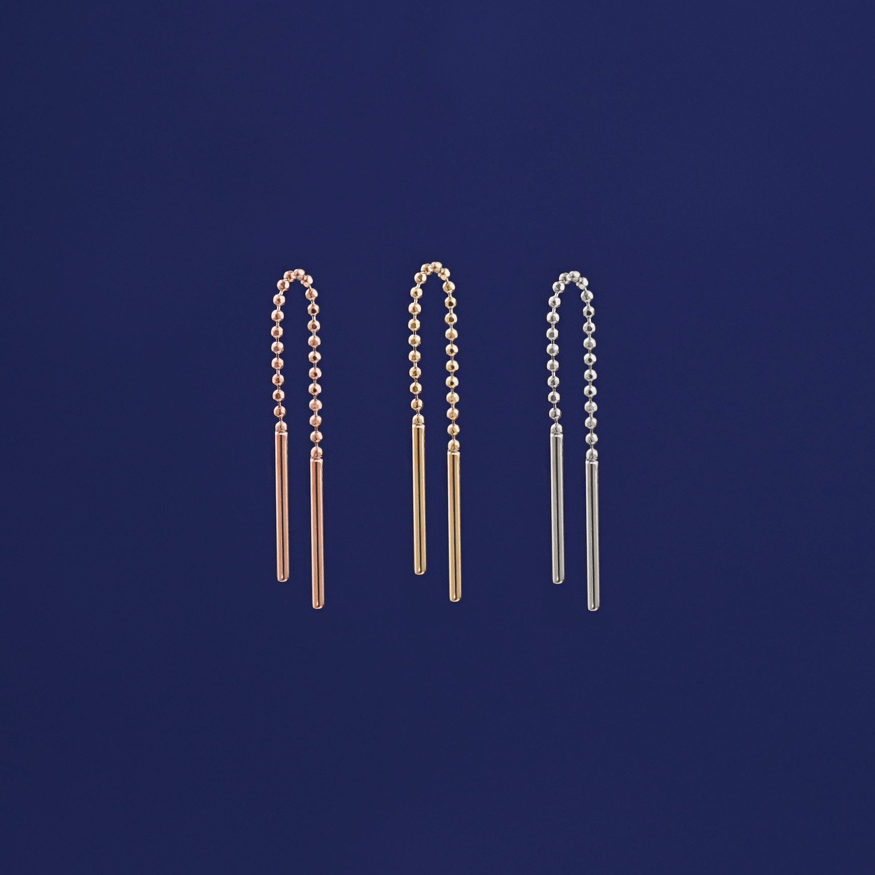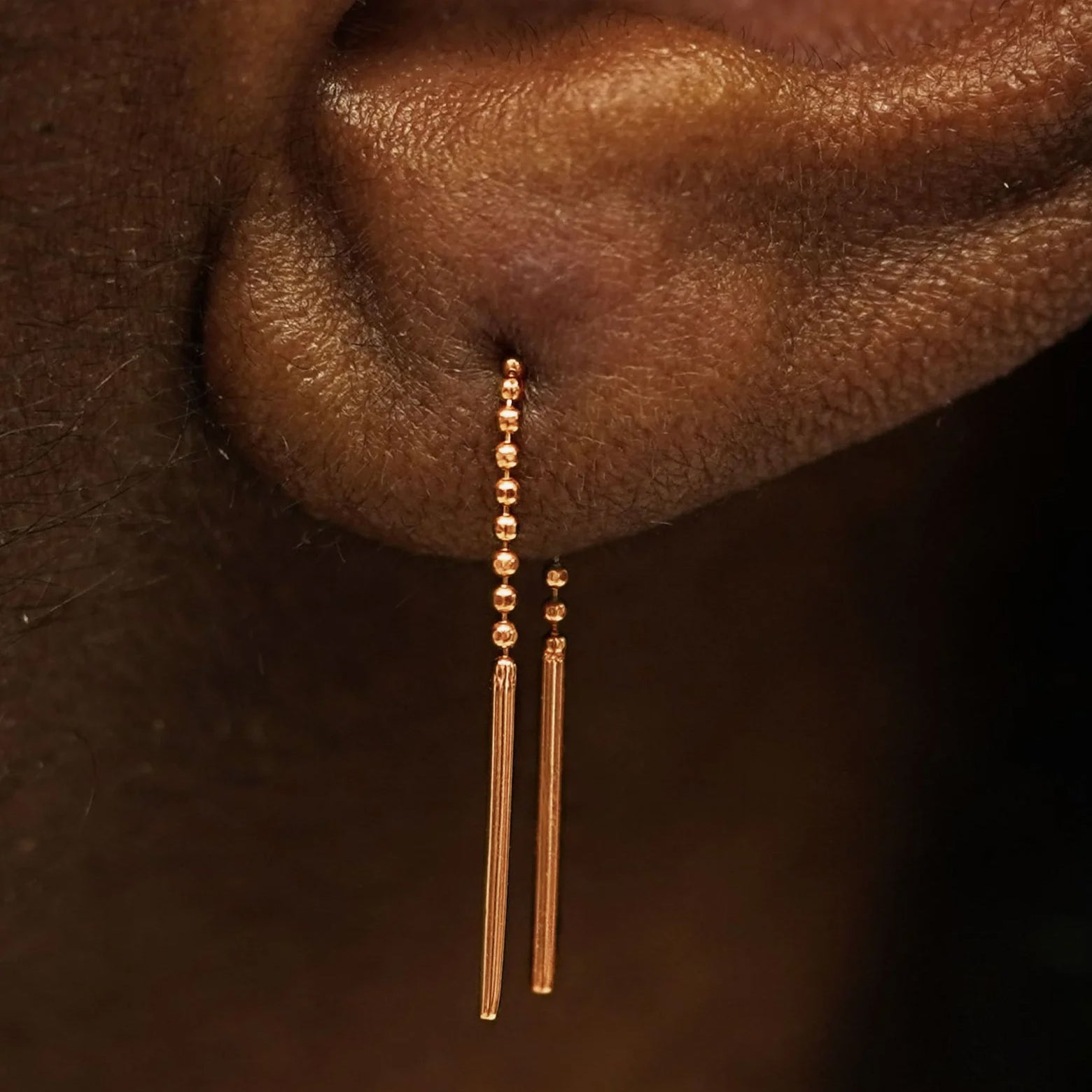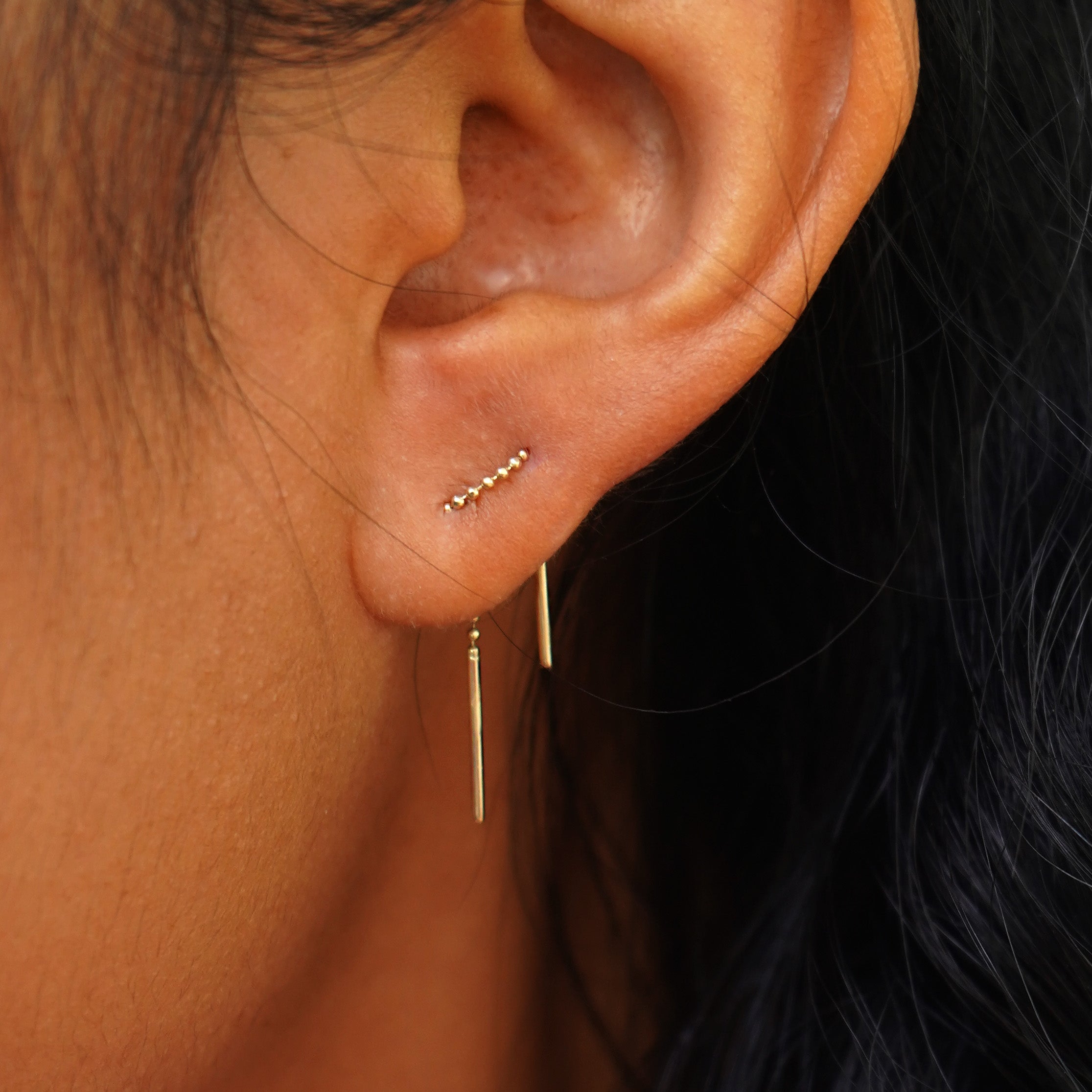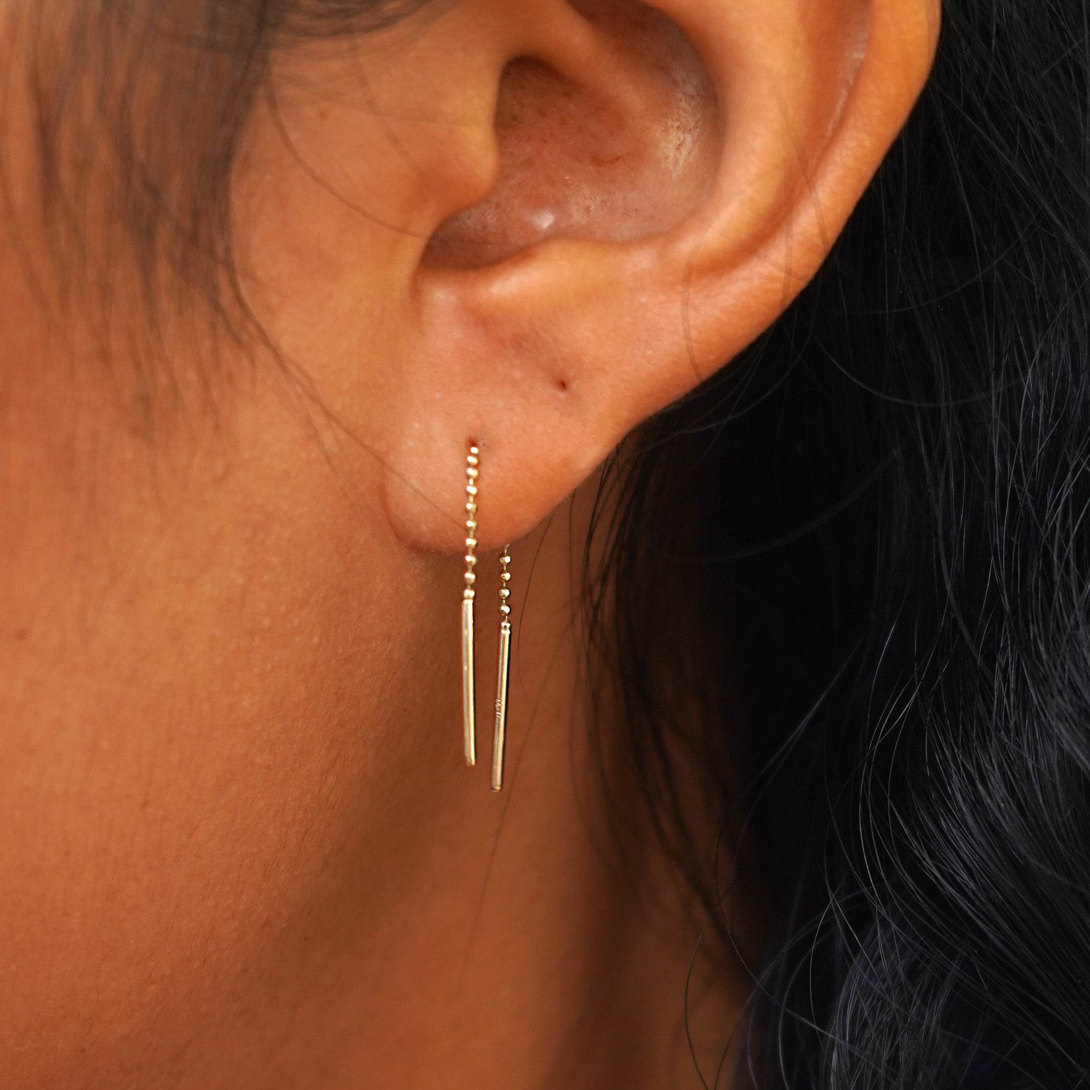 The Threader earring had a baby! This small threader chain earring is a cutie and is long enough to thread two (for some, even three!) piercings. Our 14 karat gold ear threader works in multiple combinations to create a look as unique as you are. The delicate diamond-cut bead chain is so soft you’ll forget it’s even in your ear! Only wear this sustainable gold beauty when you’re eating, sleeping or breathing.