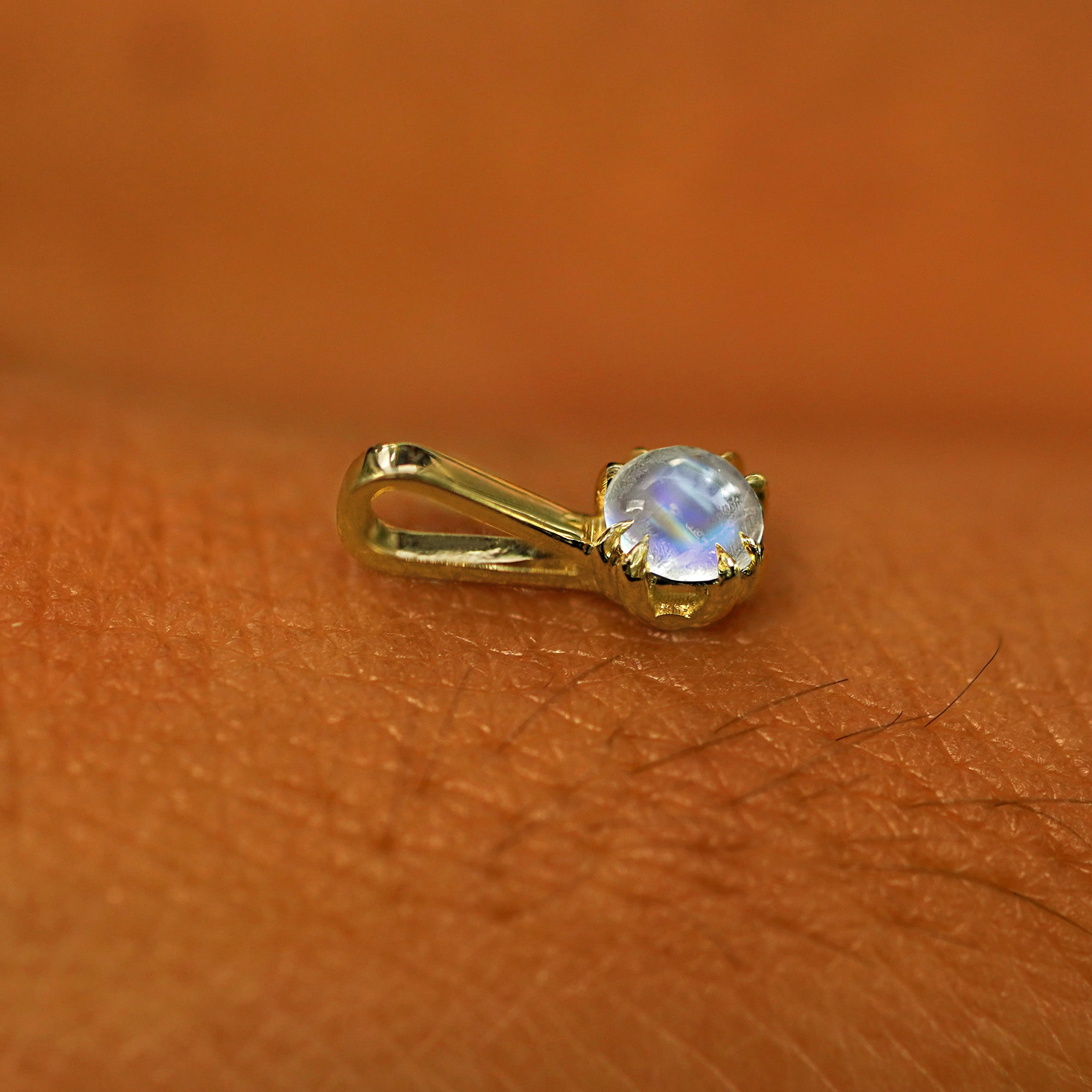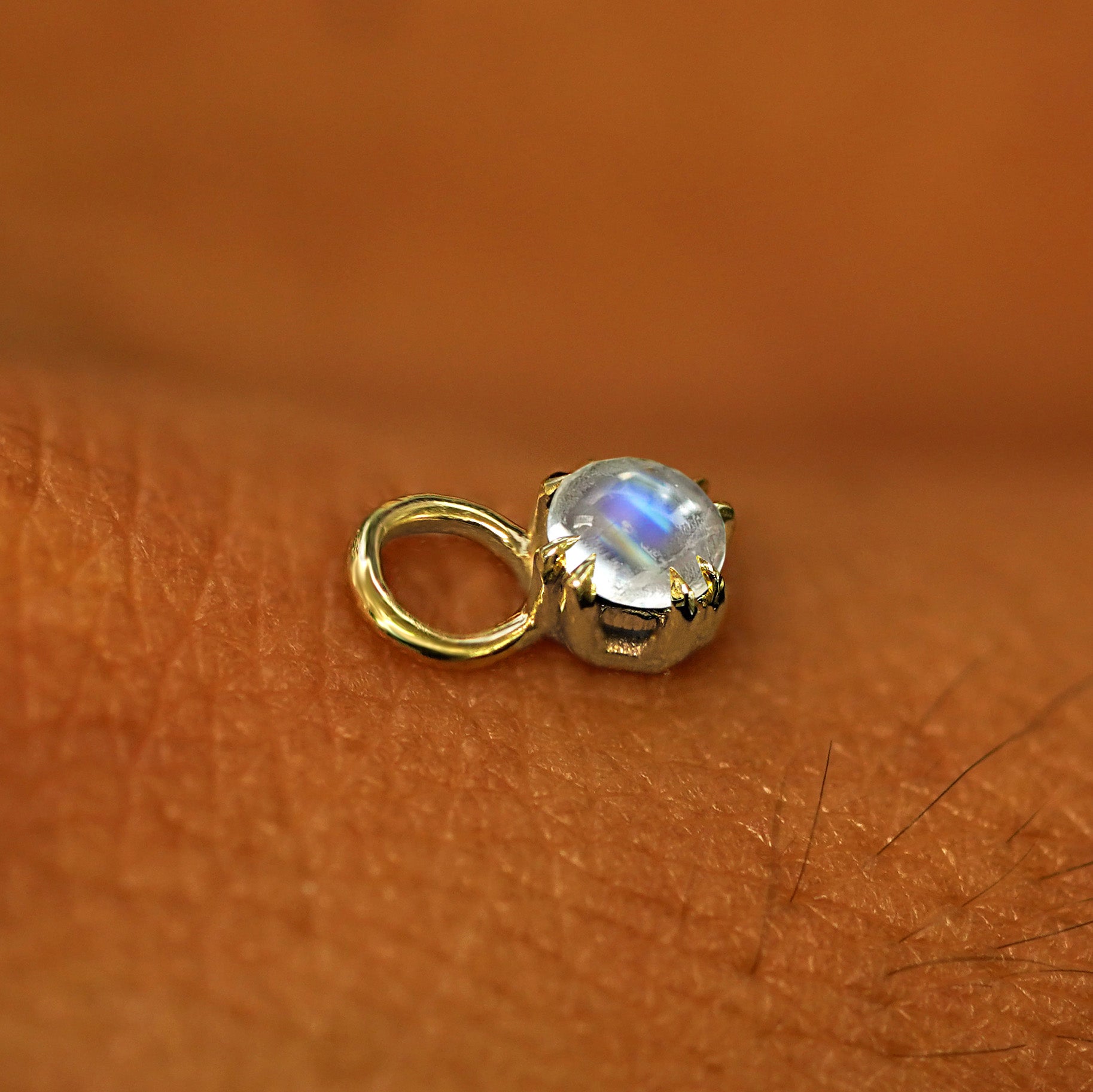 Like a tiny water droplet you can wear everywhere, this dainty Moonstone charm is truly beautiful. This piece of June birthstone jewelry makes a great little addition to your chain, bracelet or hoop earrings. Wear our gemstone charms as layered pendant necklaces to add bold style and color to your look.