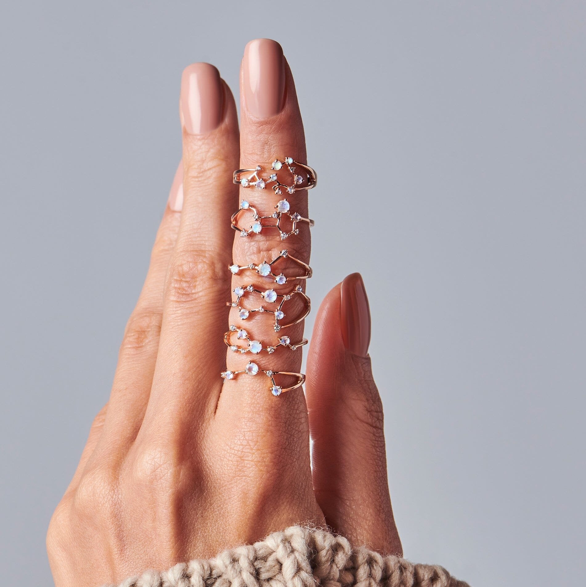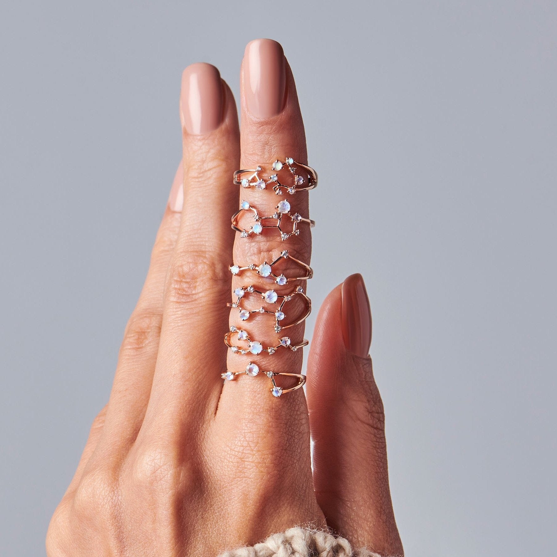 Introducing our Cancer Zodiac Constellation Ring adorned with Moonstones. Moonstone gems soothe emotional instability and stress by balancing emotions, while bringing enhanced intuition to the wearer. For the nurturing and empathetic Cancer, this ring will enhance your emotional intelligence and intuition, helping navigate your emotions.