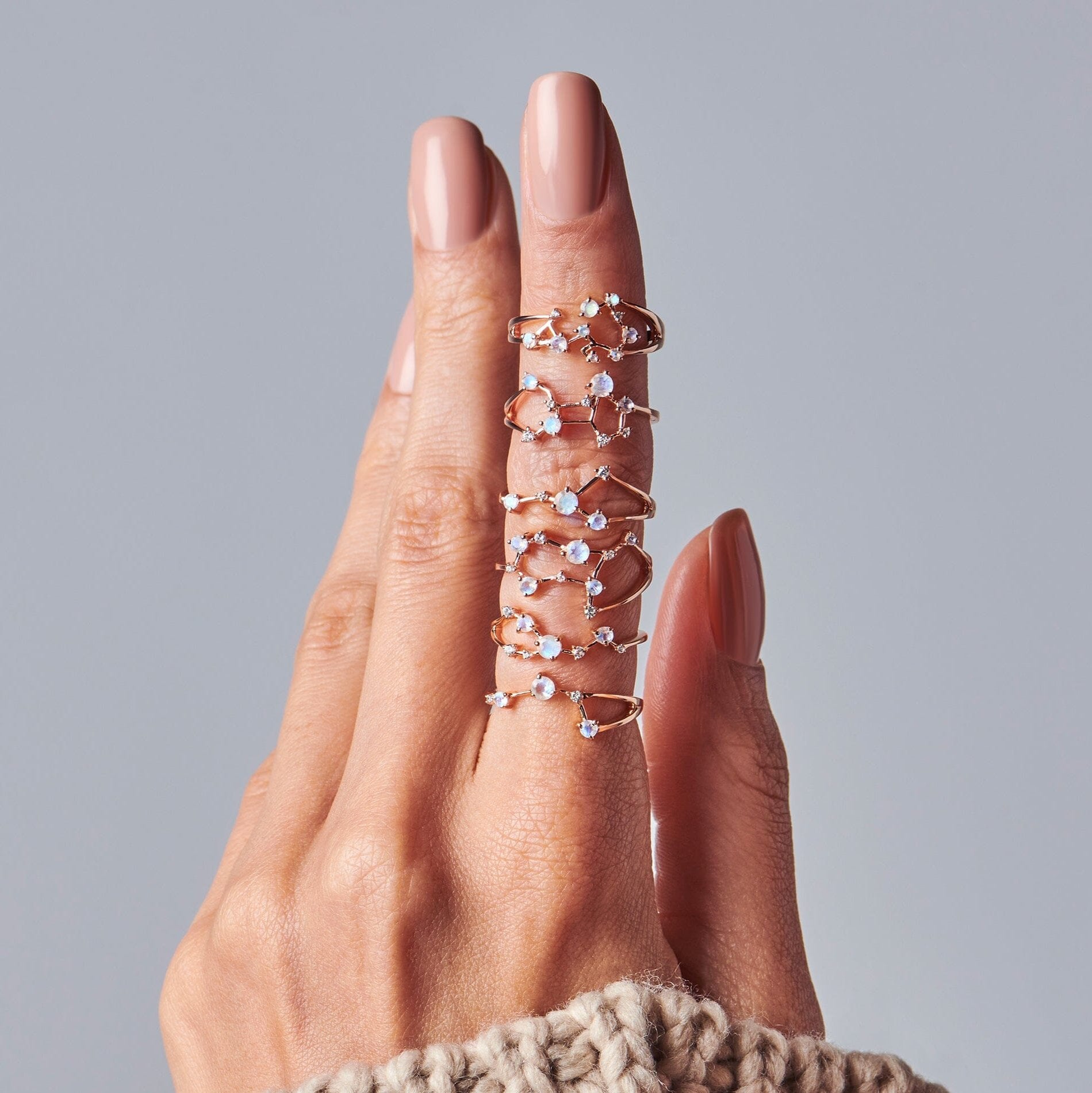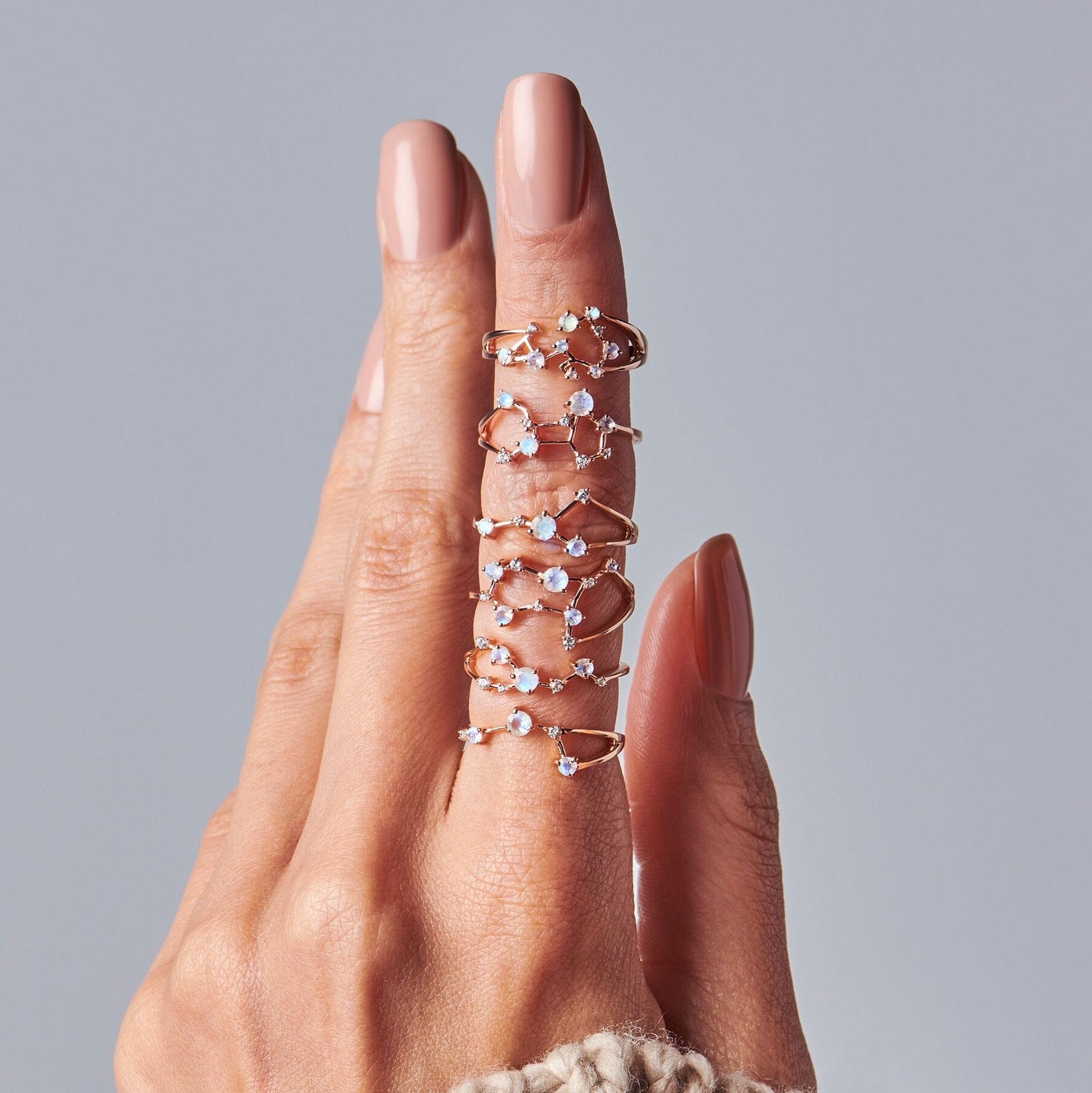 Introducing our Taurus Zodiac Constellation Ring with Moonstones. Moonstone gems soothe emotional instability and stress by balancing emotions, while bringing enhanced intuition to the wearer. For the grounded and practical Taurus, this ring will enhance your connection to your intuition, helping to make decisions with emotional stability and clarity.