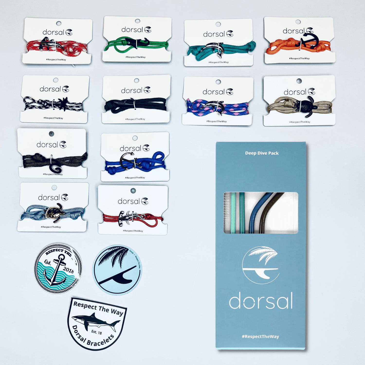 The Dorsal Mystery Bundles are the perfect way to start growing your collection OR make the perfect gift. All bundles contain an assortment of Dorsal products that may be limited edition, unreleased, current, or past products. For every purchase, one pound of plastic is removed from the ocean.