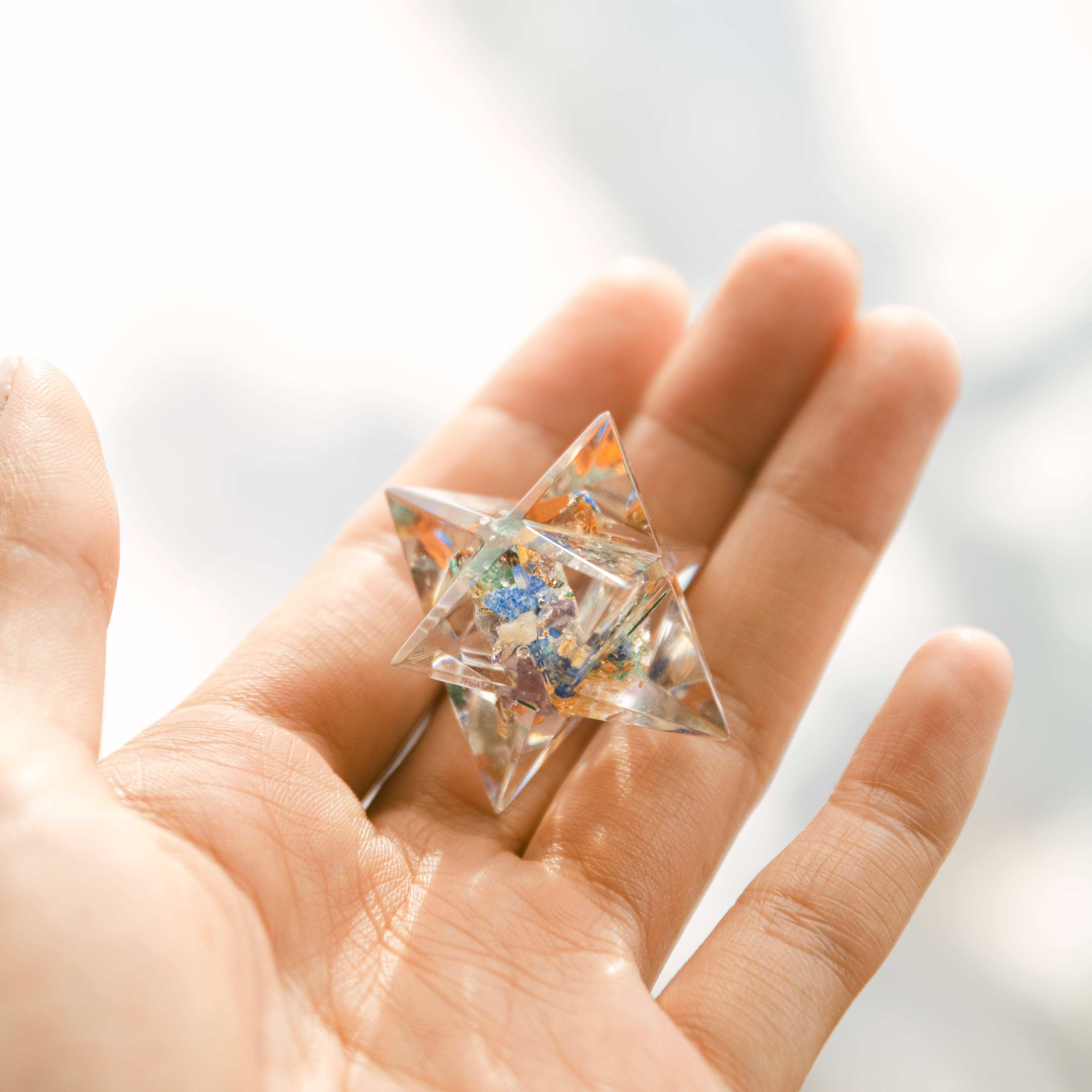 - Resin Merkaba filled with genuine gemstones pieces and a copper coil