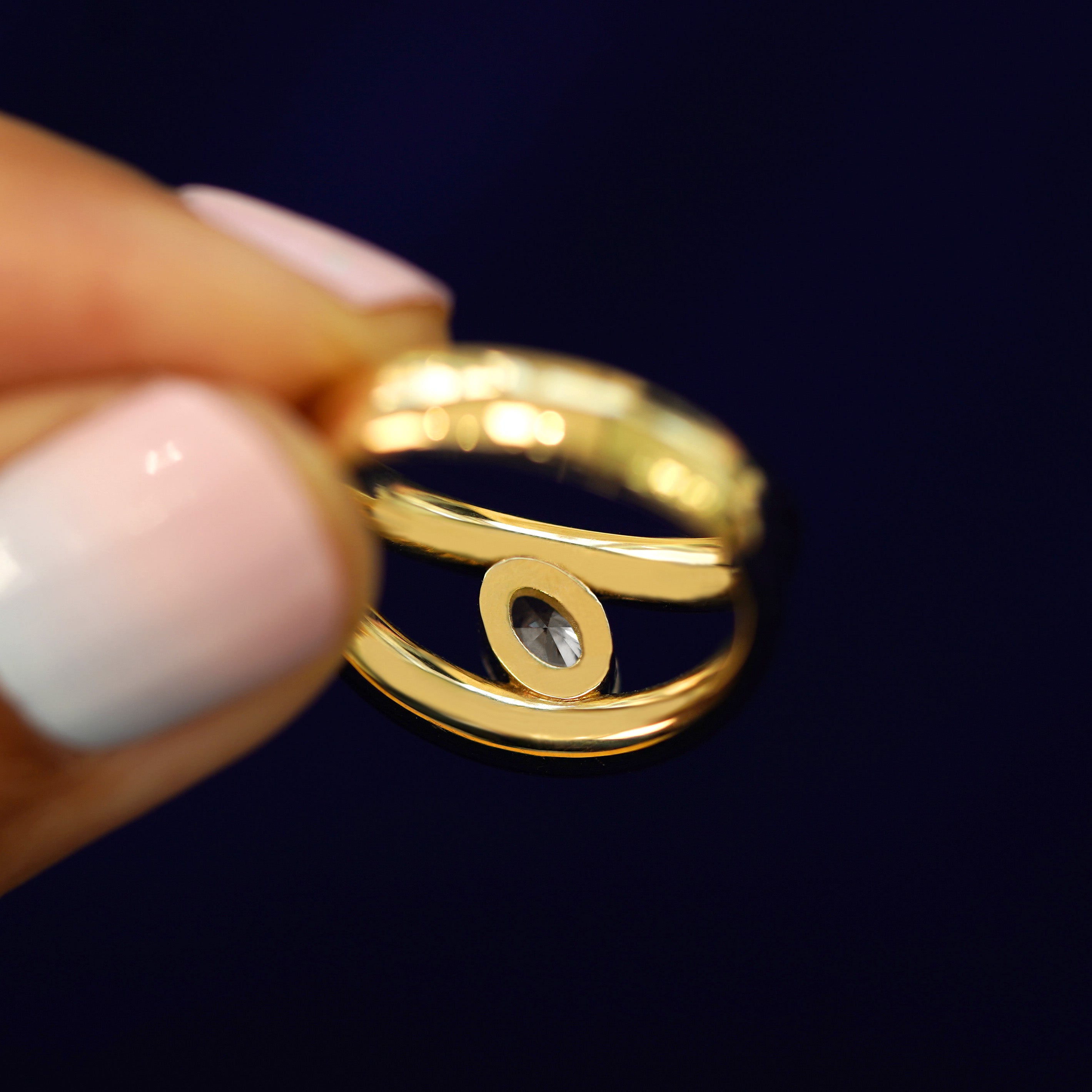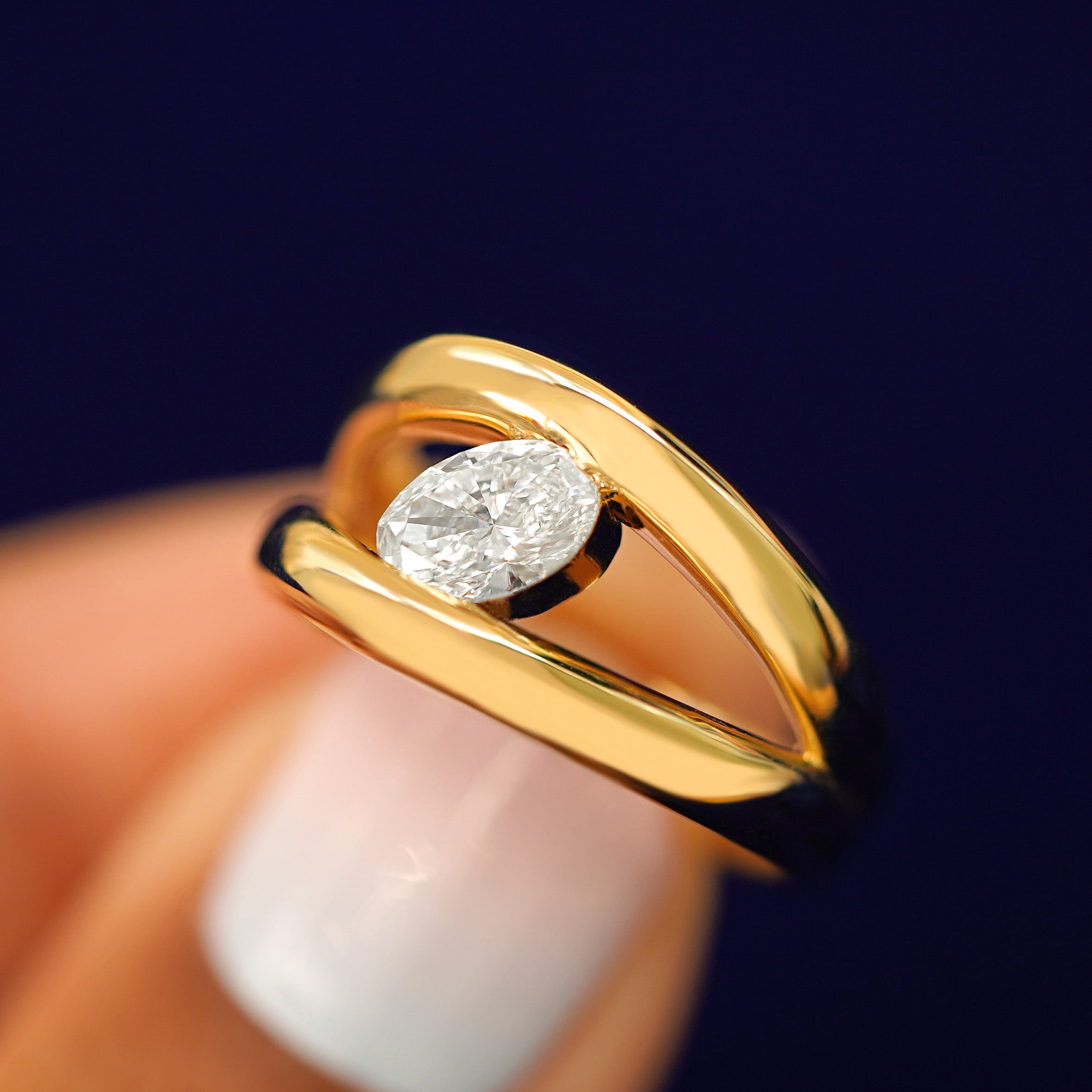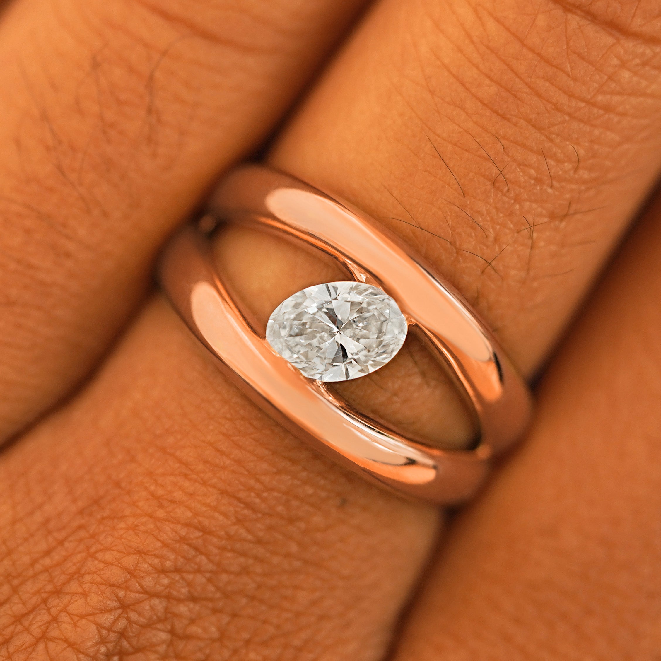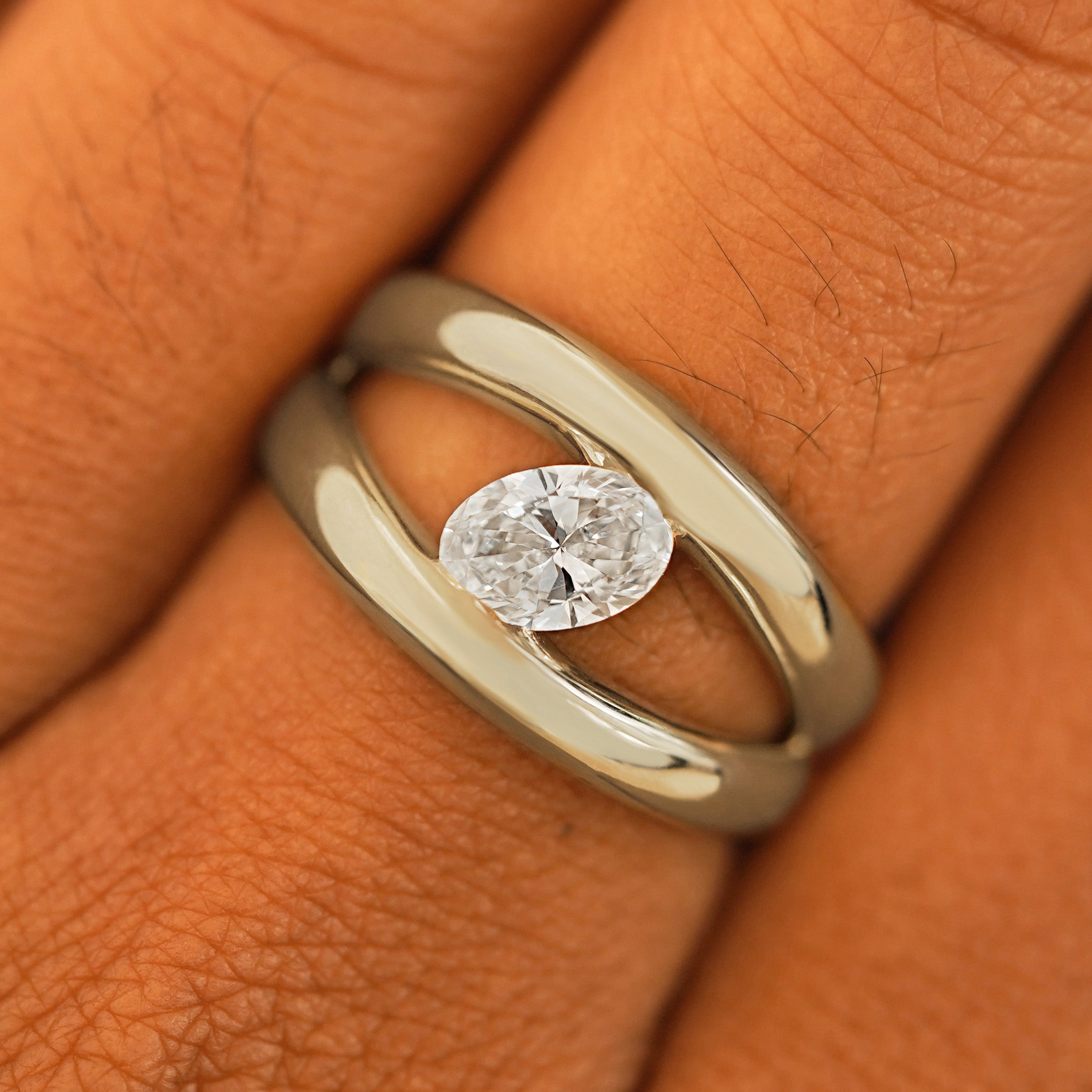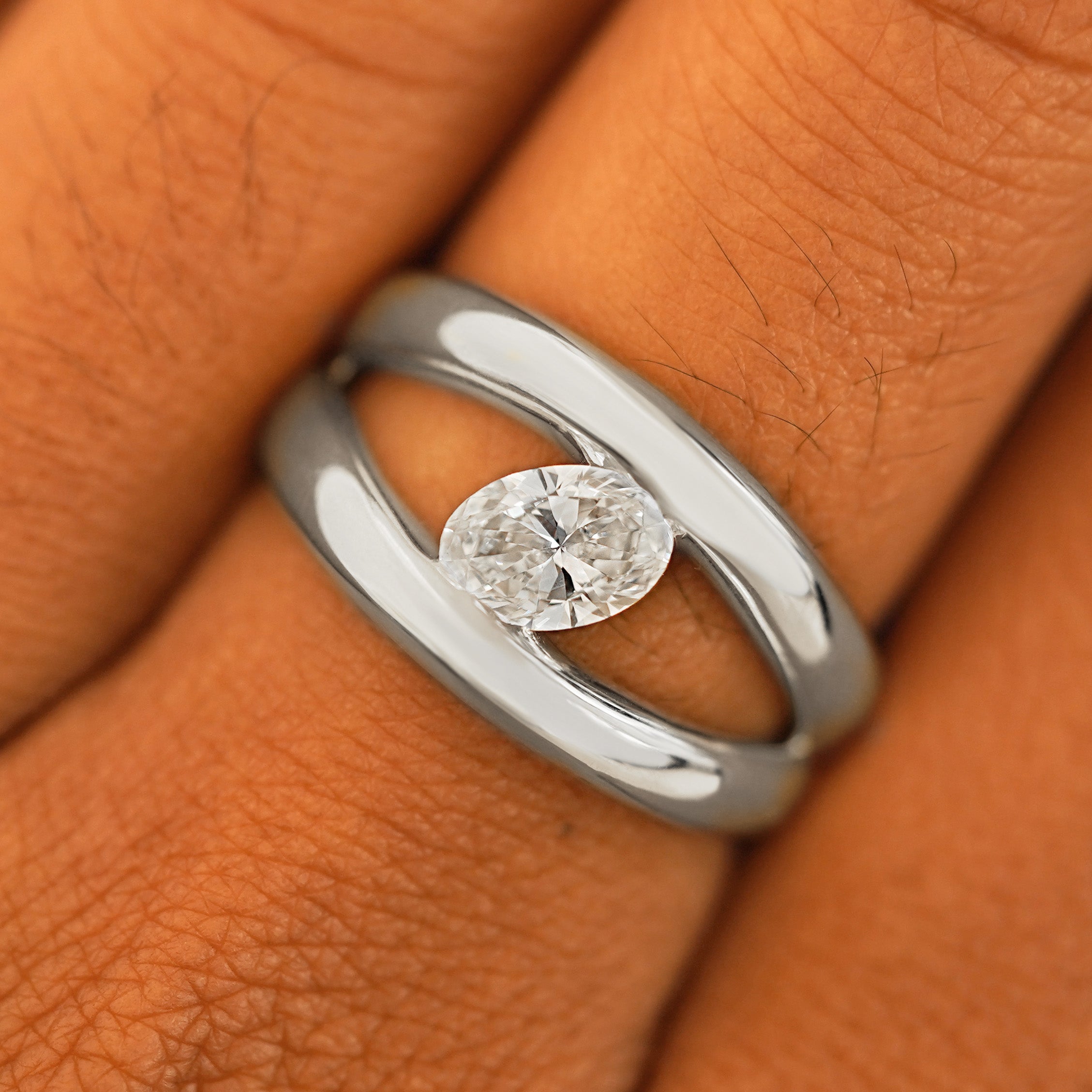 Big, bold, and brilliantly sparkling, this stunning piece is the perfect engagement ring or statement ring. A beautiful oval lab-crated diamond is tension set between two puffy bands in a split shank design that taper together so the ring feels comfortable when you close your hand. Crafted from recycled 950 platinum or 14k gold this piece is the ultimate solitaire diamond ring.