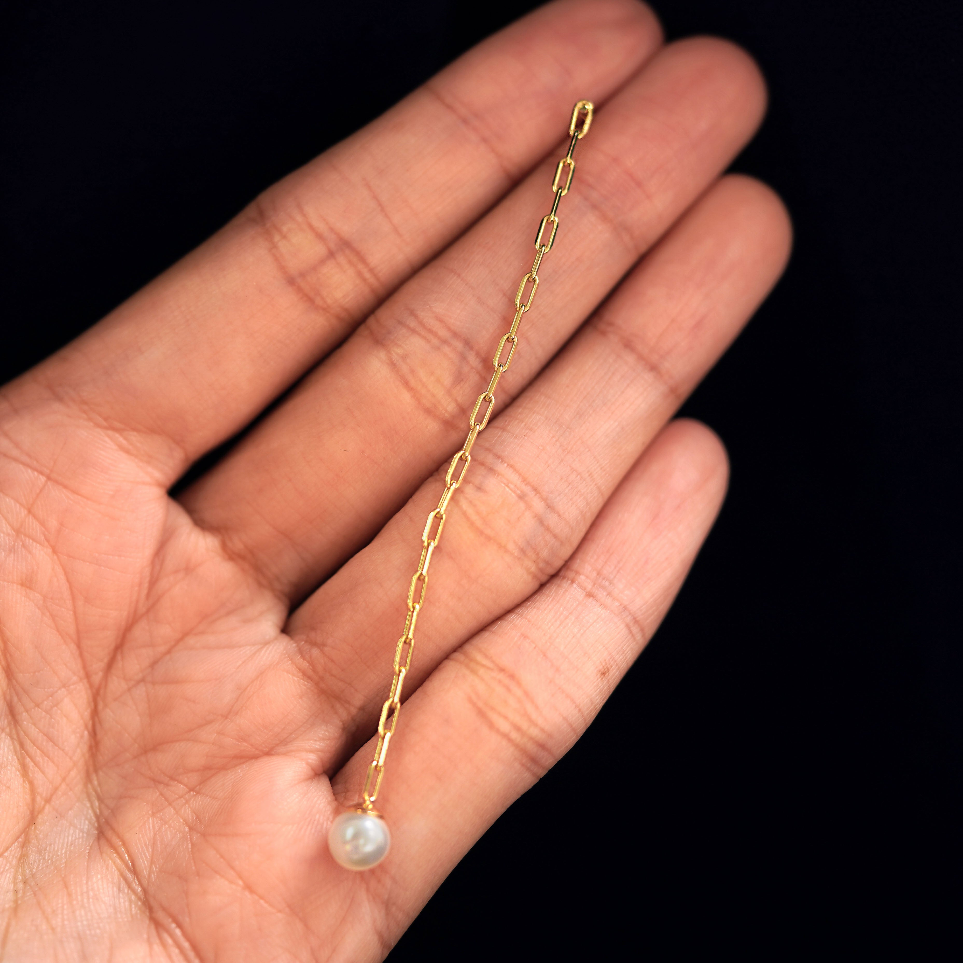 It’s okay to be a little shellfish when it comes to treating yourself with our elegant white freshwater pearl jewelry. These drop earrings showcase a shining 14 karat sustainable gold chain that perfectly accentuate the round pearls. The long dangle earring secures with a solid gold screw backing.