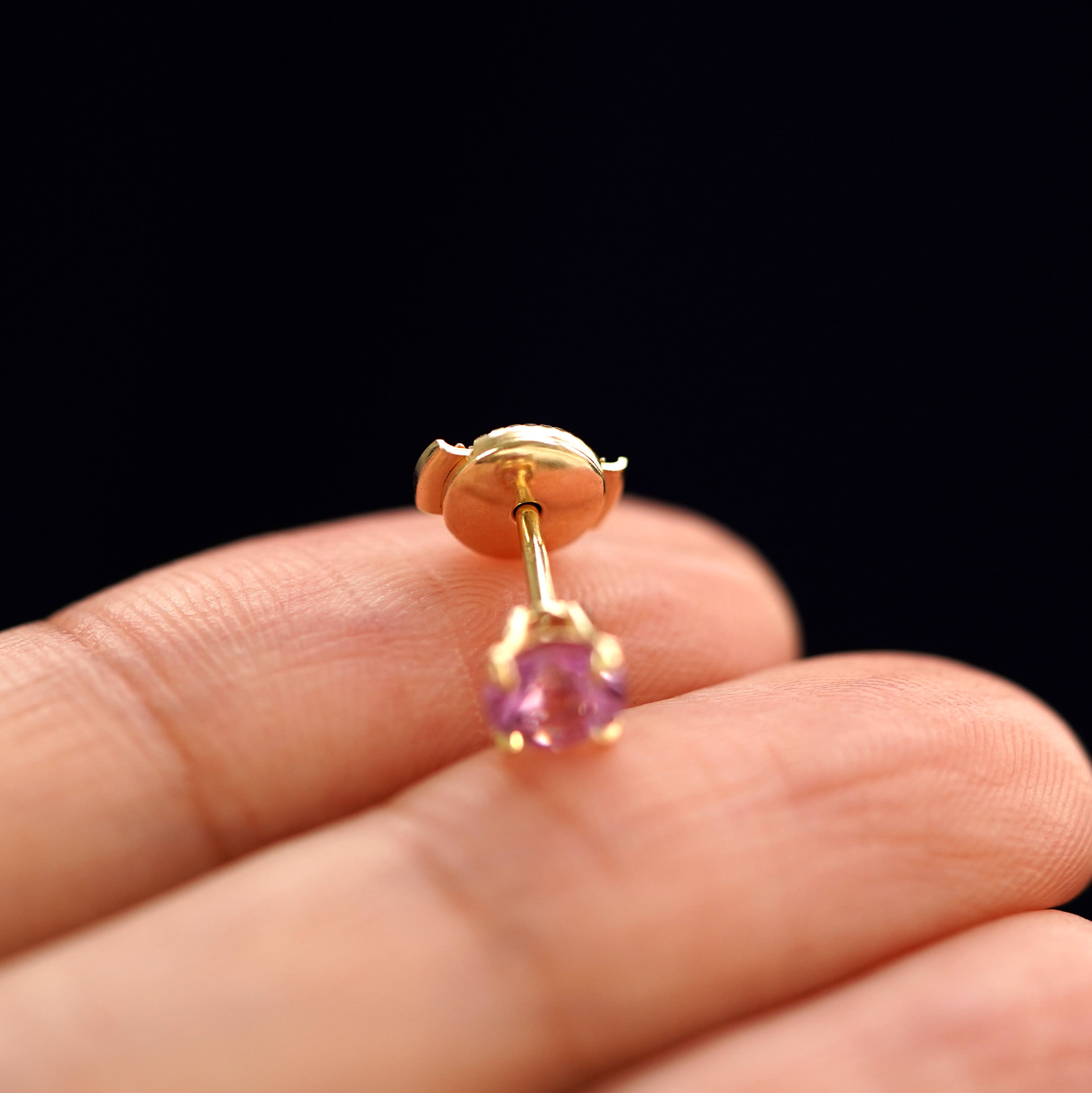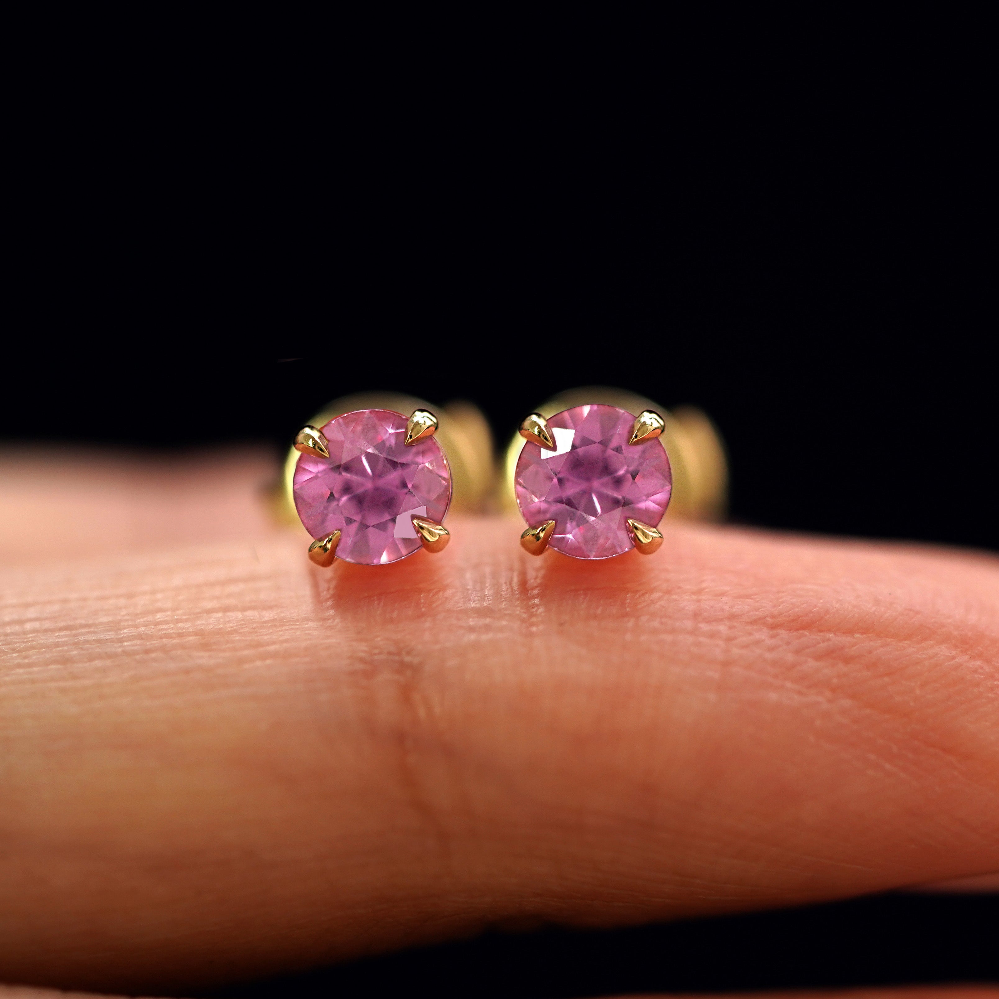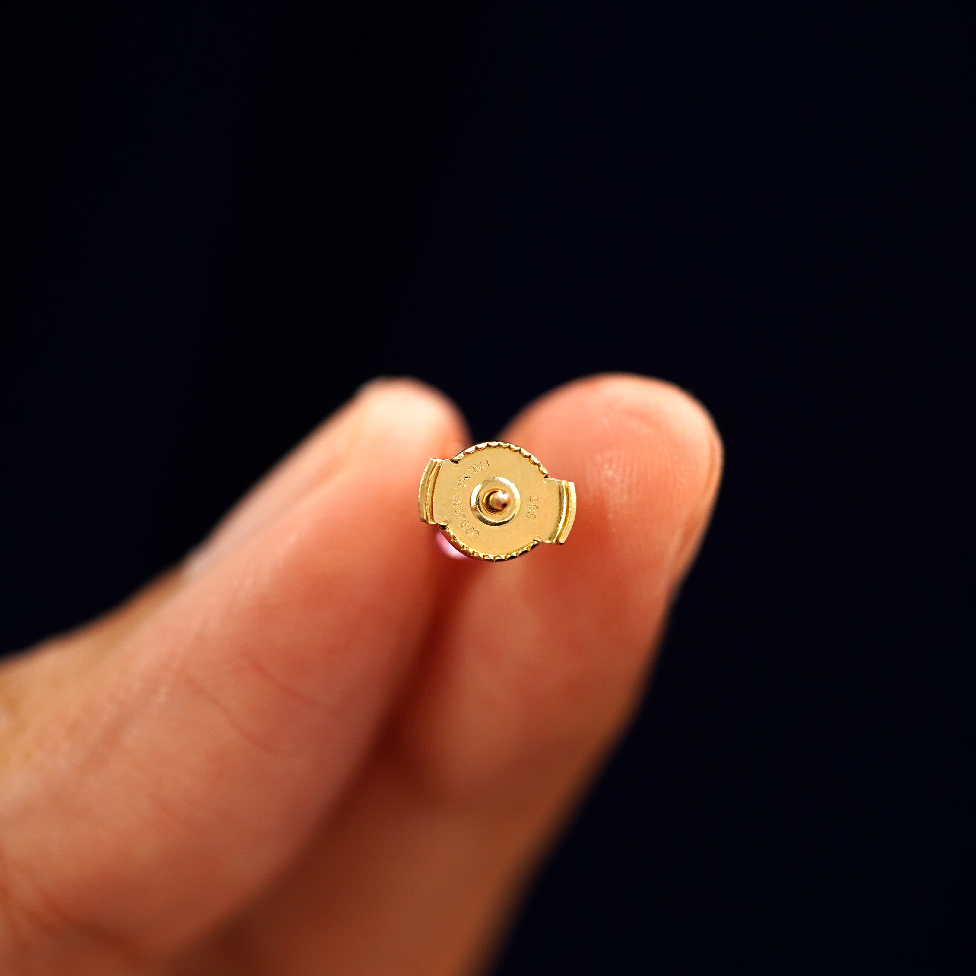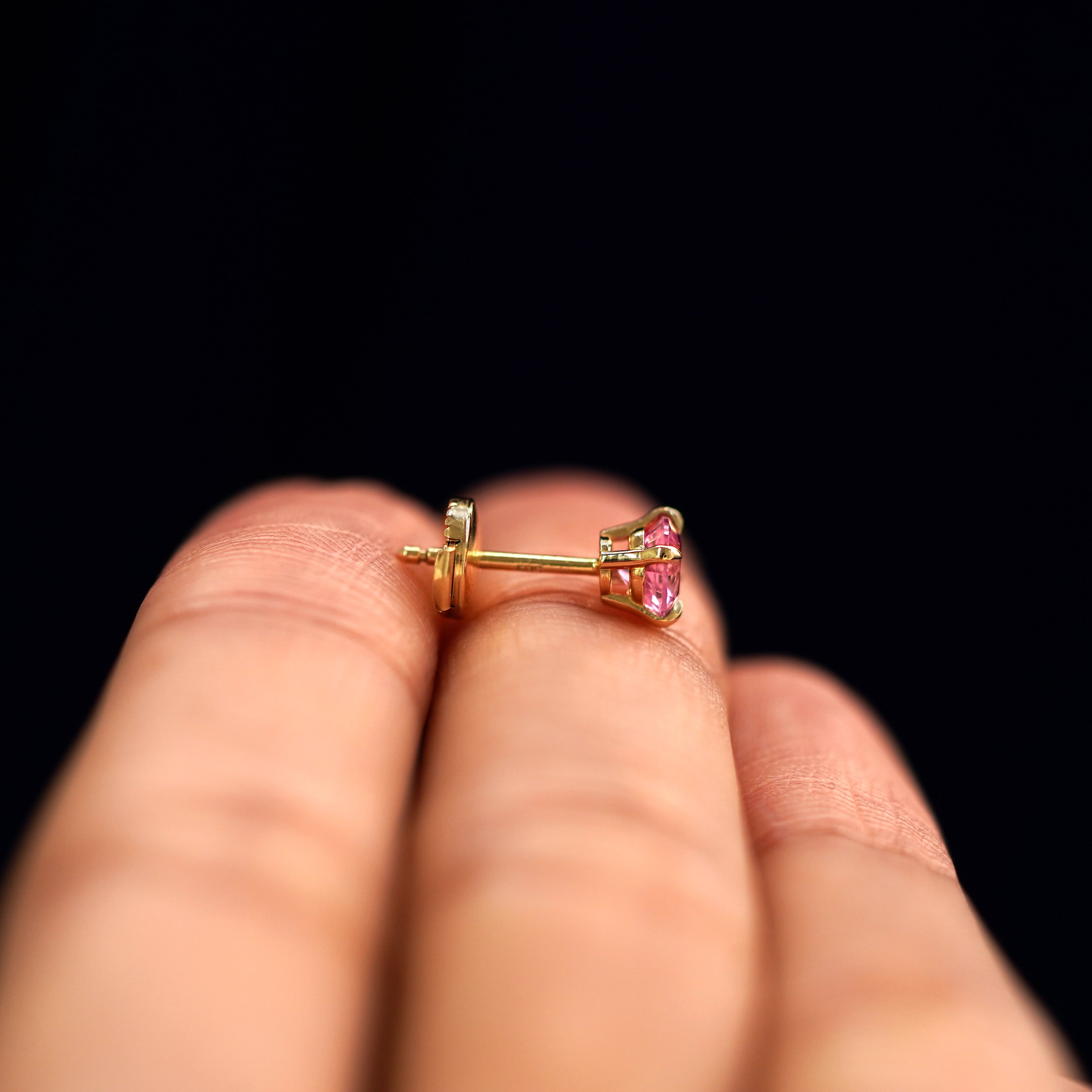 Glamorous gold and glittering stones, these pink sapphire studs are everything. Made with recycled 14k solid gold, our 5mm gemstone studs have beauty and heart. Better yet, our large and easy-to-hold pressure lock backings hang on tight so you can always feel secure with these beauties on.