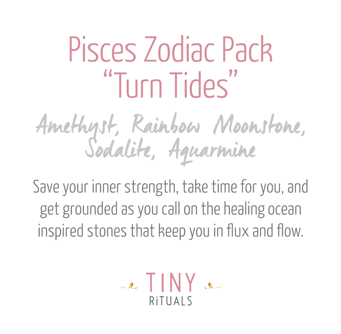 Dive right into your deepest dreams with the Pisces Zodiac Pack. The shimmering fish in swirling waters are ruled by Neptune, the Roman God of the Sea who represents all the threads of luminous magic, illusion, and imagination. Turning to these ever-present crystals, this pack calls on the power of Amethyst, Sodalite, Aquamarine and Rainbow Moonstone to light the way.