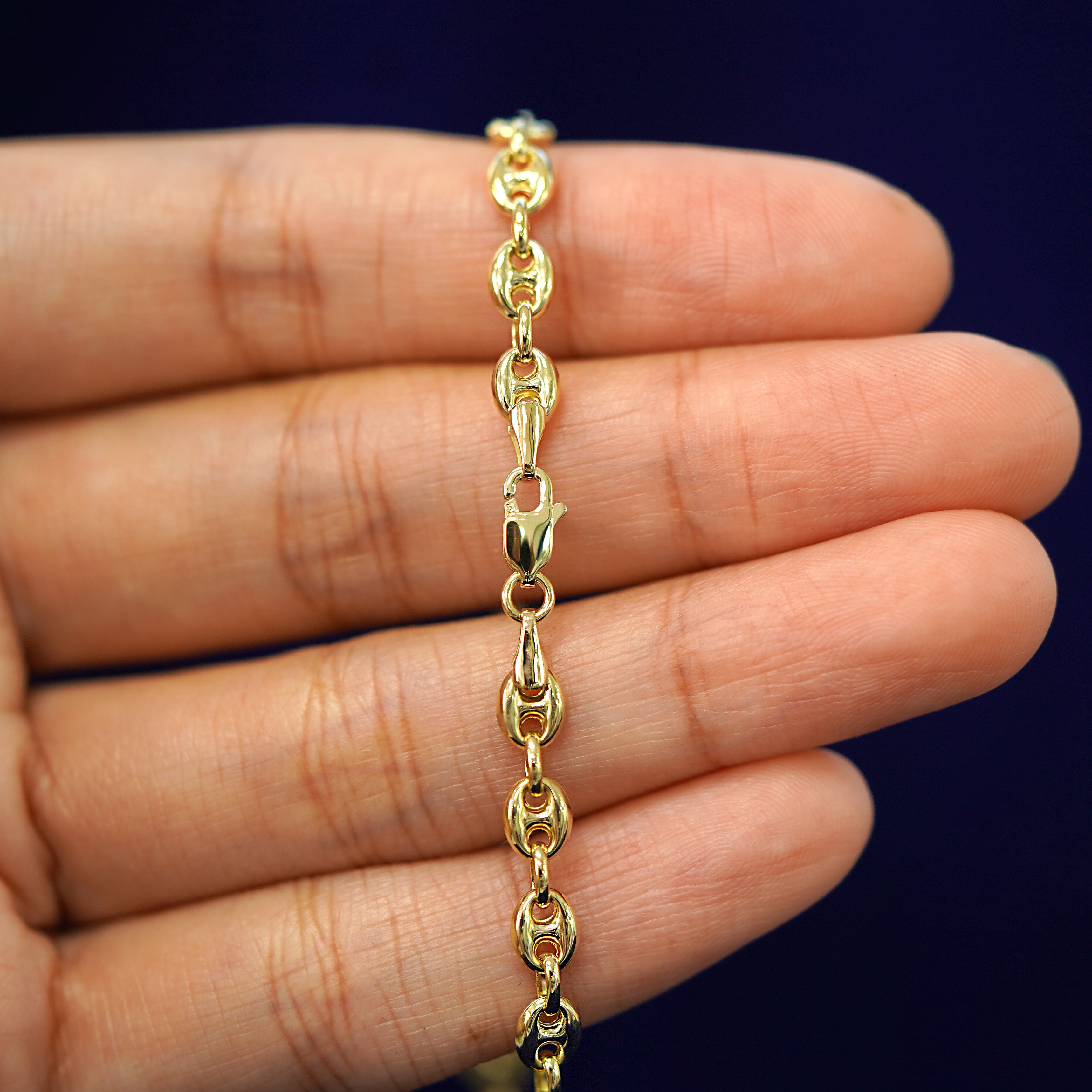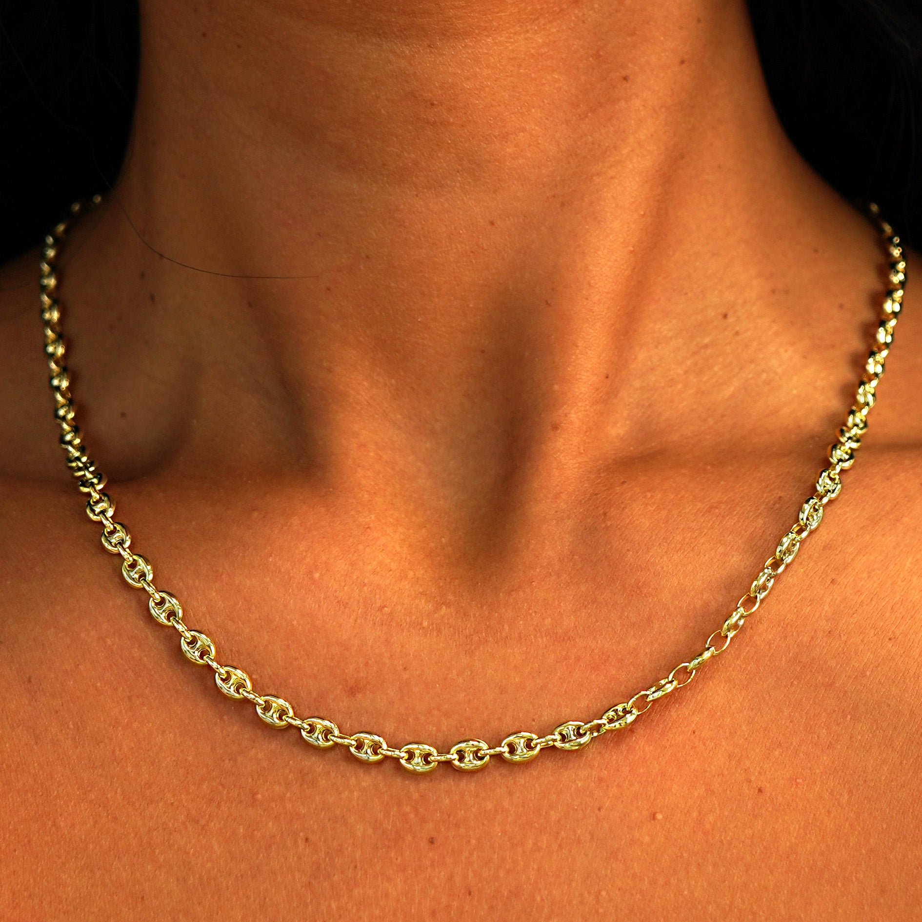A standout stunner, this puffy mariner chain is the perfect statement piece. This chain necklace features puffed oval link with two small holes connected to each other with thick round links. This chain is made from 14k gold with thick links that won't bend or lose their shape. Durable and comfortable, this necklace secures with a lobster claw clasp.