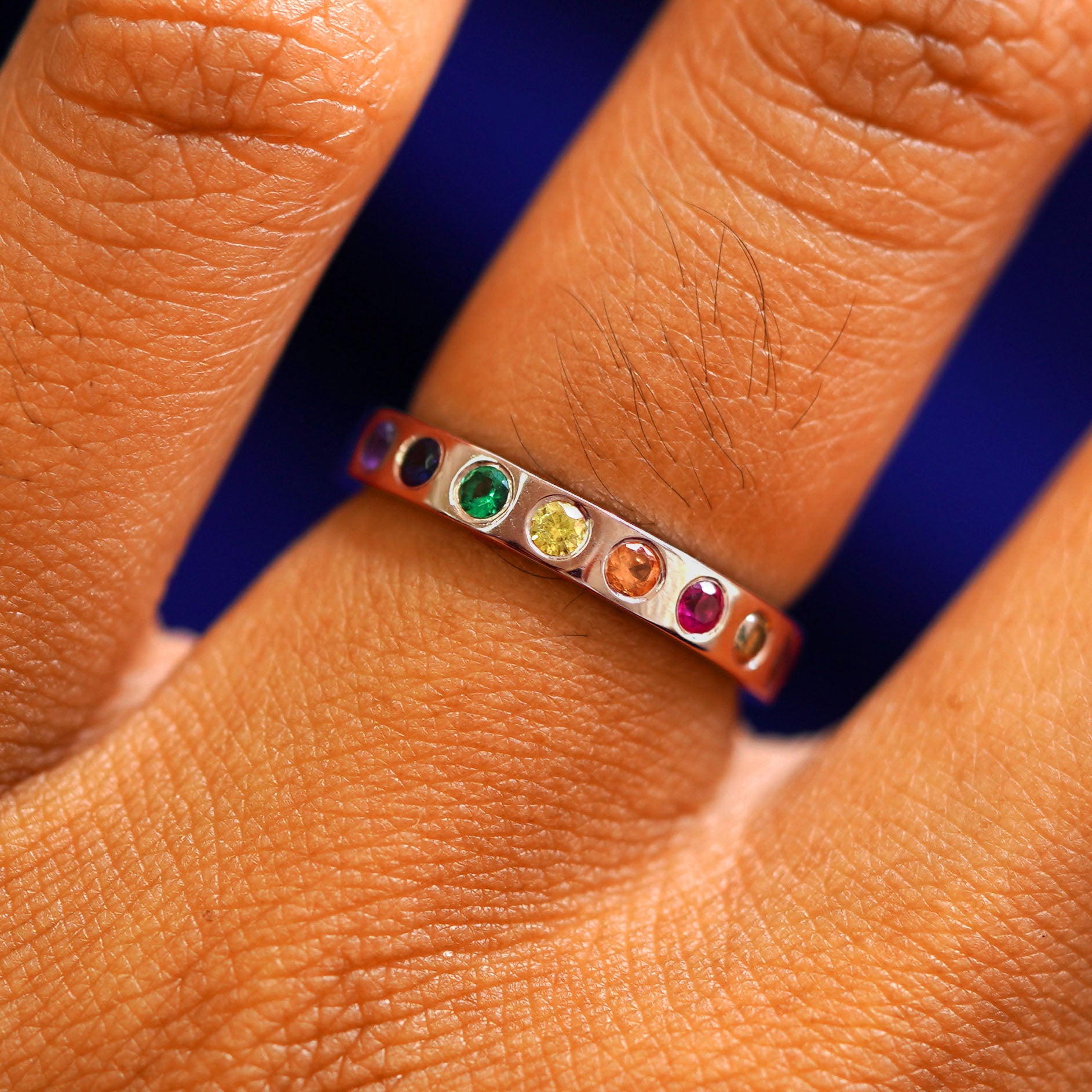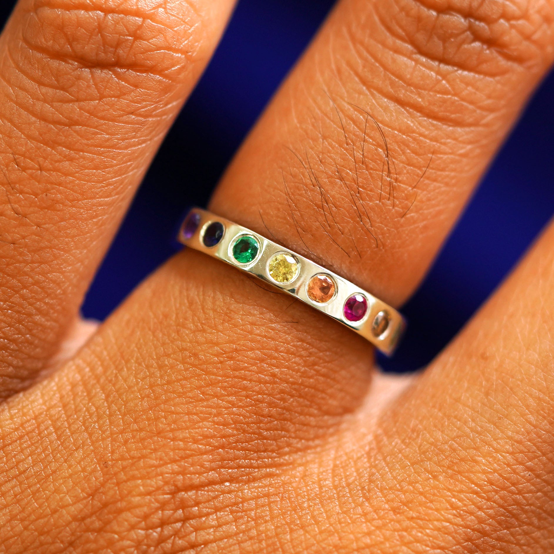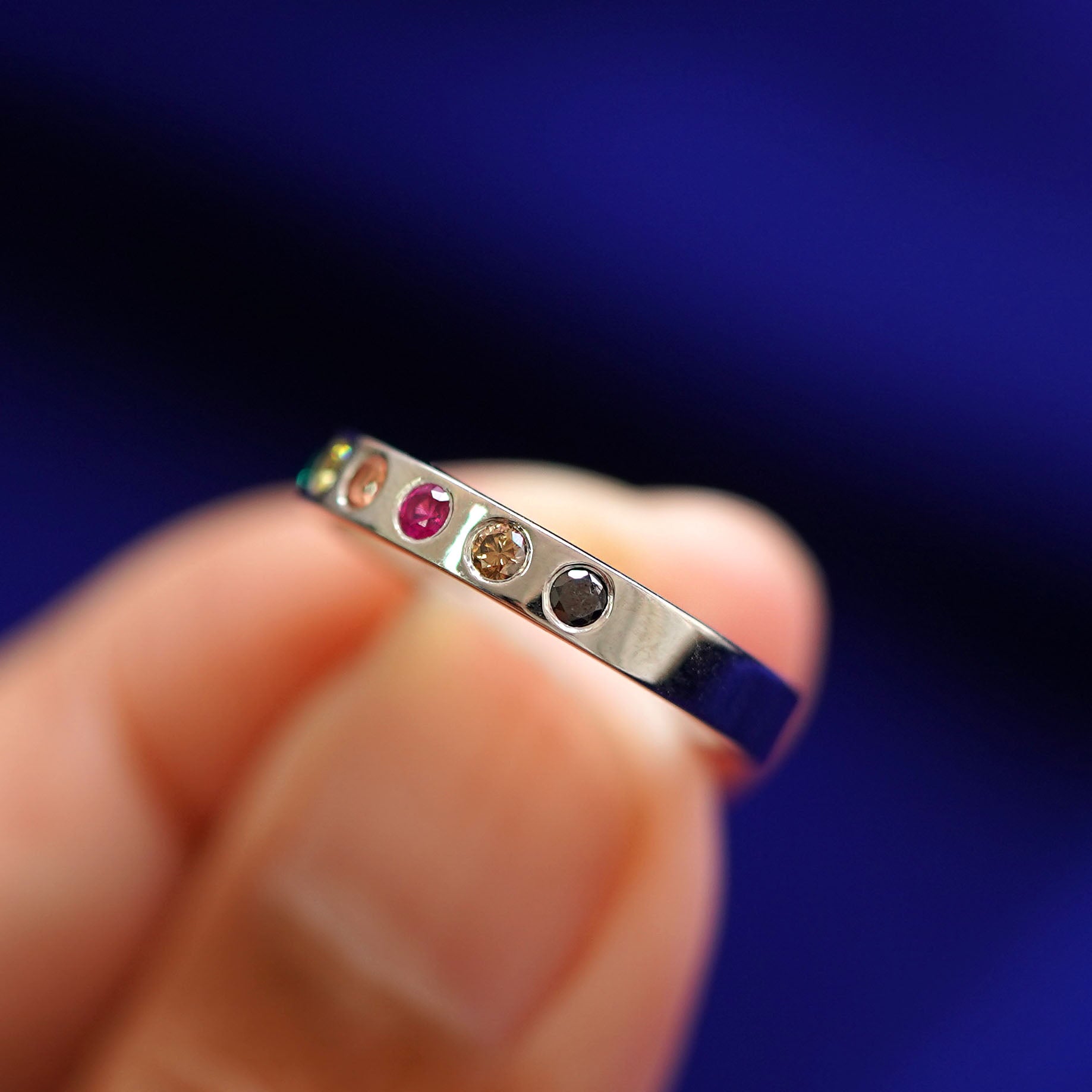 This Rainbow Band is a colorful beauty featuring a stunning Emerald, a gorgeous Ruby, Champagne and Black Diamonds, and Sapphire gemstones in multiple hues to create a sparkling rainbow flag. The sustainable 14k gold band is thin but still a heavy-duty comfort fit ring for effortless everyday wear.