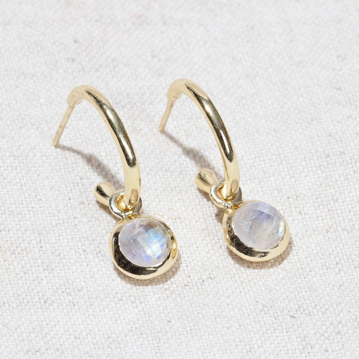 DescriptionKnown as the visionary stone, the Rainbow Moonstone is pure magic when adorned with these gold hoop earrings. Delicate and dreamy and flashing with fabulousness, these earrings dance with fire and ice, light and love and sweet soothing energy along with the spark of creation. There’s a lot to love about the Rainbow Moonstone - full of feminine energy, here to strengthen psychic powers, and known for bringing clear-headed clarity, this crystal is a powerful tool to have close by.