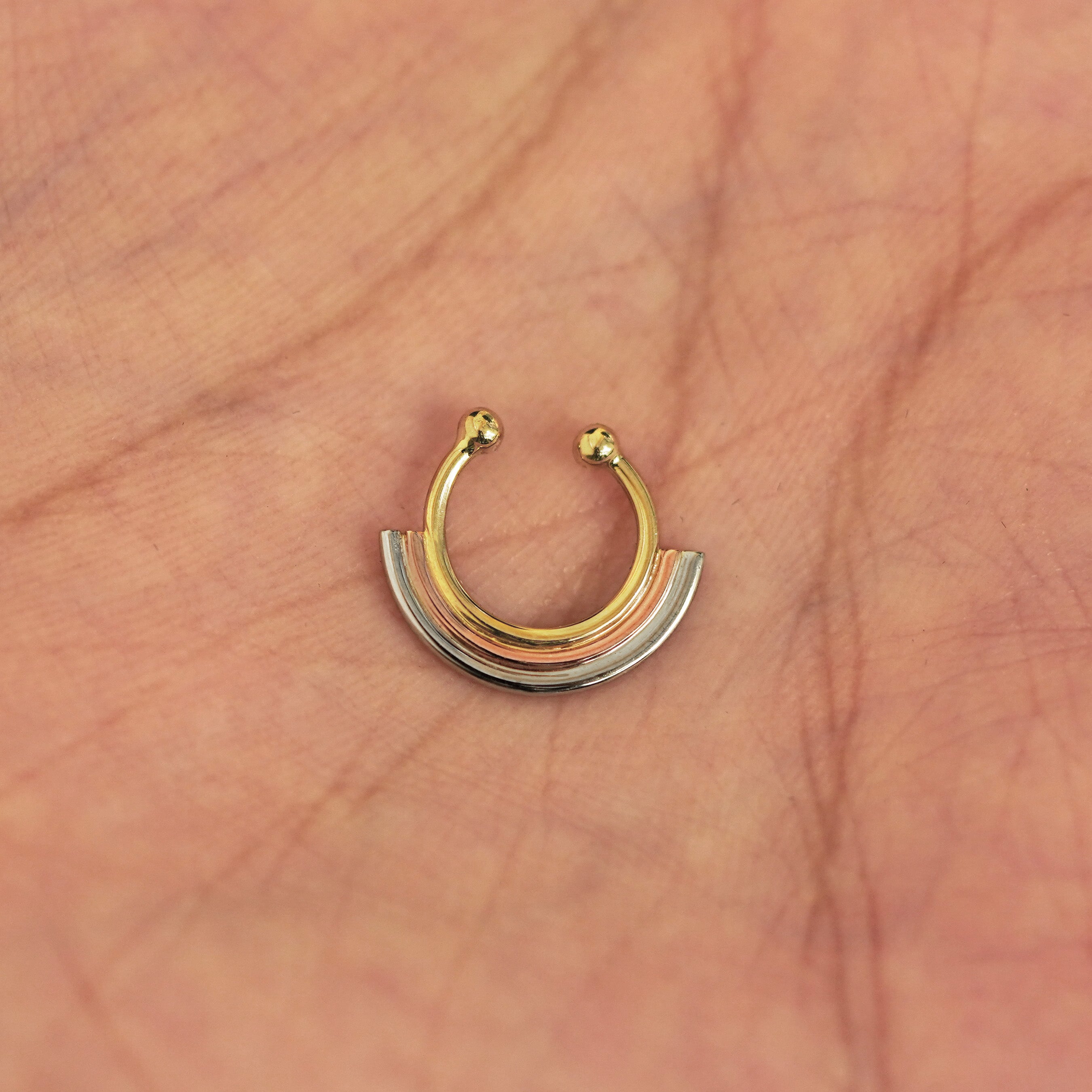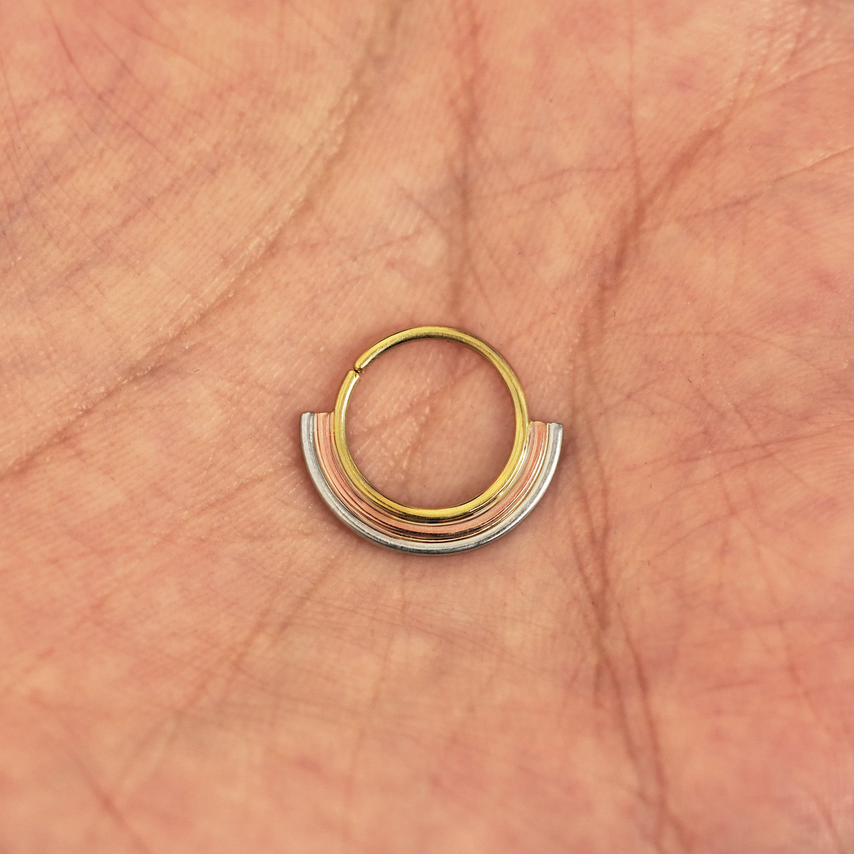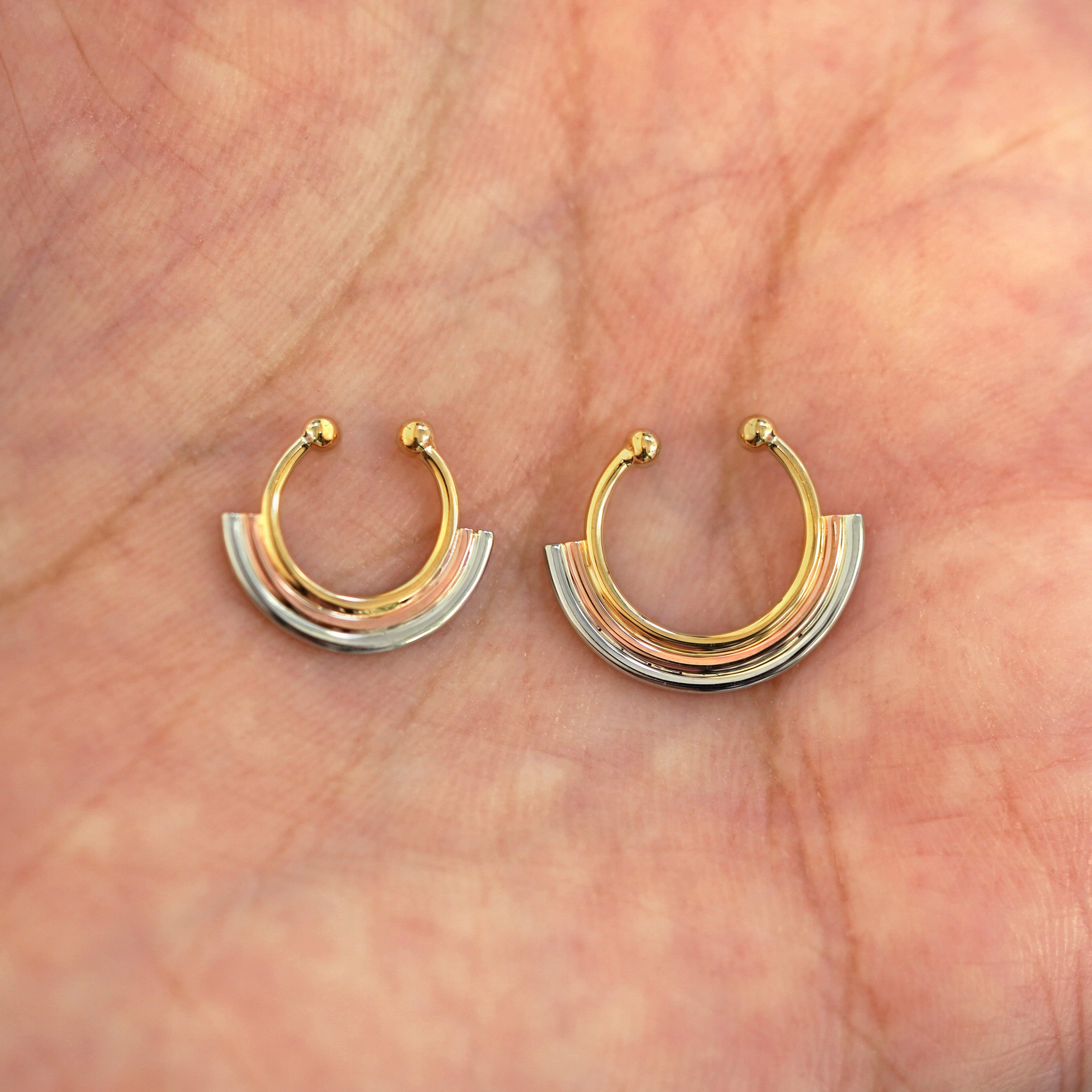The newest in our Rainbow jewelry collection, this Septum ring features a minimalist rainbow design with arches of rose, yellow, and white gold that gives the illusion you’re wearing 3 piercings. Not pierced? No problem! This septum hoop comes in both pierced and non-pierced versions. Wear this seamless septum ring as an earring or in a daith, cartilage, or other piercing.