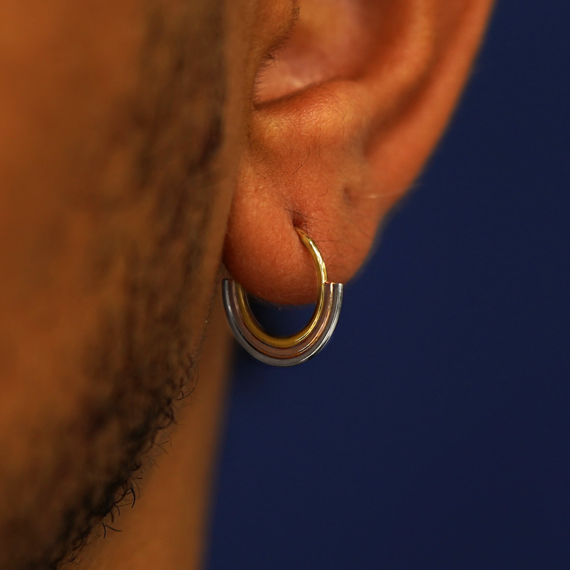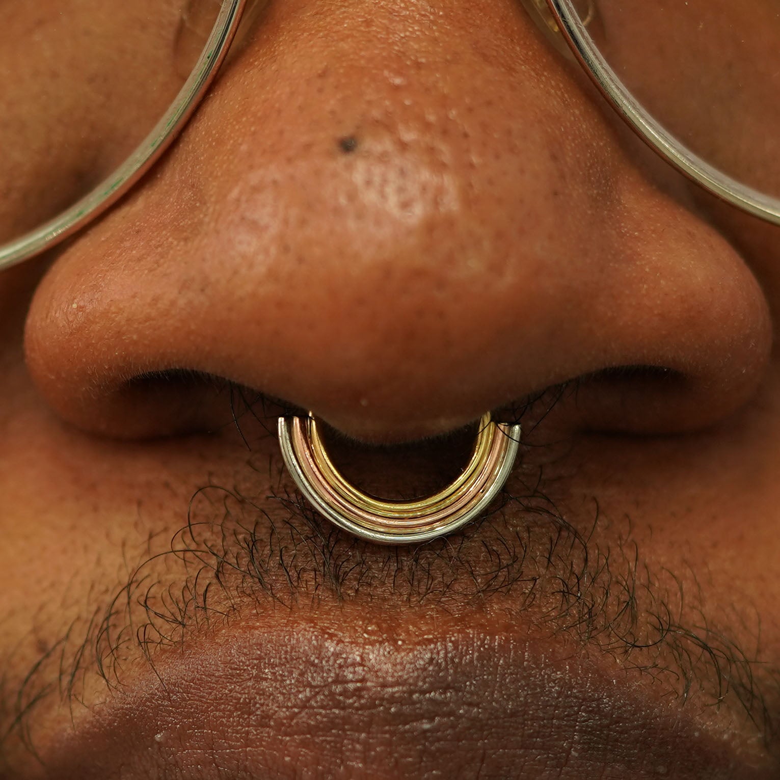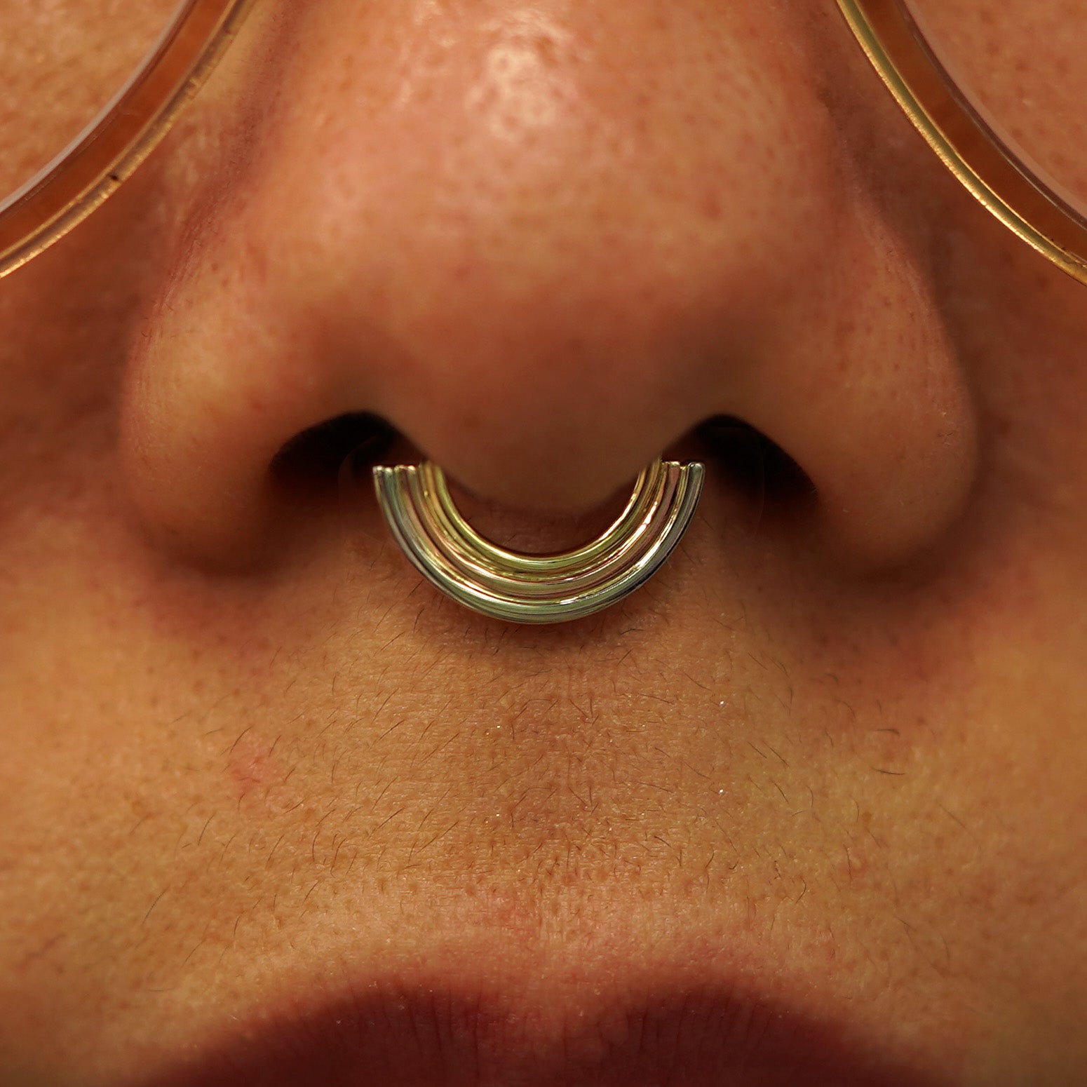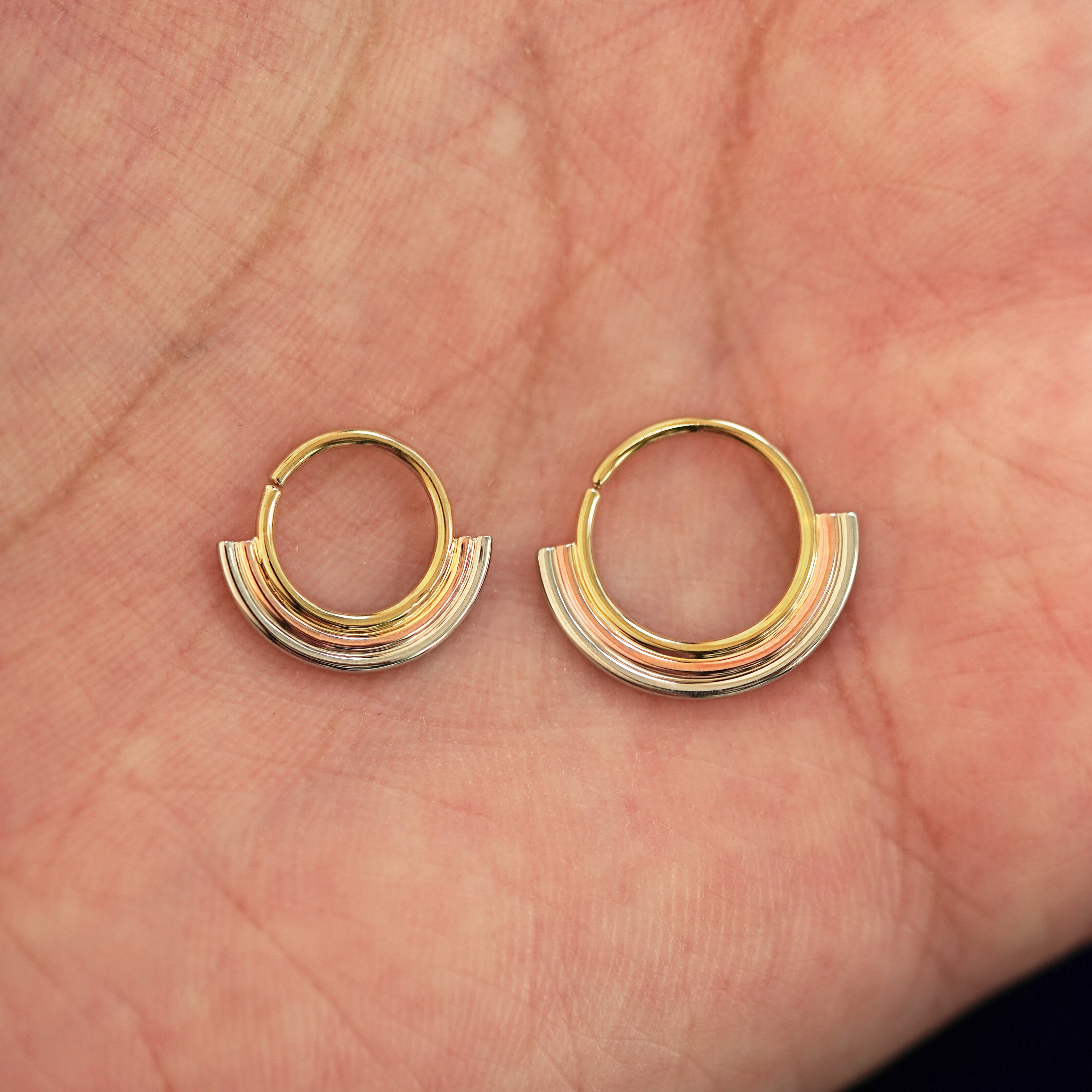 The newest in our Rainbow jewelry collection, this Septum ring features a minimalist rainbow design with arches of rose, yellow, and white gold that gives the illusion you’re wearing 3 piercings. Not pierced? No problem! This septum hoop comes in both pierced and non-pierced versions. Wear this seamless septum ring as an earring or in a daith, cartilage, or other piercing.