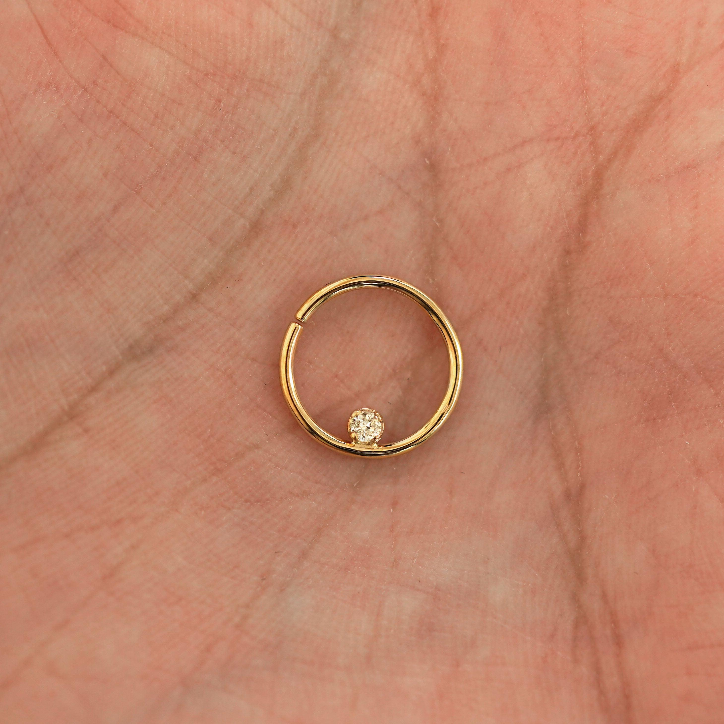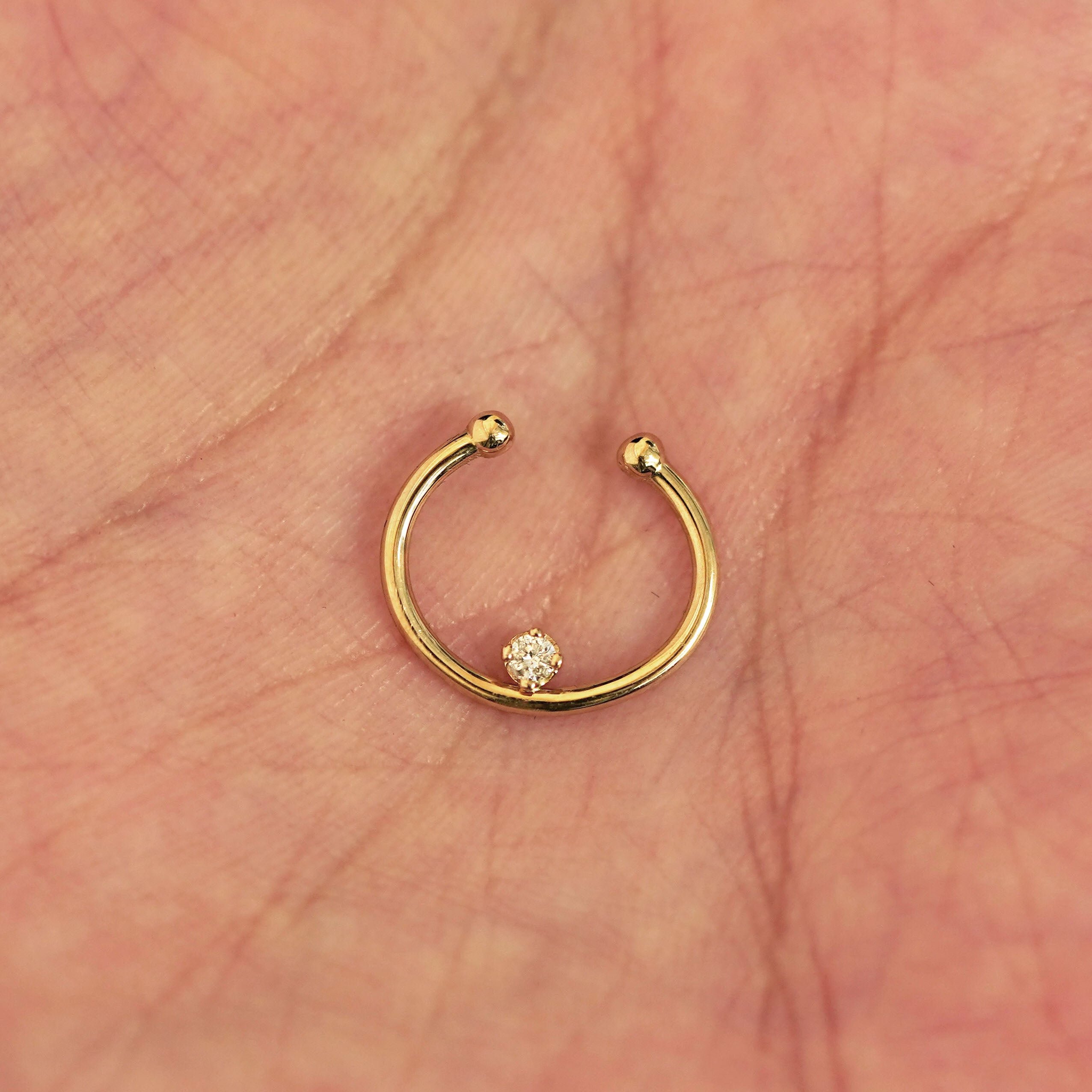 Elegantly perched above a solid gold hoop sits a sparkling 2mm diamond that loves to shine. This gorgeous raised diamond septum ring is the perfect addition to any outfit because it's stylish, durable, and sustainable! Made with recycled 14k gold and reclaimed or ethically sourced diamonds, this piece comes in both pierced and non-pierced versions. Wear this seamless septum ring as an earring or in a daith, cartilage, or other piercing.