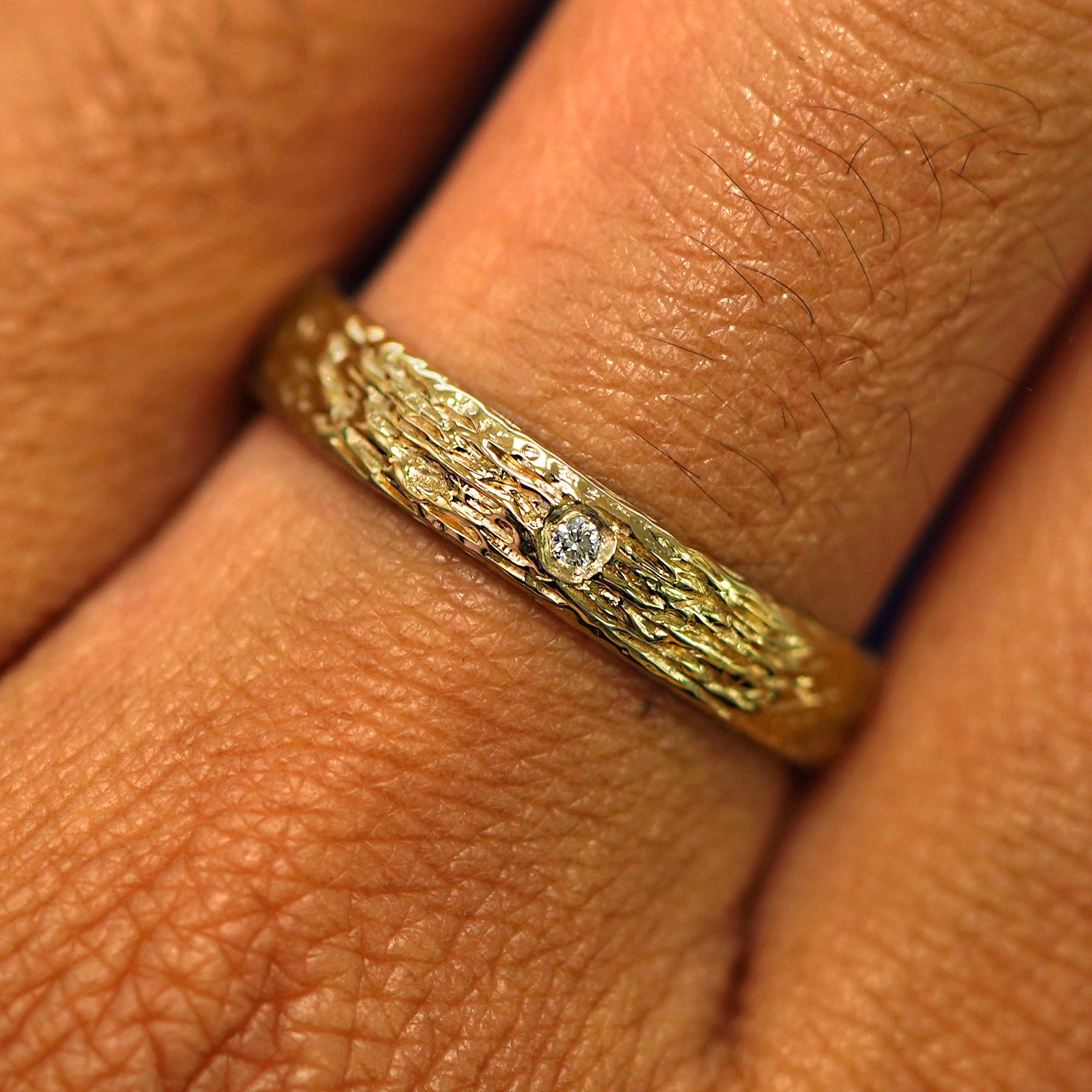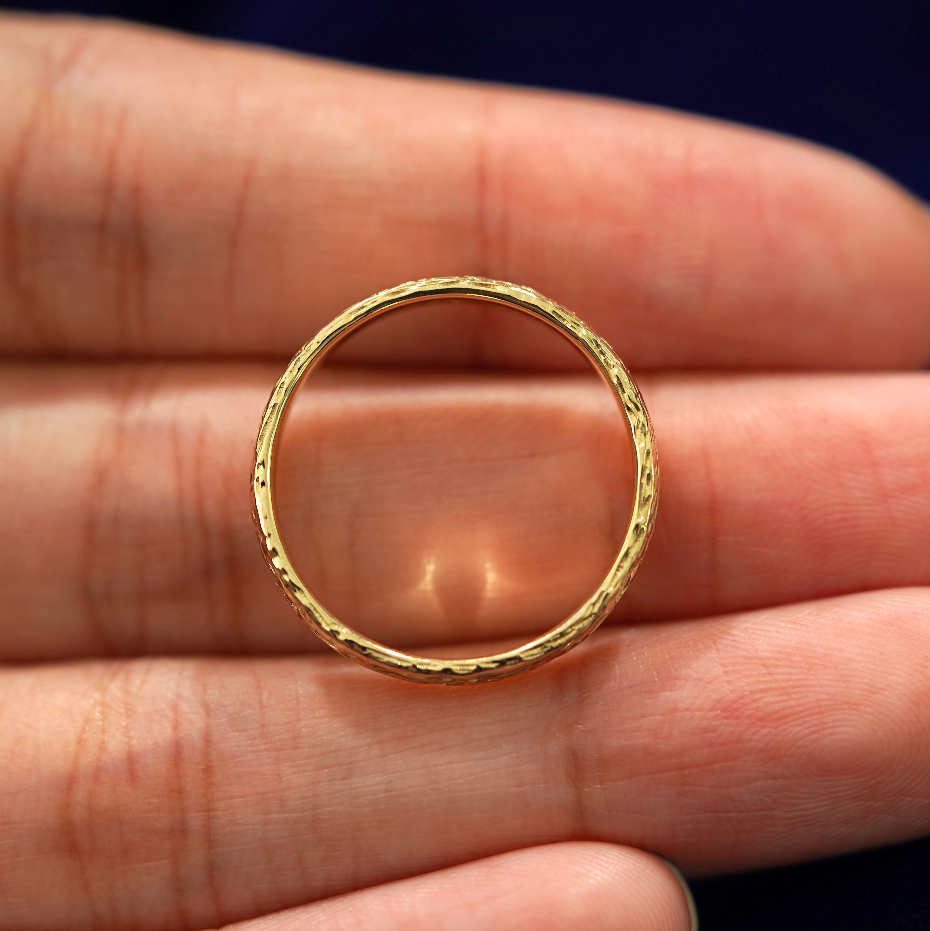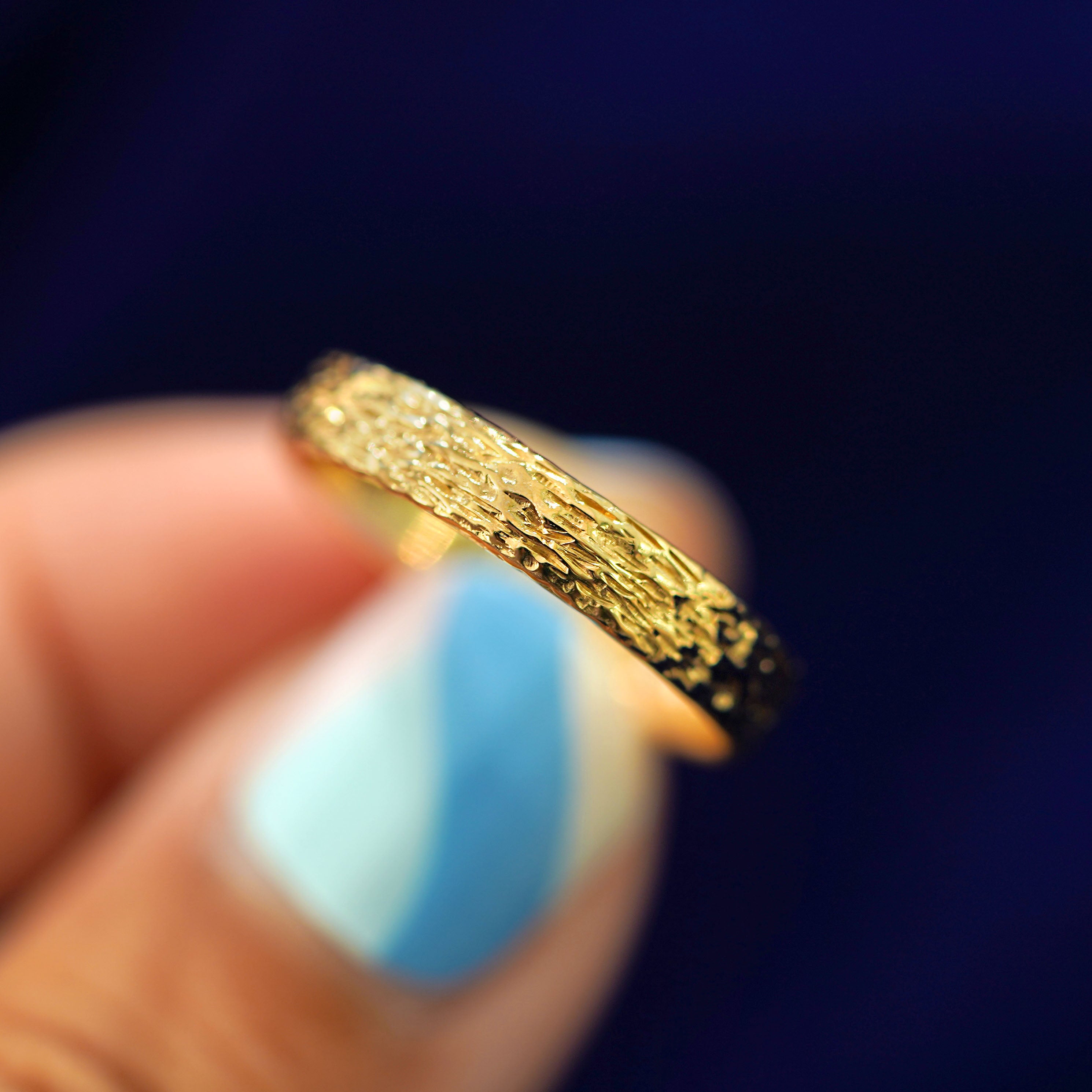 The finish of this comfort fit wedding ring is an ode to gold’s raw state. Matte polish of the surface, combined with valleys and hills of gold reflects the light in a glimmer that is enamoring and is a wonderful return to basics. Every single raw ring is unique in its pattern, making it so much more special. These 14k solid gold rings are hand-made in NYC and are ready to be your wedding band or anything your heart desires.
