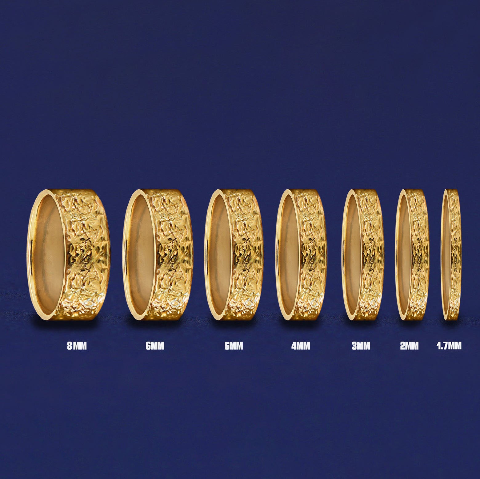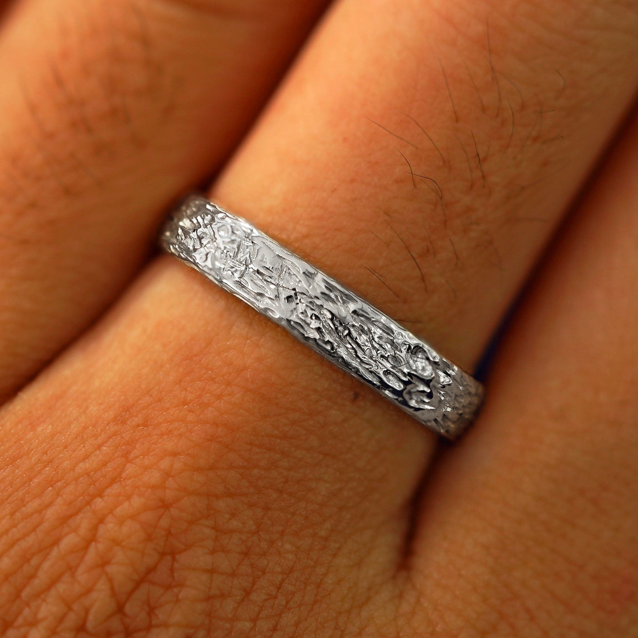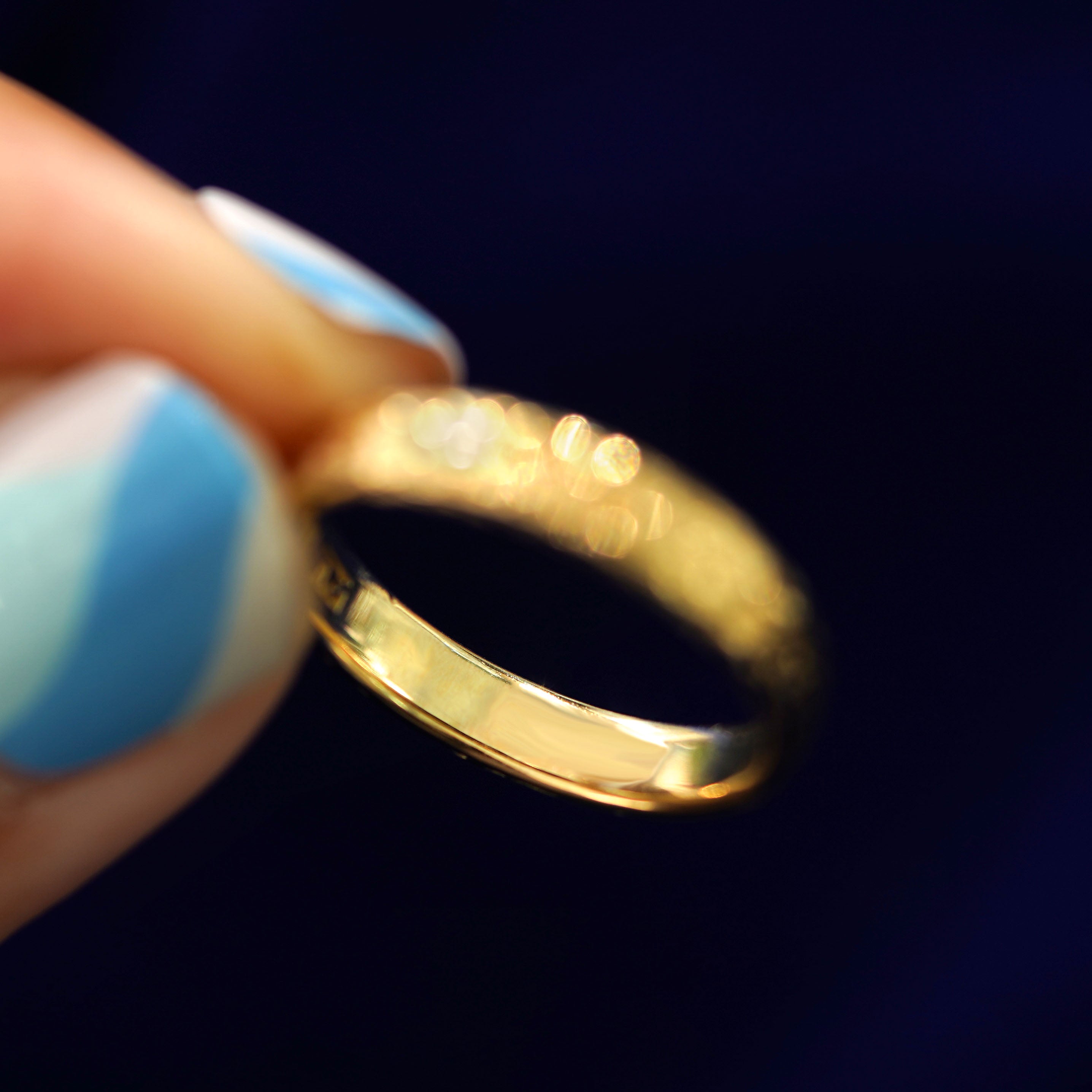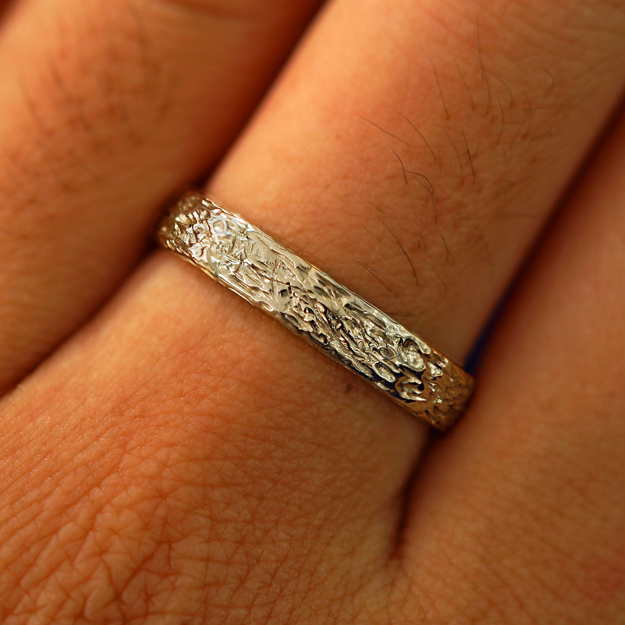 The finish of this comfort fit wedding ring is an ode to gold’s raw state. Matte polish of the surface, combined with valleys and hills of gold reflects the light in a glimmer that is enamoring and is a wonderful return to basics. Every single raw ring is unique in its pattern, making it so much more special. These 14k solid gold rings are hand-made in NYC and are ready to be your wedding band or anything your heart desires.