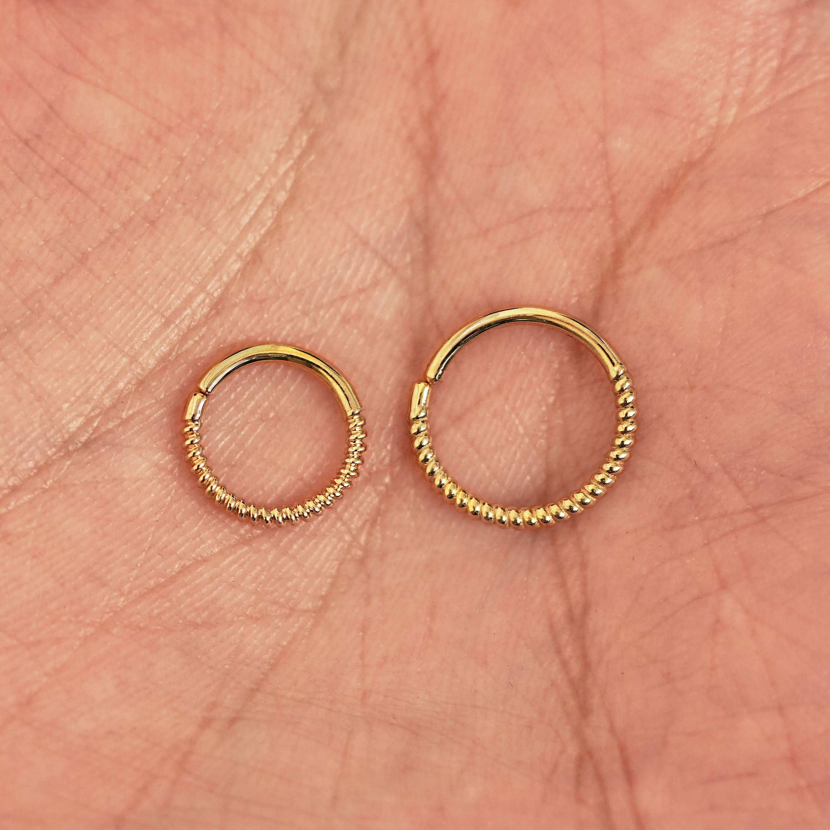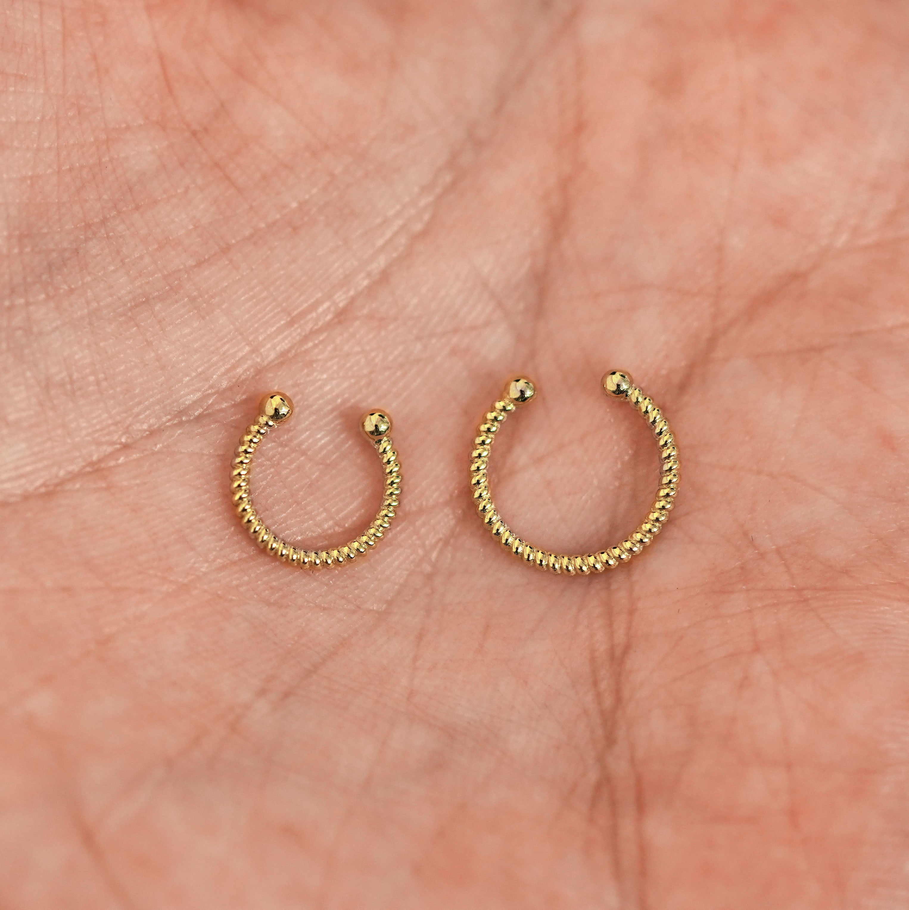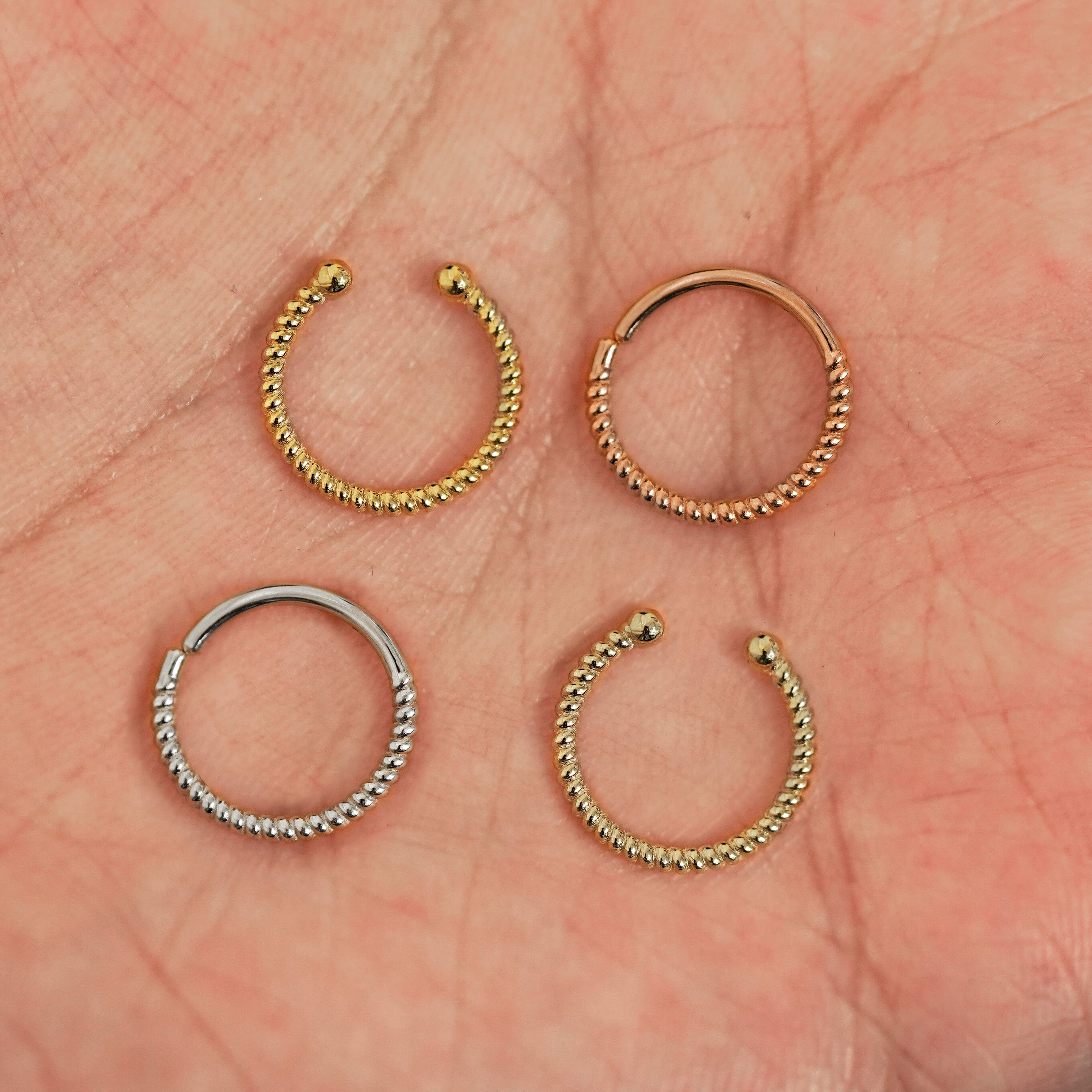 The twisting textured rope design of this septum ring catches the light to give your look a little extra sparkle. Crafted from solid 14k gold, this septum ring comes in both pierced and non-pierced options so anyone can wear it. Wear this seamless septum ring as an earring or in a daith, cartilage, or other piercing.