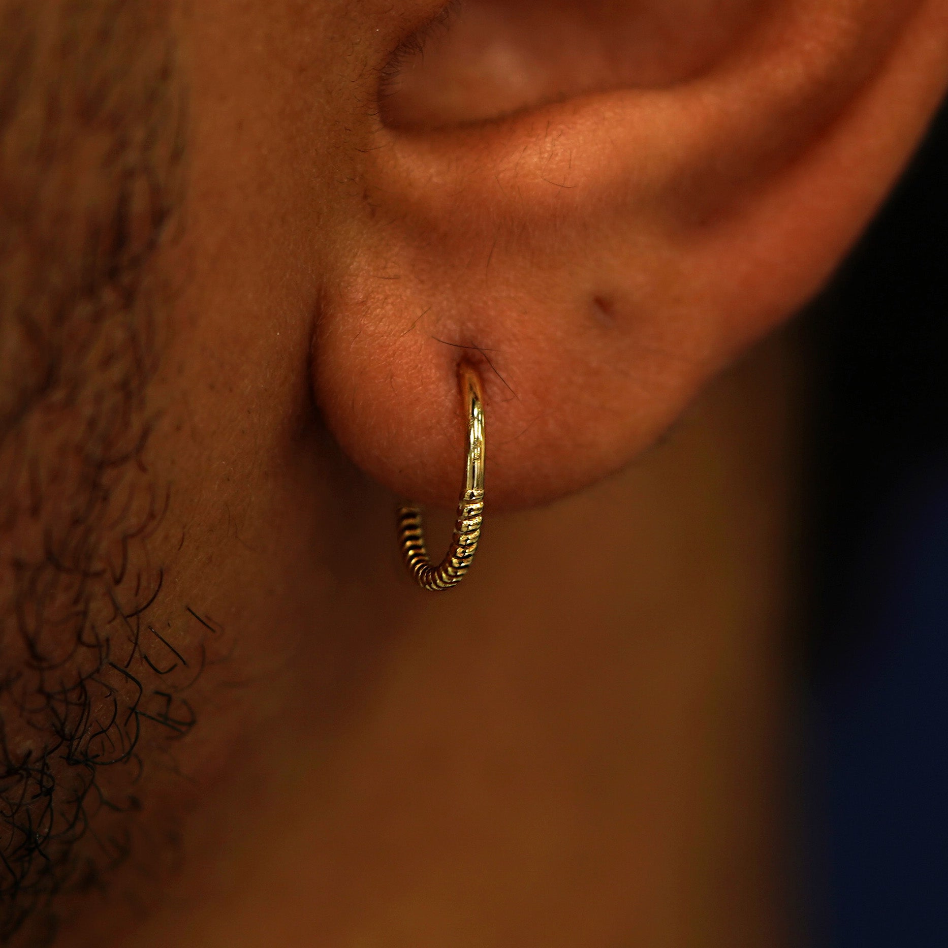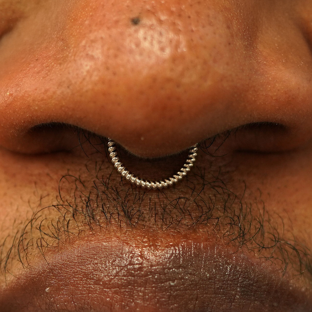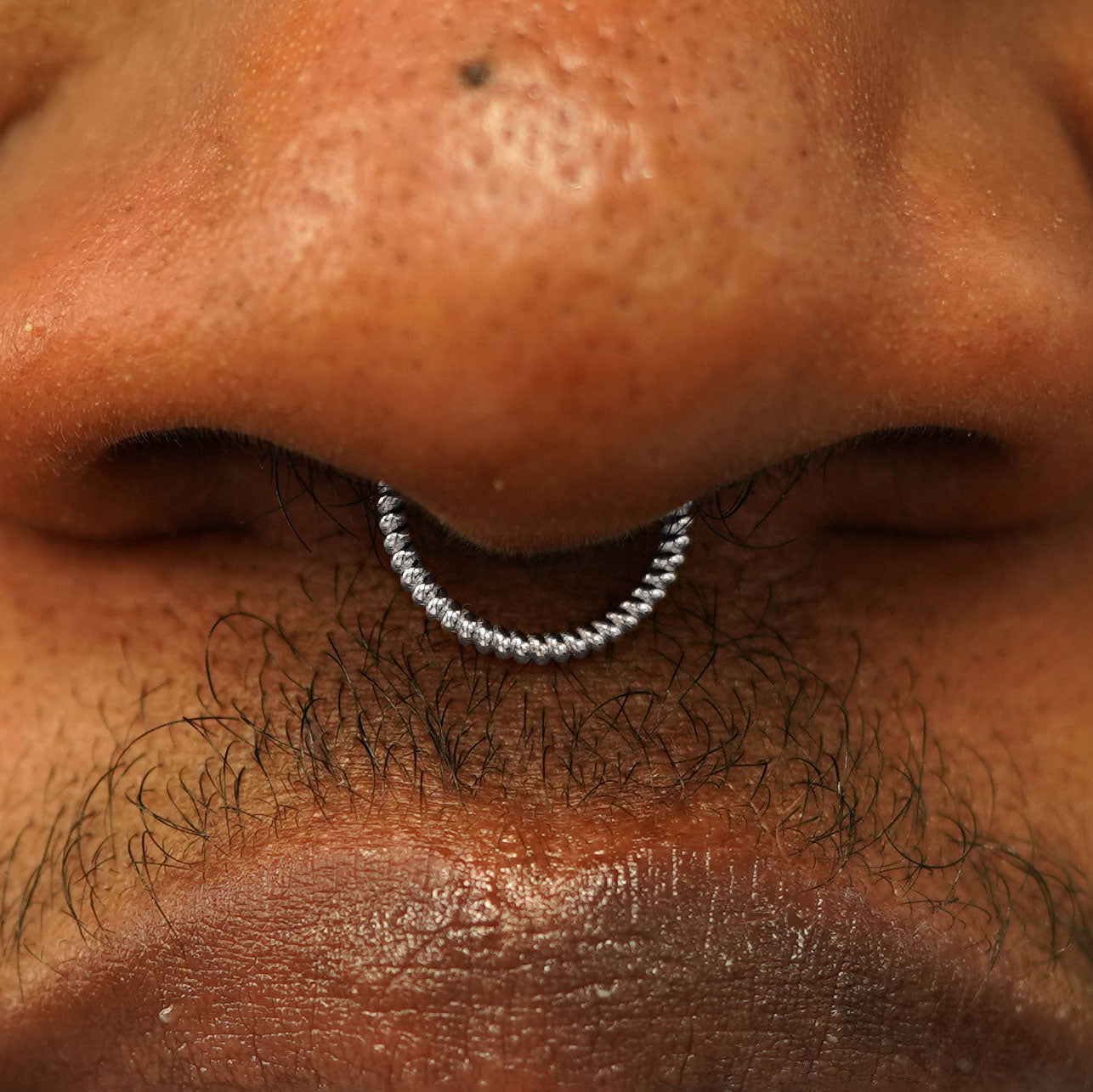 The twisting textured rope design of this septum ring catches the light to give your look a little extra sparkle. Crafted from solid 14k gold, this septum ring comes in both pierced and non-pierced options so anyone can wear it. Wear this seamless septum ring as an earring or in a daith, cartilage, or other piercing.