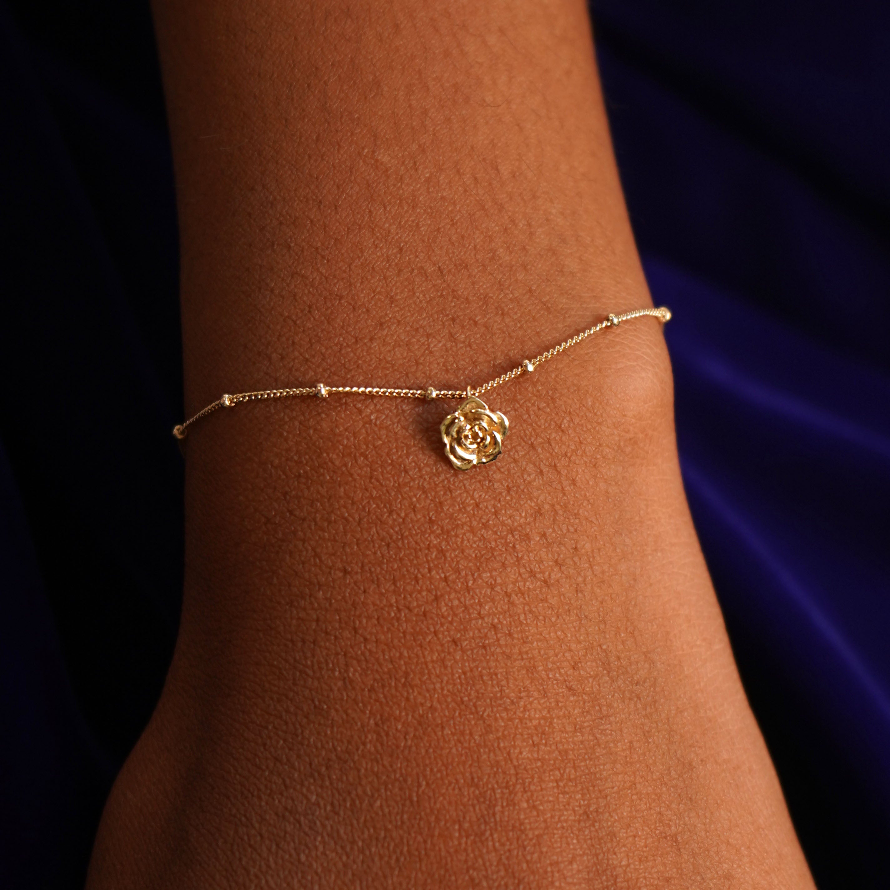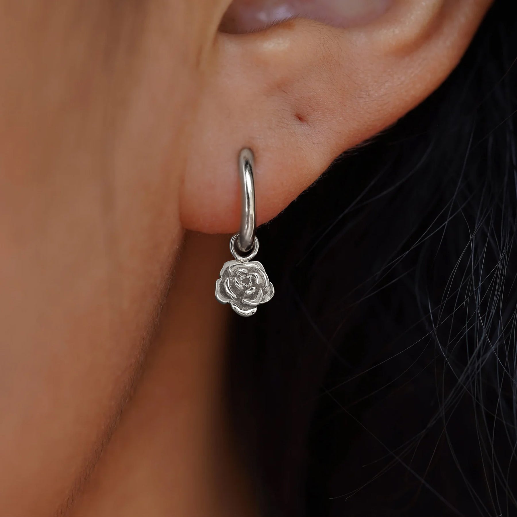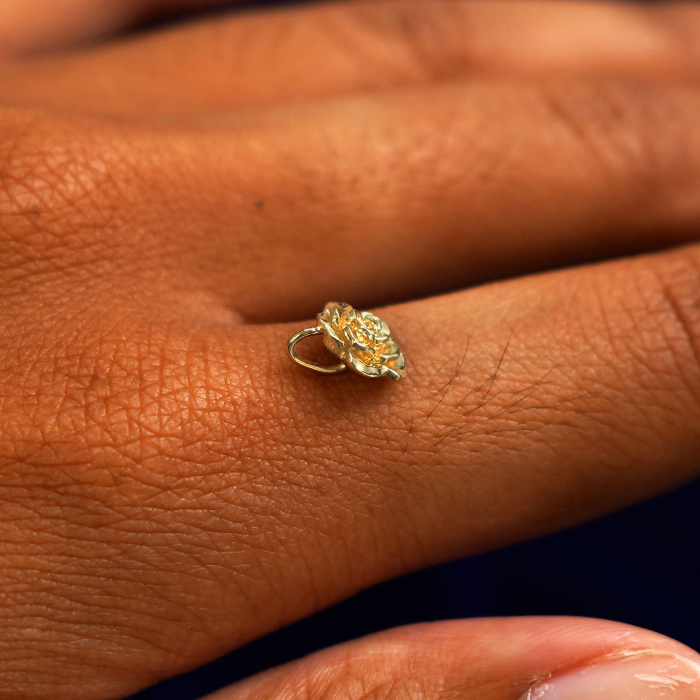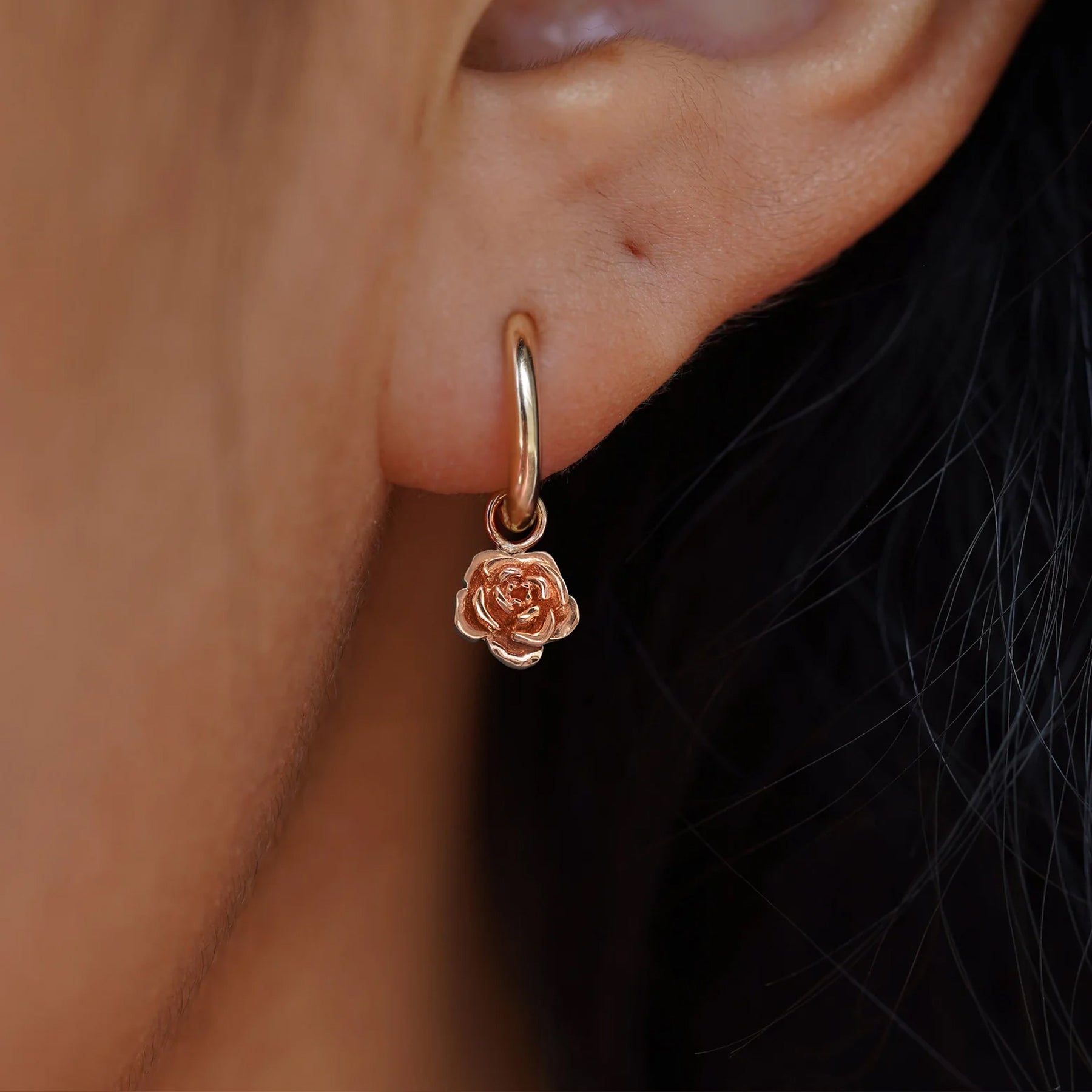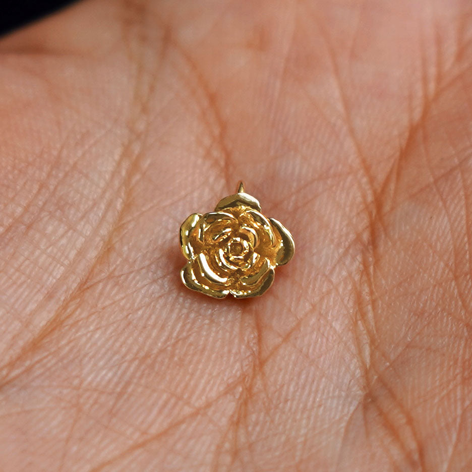 This 14k solid gold rose charm has incredible detail and each flower petal has a unique shape and curve. This dainty flower comes in two beautiful options the 'for chain' option is a cute slider pendant, and the 'for earring' option has a raised bail to dangle from a hoop or stud.