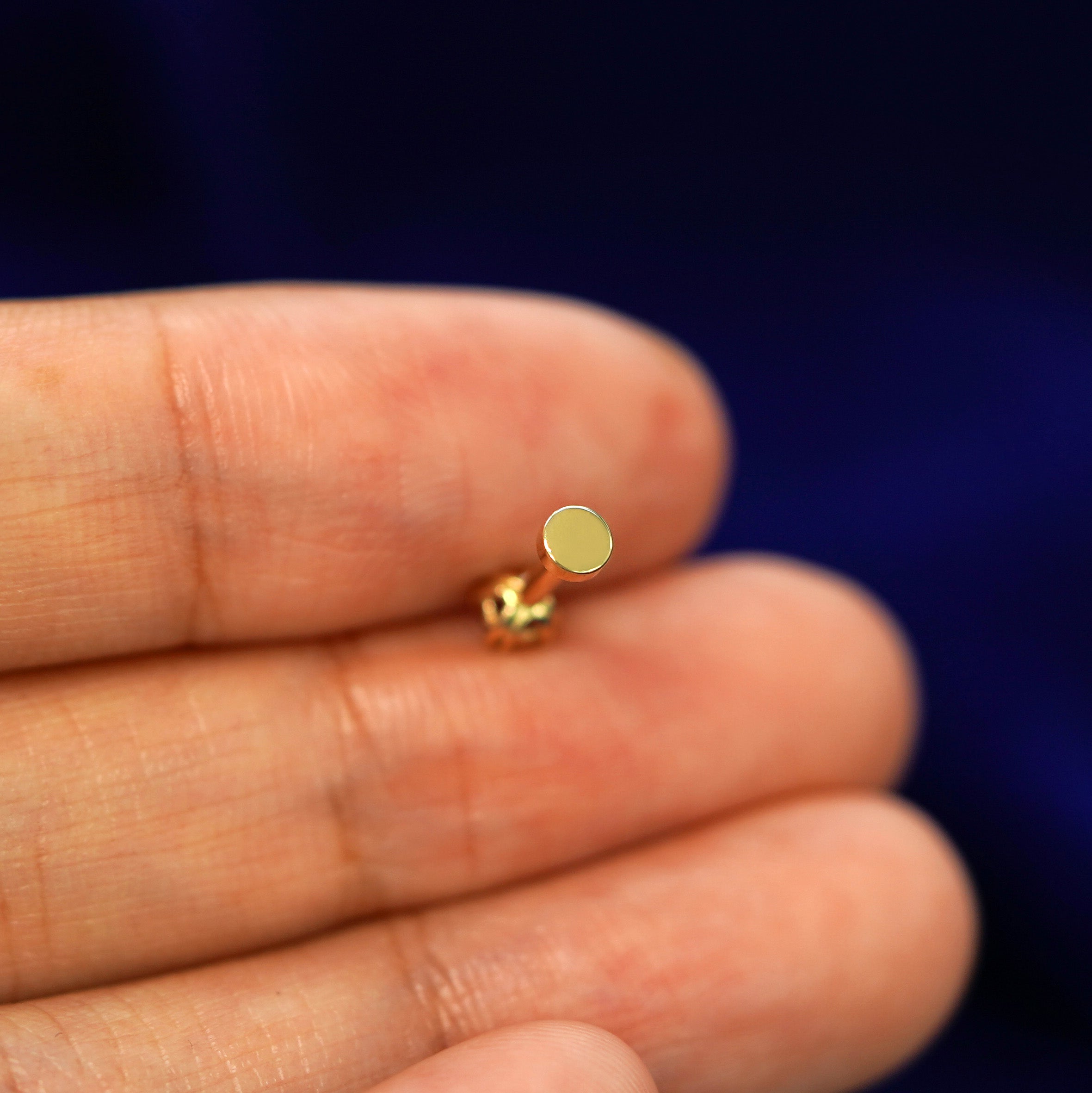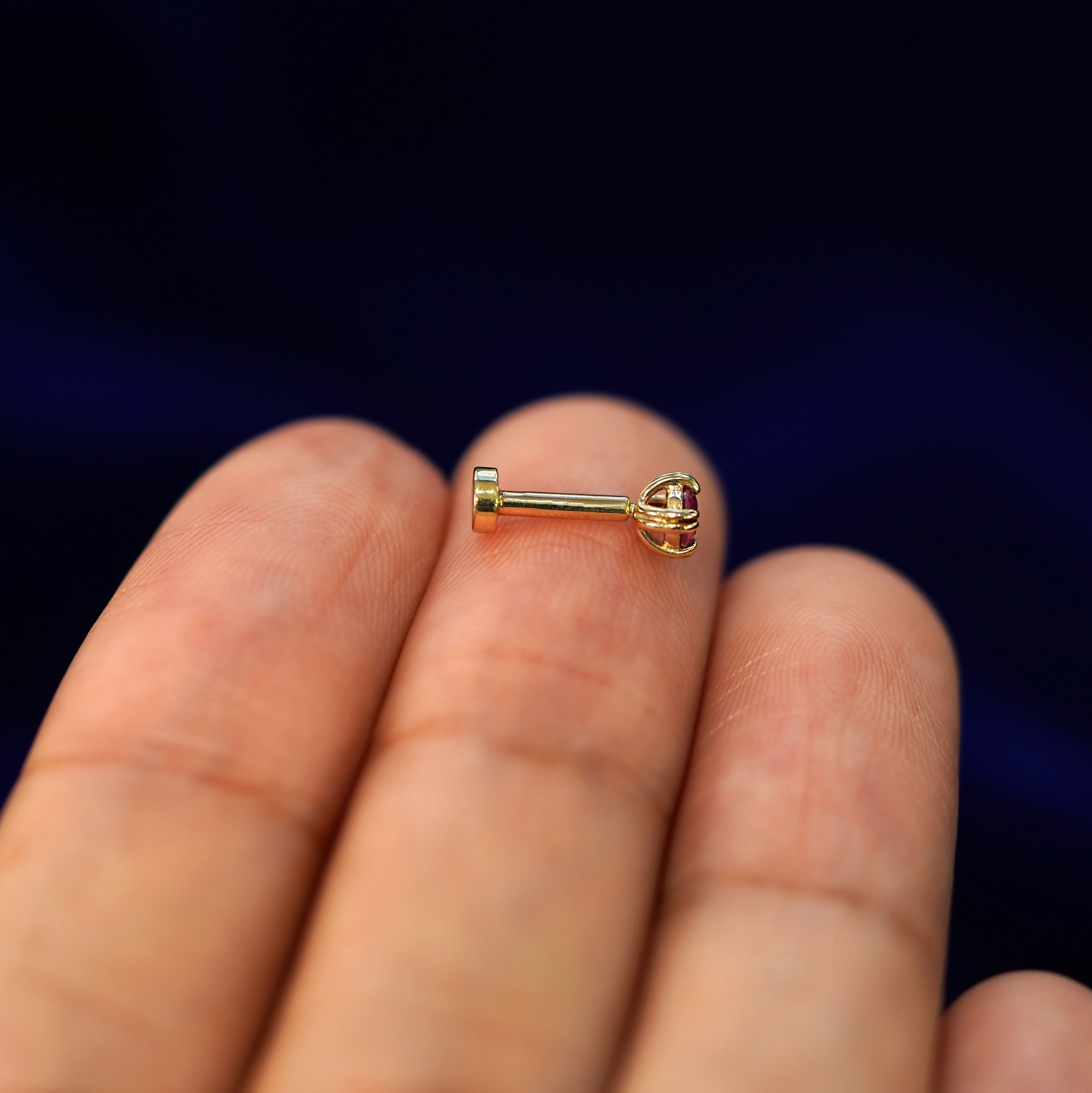 A ravishing red beauty, this solid gold ruby threadless push in stud is the perfect piece of July birthstone jewelry. Natural rubies range in color from deep pink to deep red, so each of these dainty ruby earrings is unique. Our flat backs are crafted only in 14k yellow gold to avoid sensitivity.
