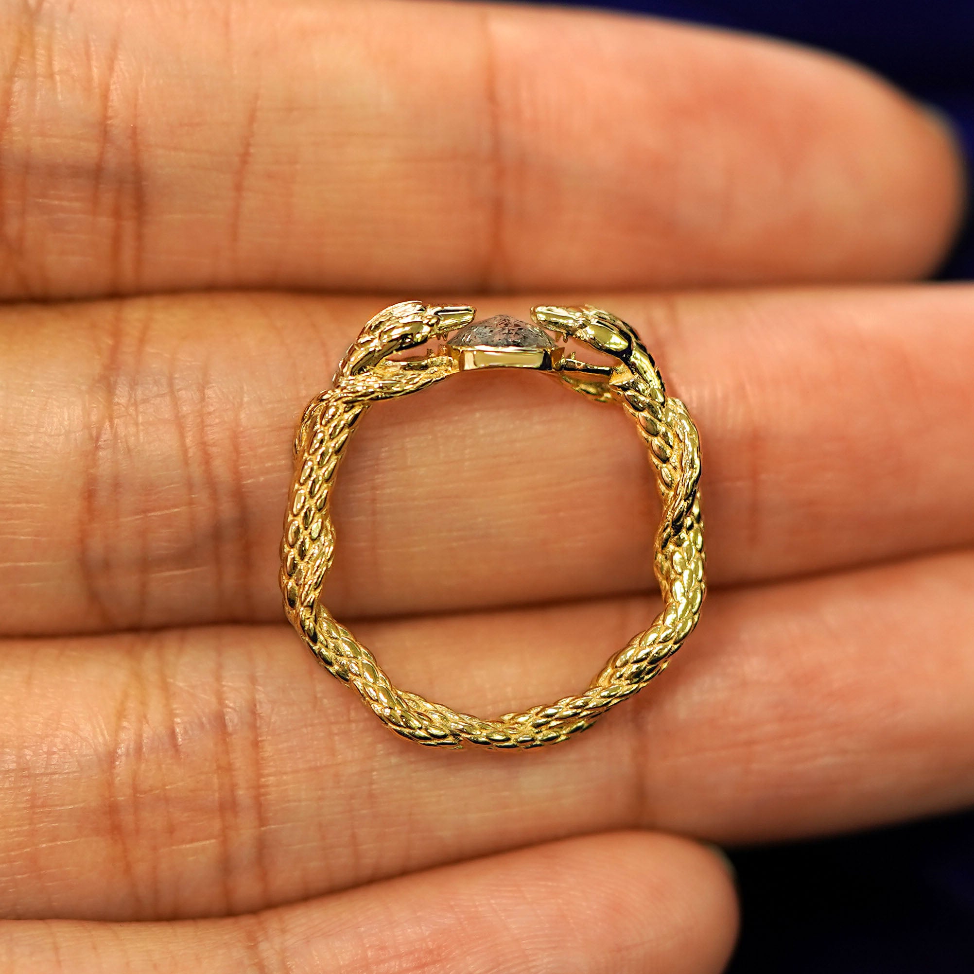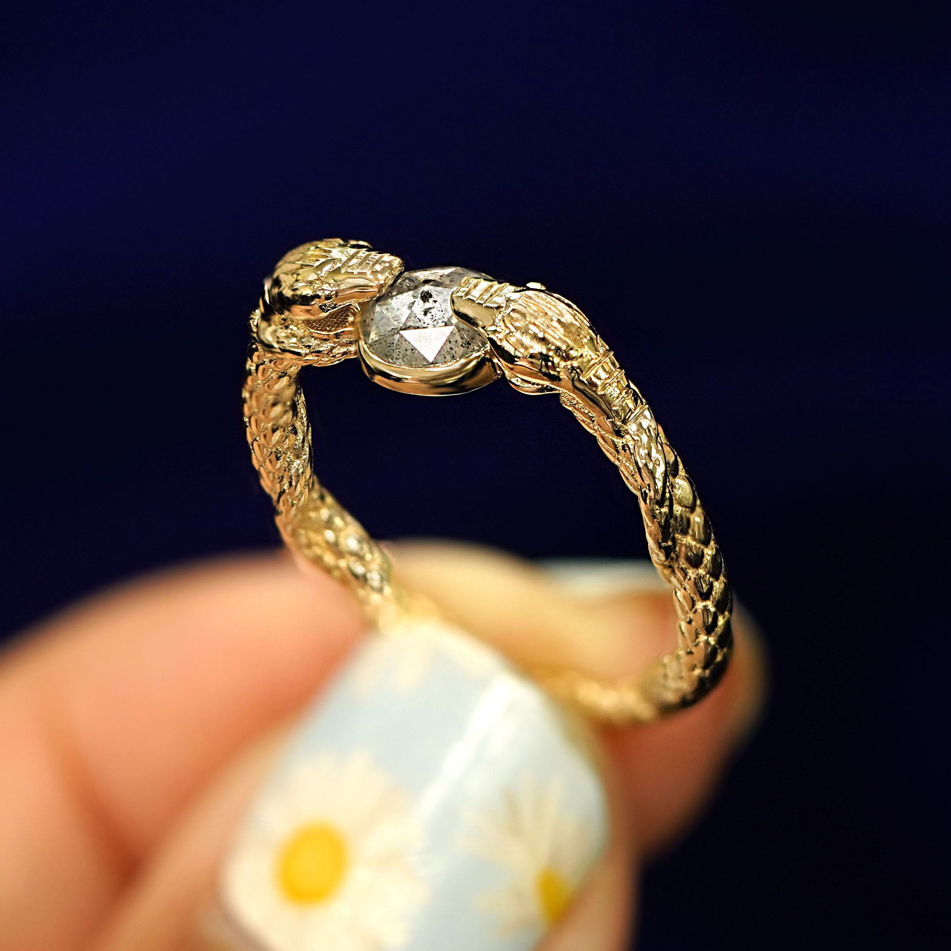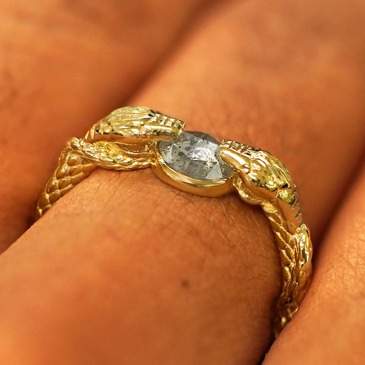 This stunning snake ring is an ode to NYC Architecture. During a walk around our beautiful city, our founder and designer AL was inspired by the intertwined snakes on the antique door knockers that guard the entrance of the New York Public Library. Two intricately detailed snakes wrap and slither around the band of the solid 14k yellow gold ring to create a textured band that still glides comfortably on and off your finger. They meet at the top to hold either side of a sparkling bezel set rose-cut salt and pepper diamond between their teeth, guarding the stone with their fangs.