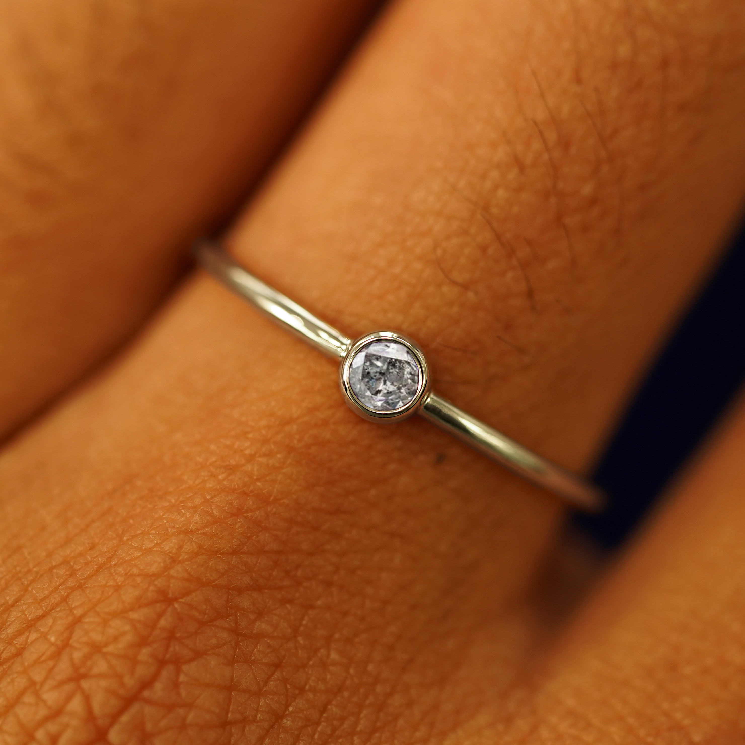With its galaxy of inclusions, the salt and pepper diamond is the perfect complement to this solid gold or platinum ring. This beautiful black and white solitaire diamond ring goes with any outfit. Whether declaring your love with an engagement ring or just celebrating yourself with some stunning April birthstone jewelry, this diamond ring is a solid gold investment.