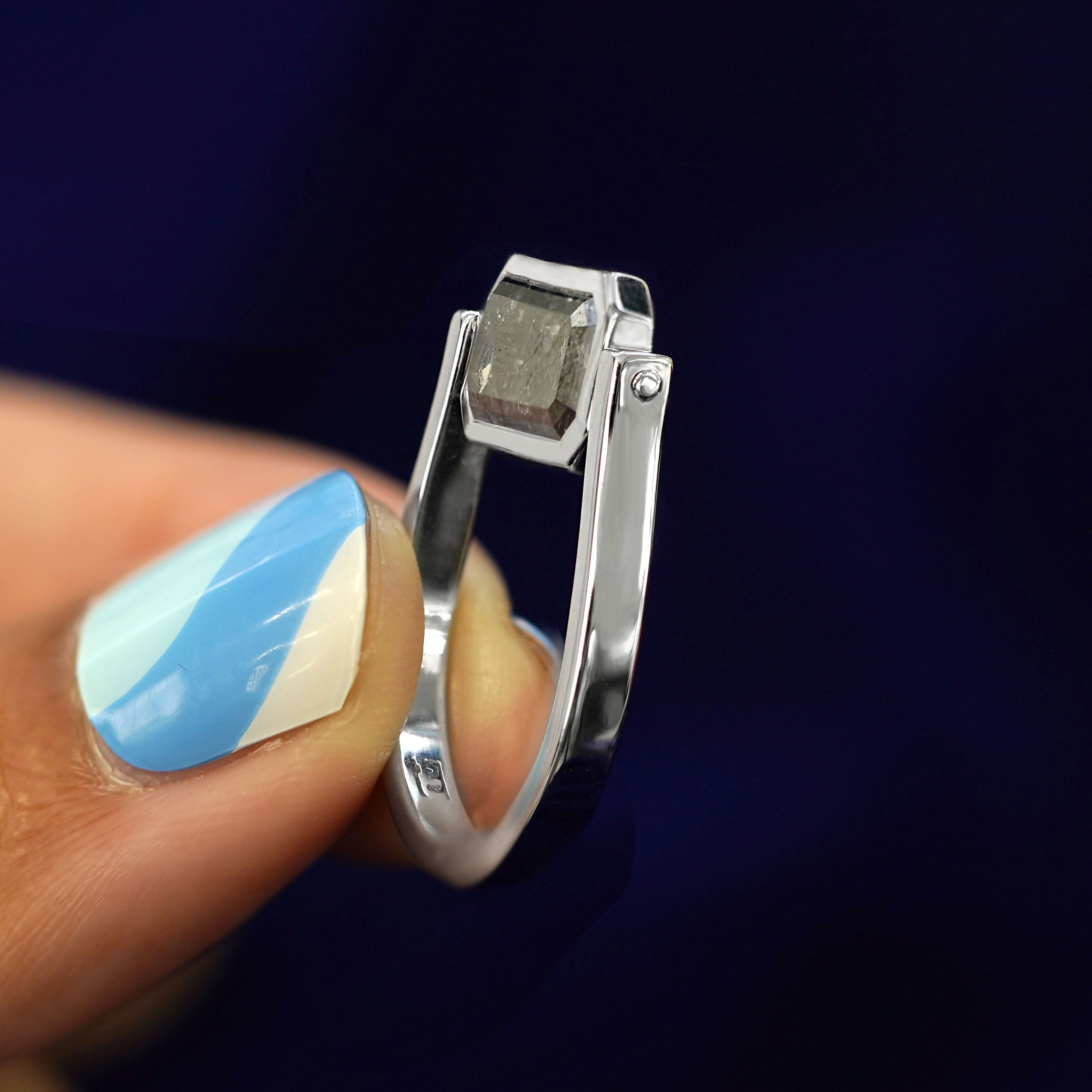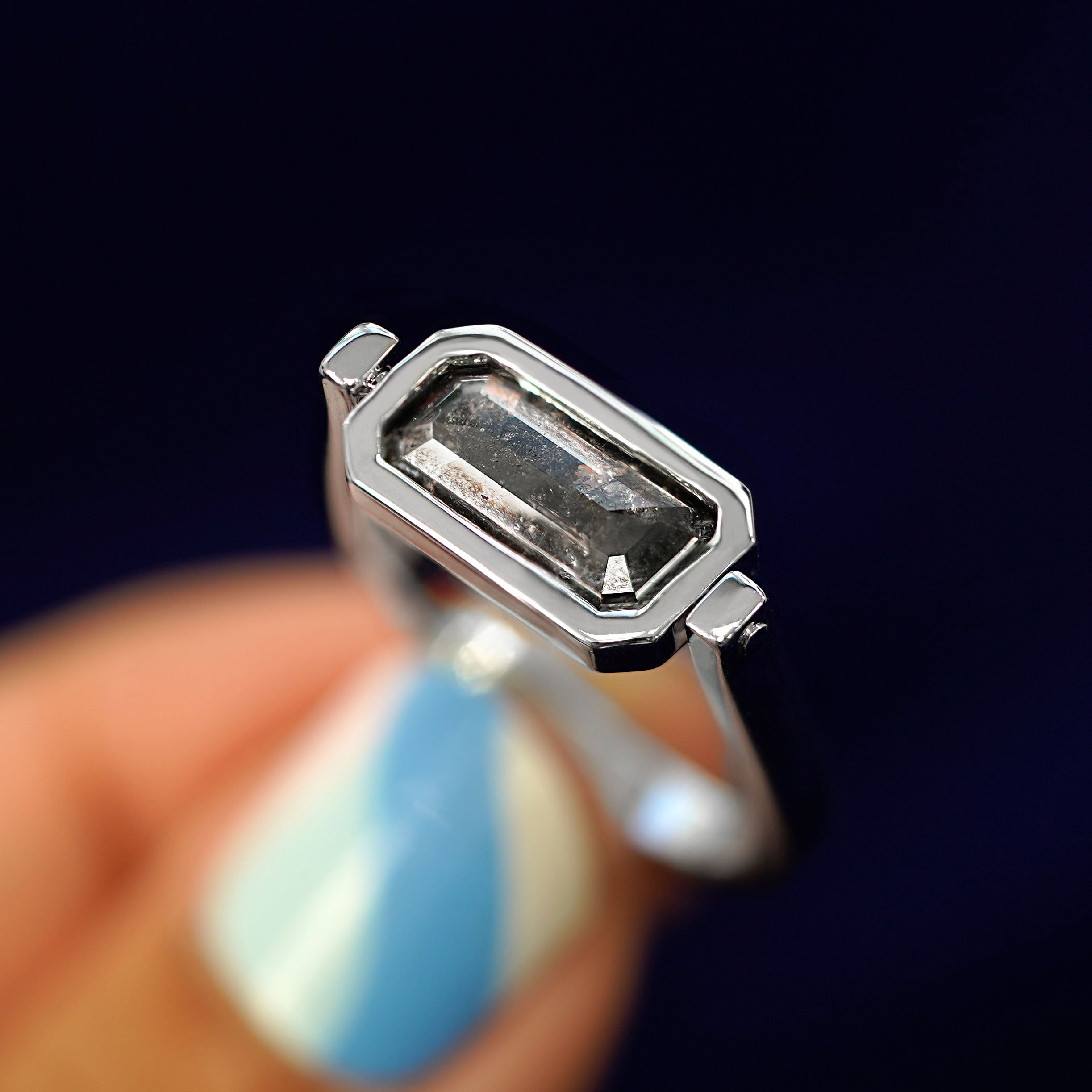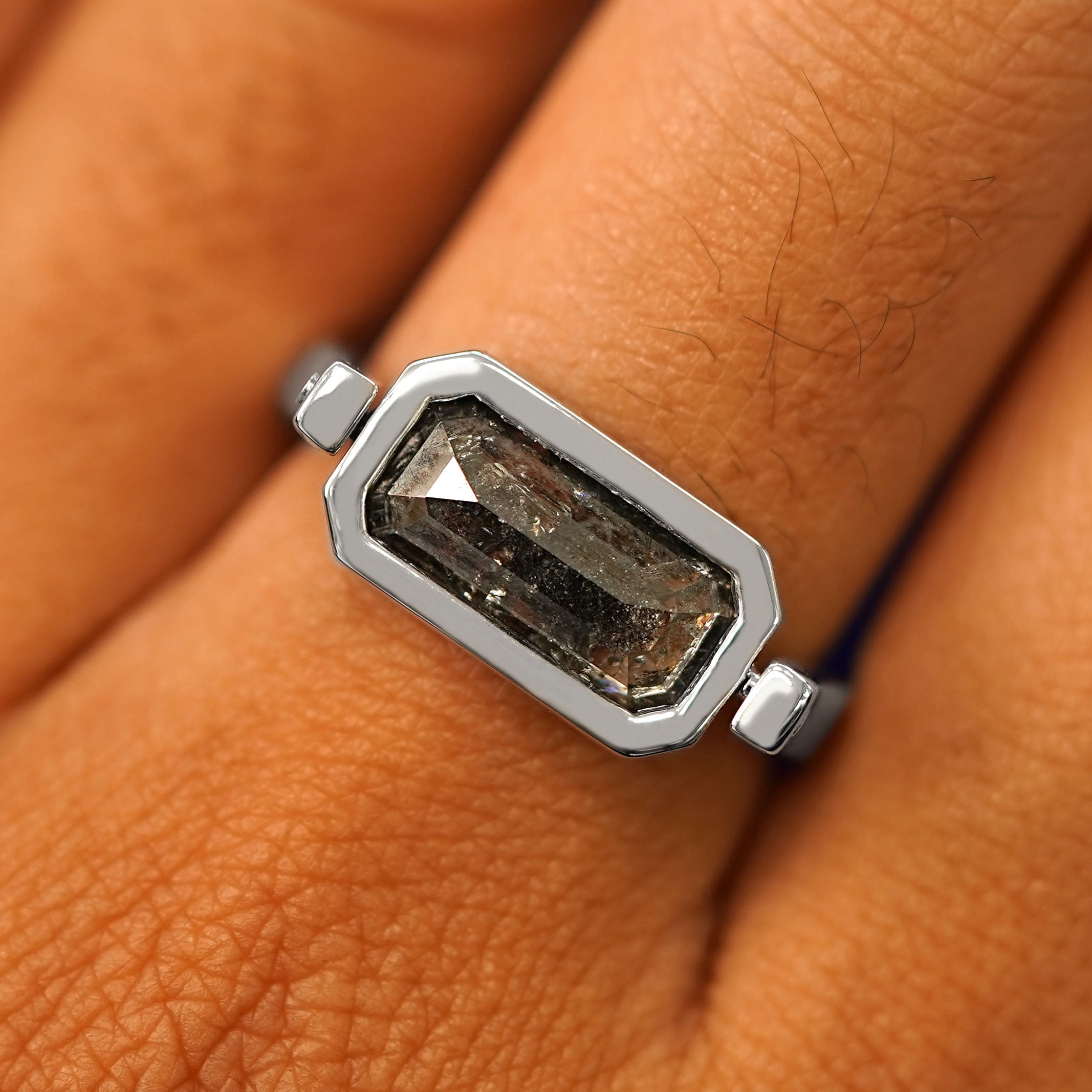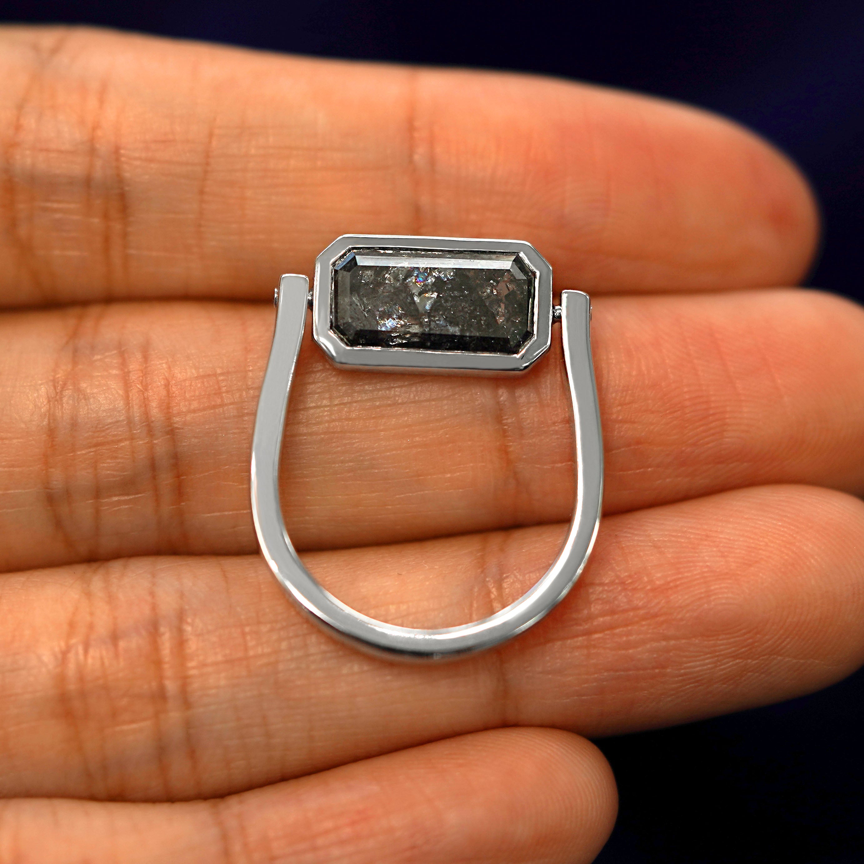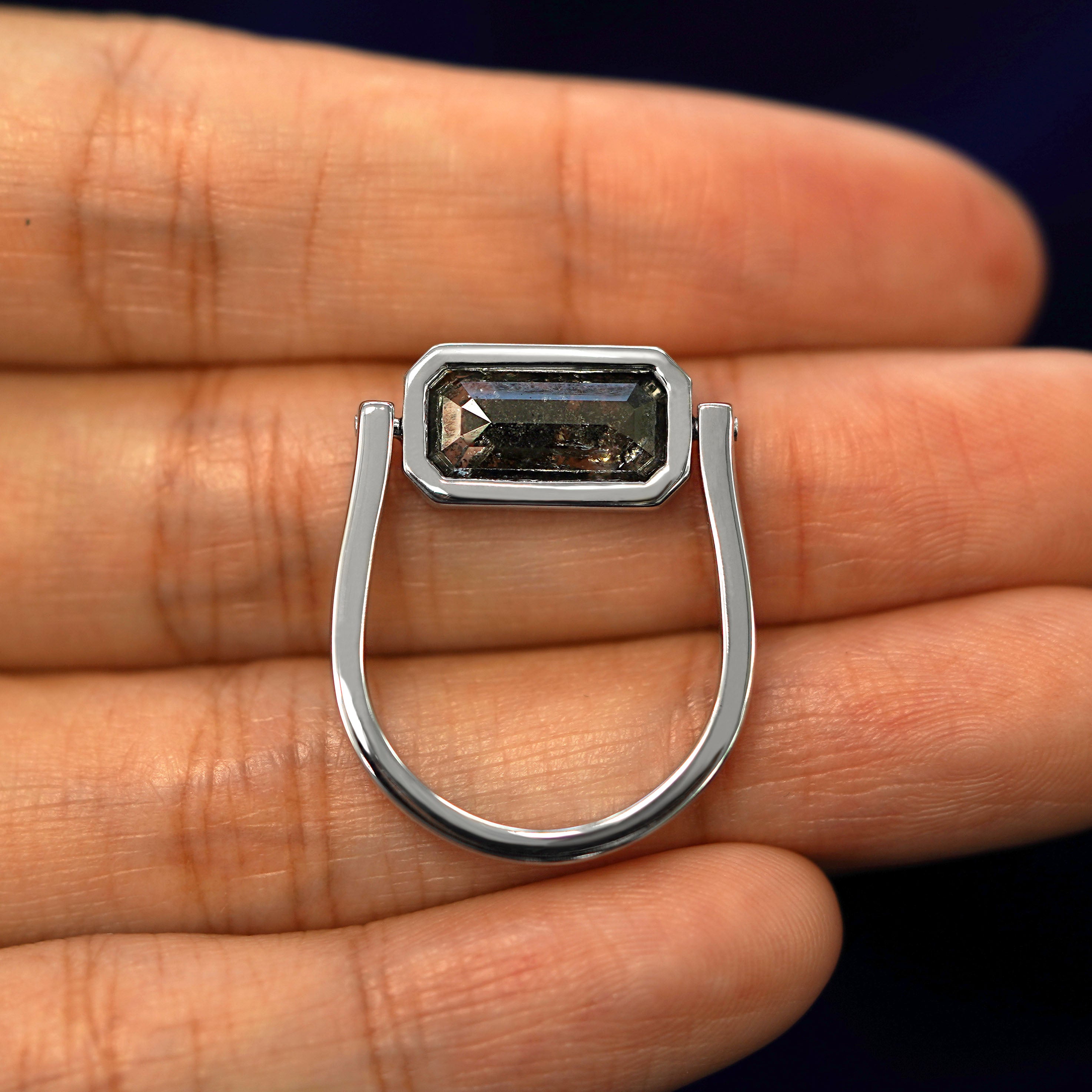 A sensational sensory experience, this stunning spinner ring is everything. When creating this ring, our founder and designer AL wanted to mix a unique sensory experience with a durable yet luxurious design. This fidget ring features a stunning 3.54ct emerald cut salt and pepper diamond with rare silver and rainbow inclusions. The stone lays flat and comfortable against your finger and the band glides on and off with ease.