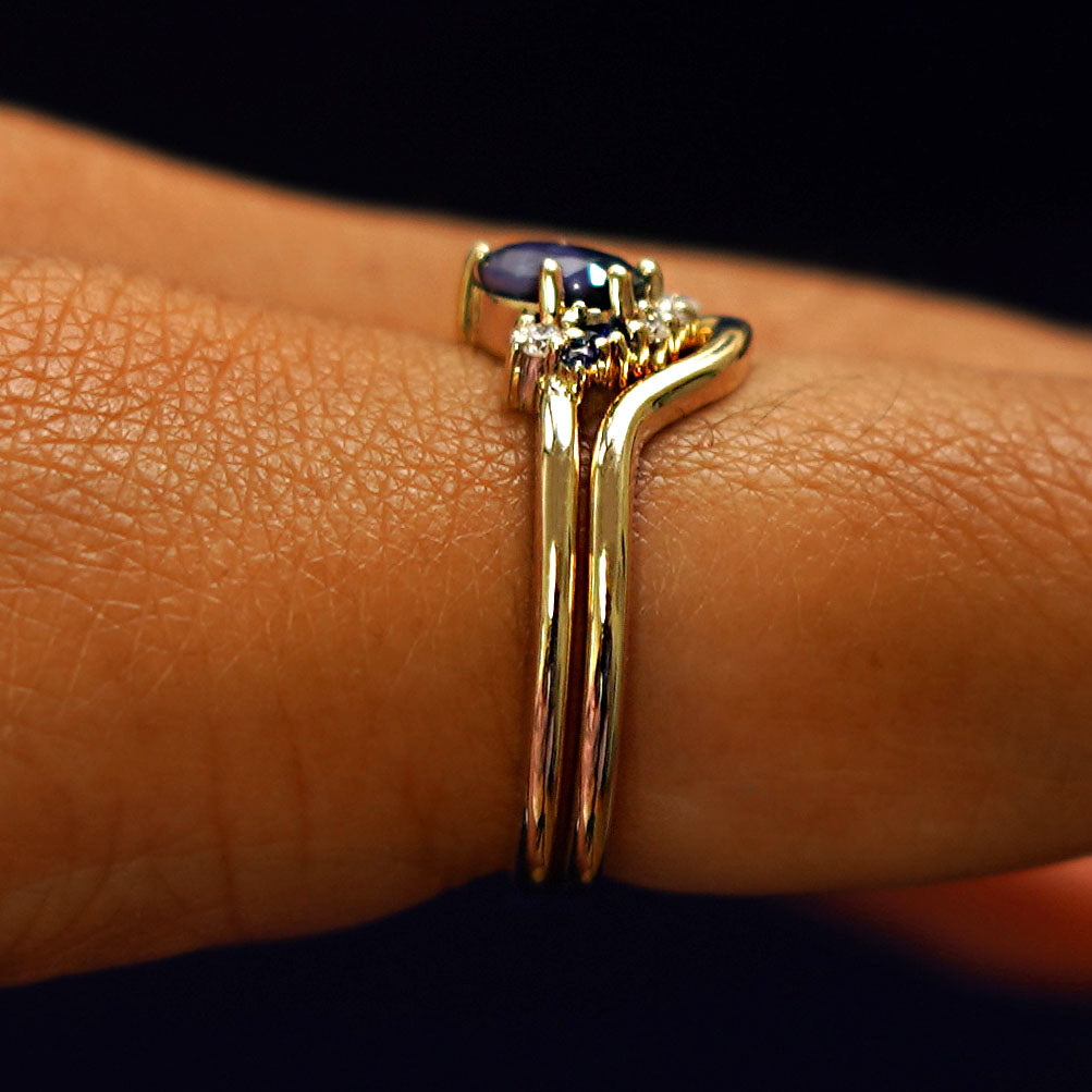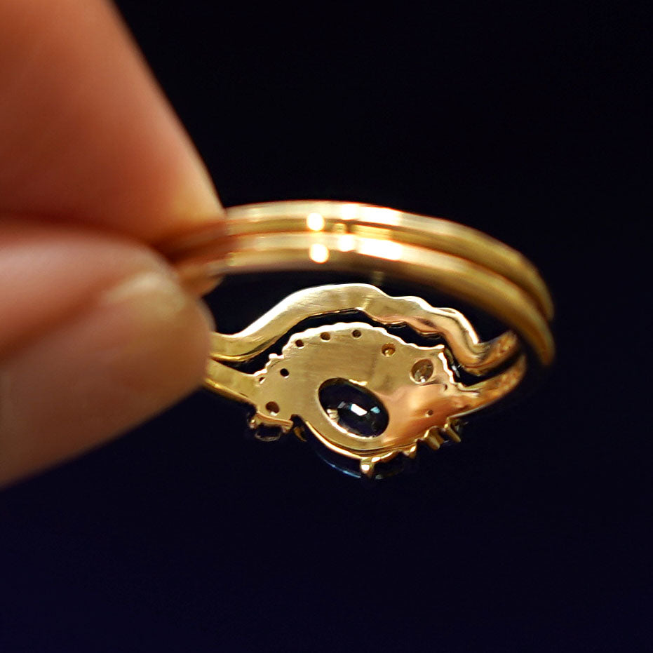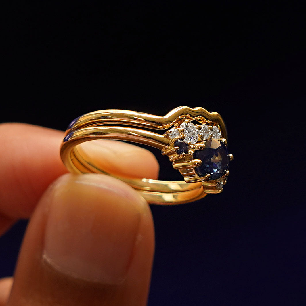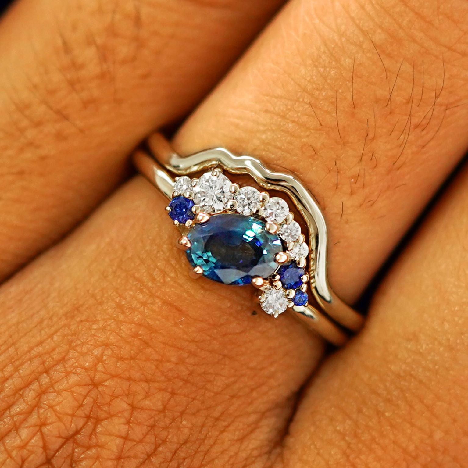 Montana sapphires and a mountain range band, this ring set is an asymmetrical wonder. The engagement ring features a natural Montana sapphire with a stunning blue-green hue that has flashes of teal. The oval center stone is set at an angle at is accompanied by clusters of diamonds and sapphires in a half-halo that gives the ring an eye-catching look. The special cut 14k solid gold or platinum wedding band fits perfectly against the gemstone cluster but also looks amazing if worn on its own.