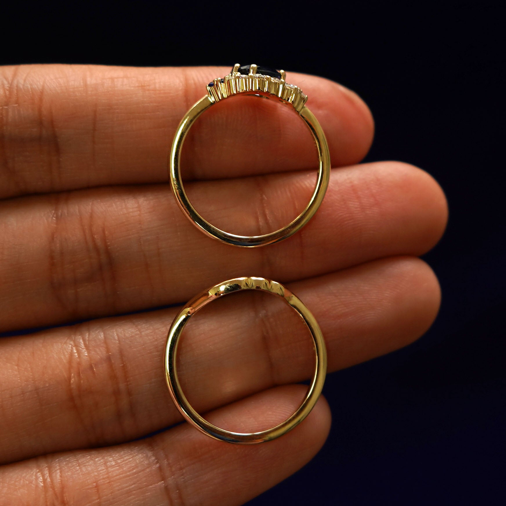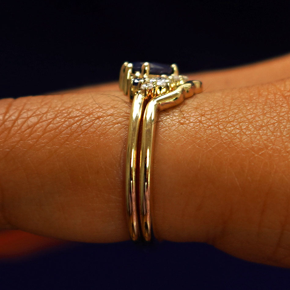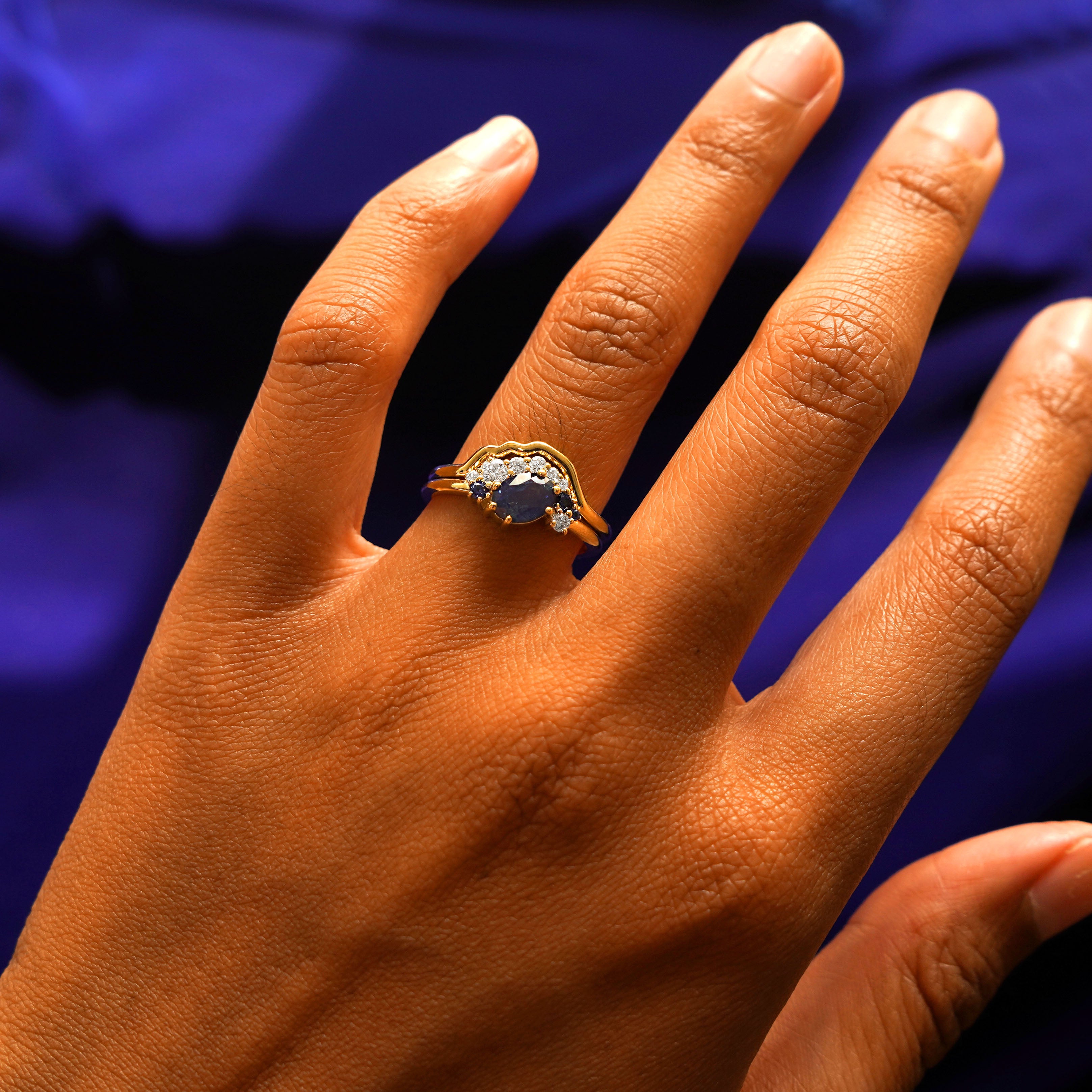 Montana sapphires and a mountain range band, this ring set is an asymmetrical wonder. The engagement ring features a natural Montana sapphire with a stunning blue-green hue that has flashes of teal. The oval center stone is set at an angle at is accompanied by clusters of diamonds and sapphires in a half-halo that gives the ring an eye-catching look. The special cut 14k solid gold or platinum wedding band fits perfectly against the gemstone cluster but also looks amazing if worn on its own.