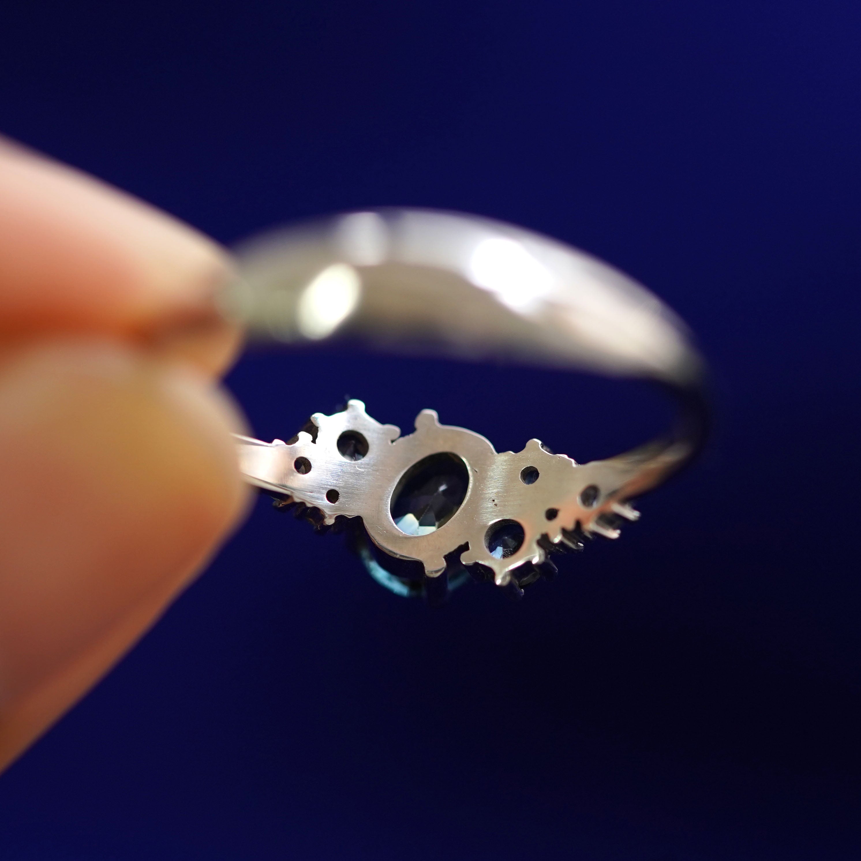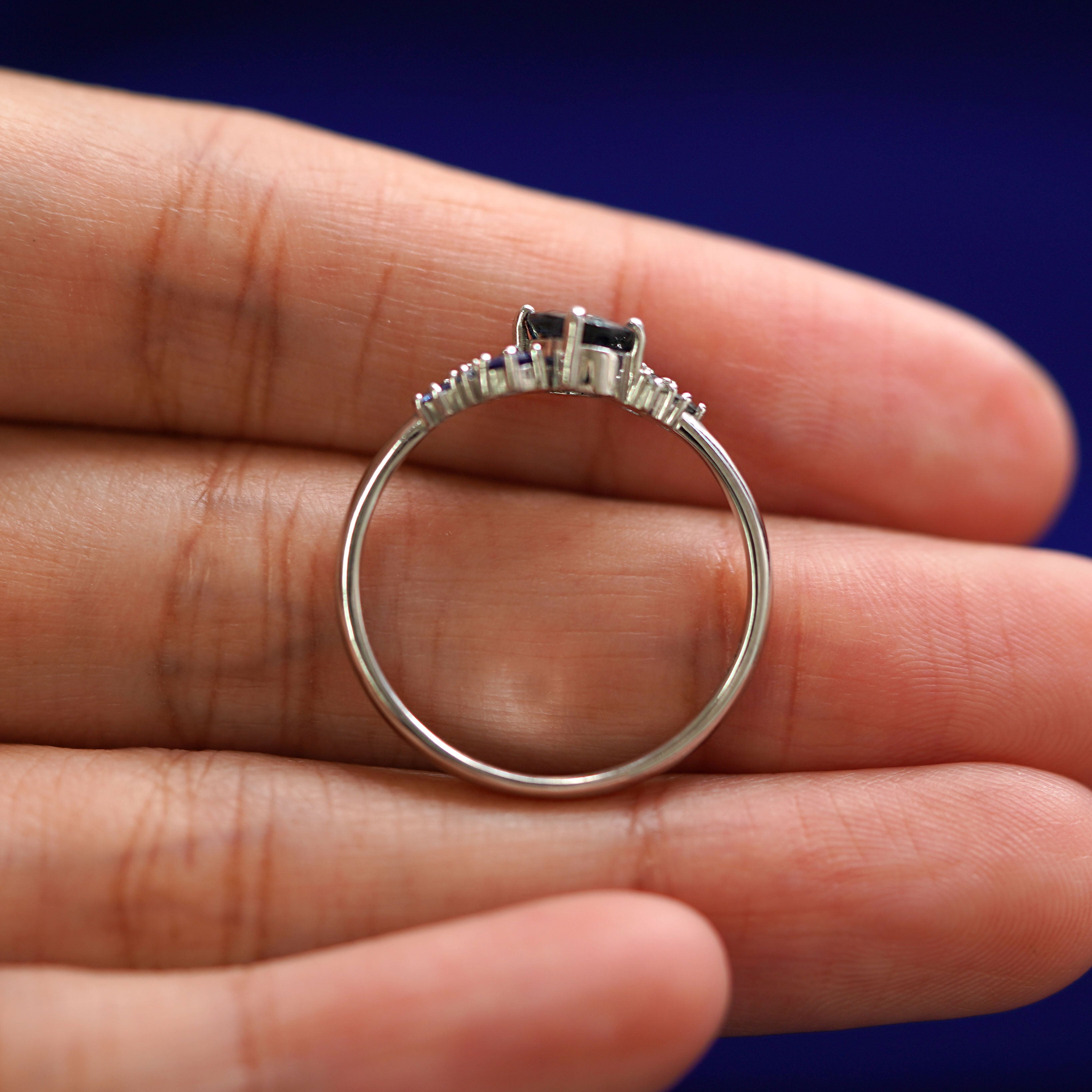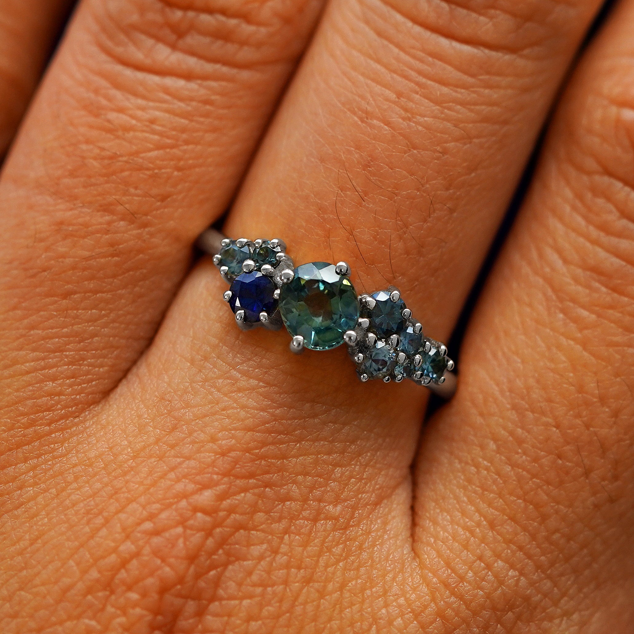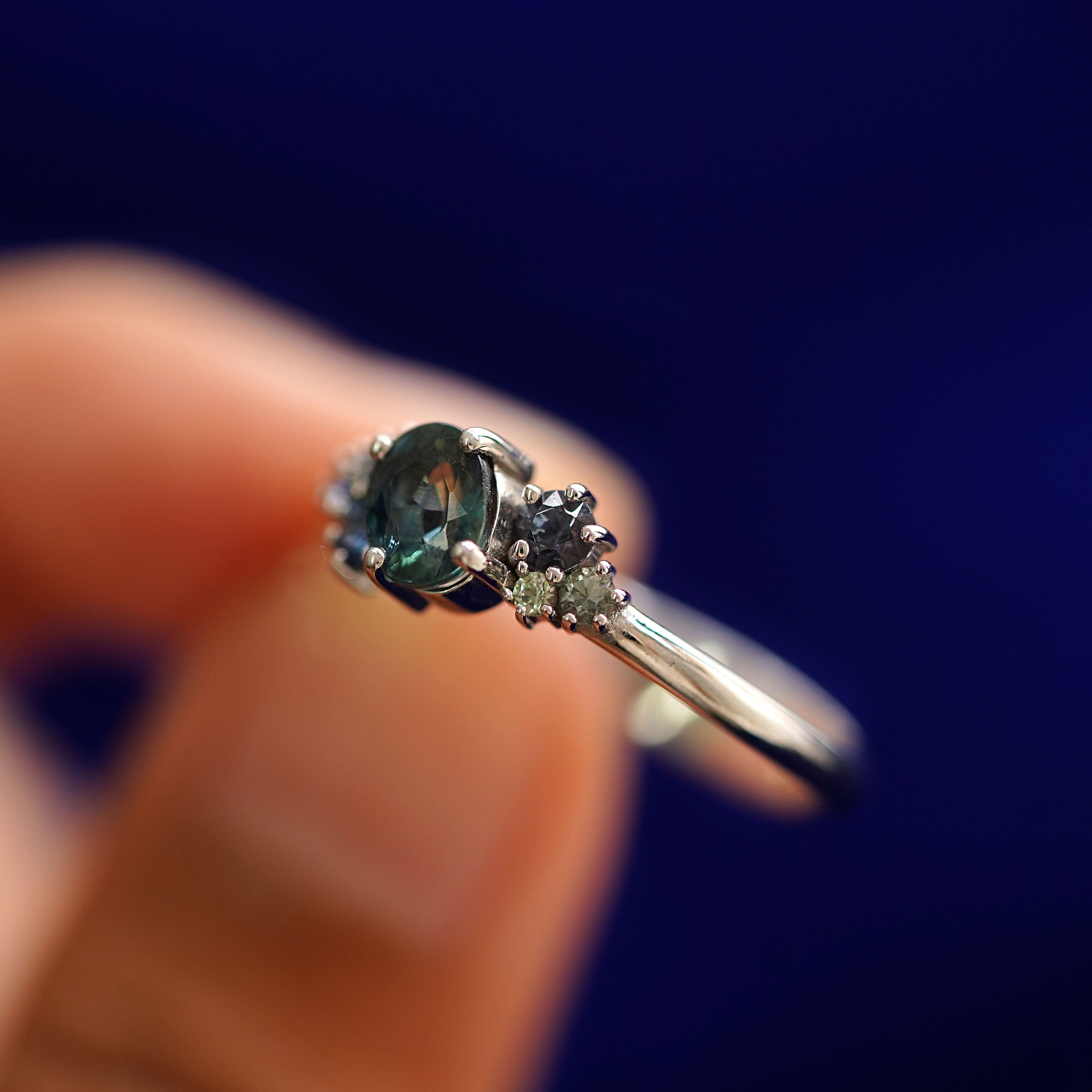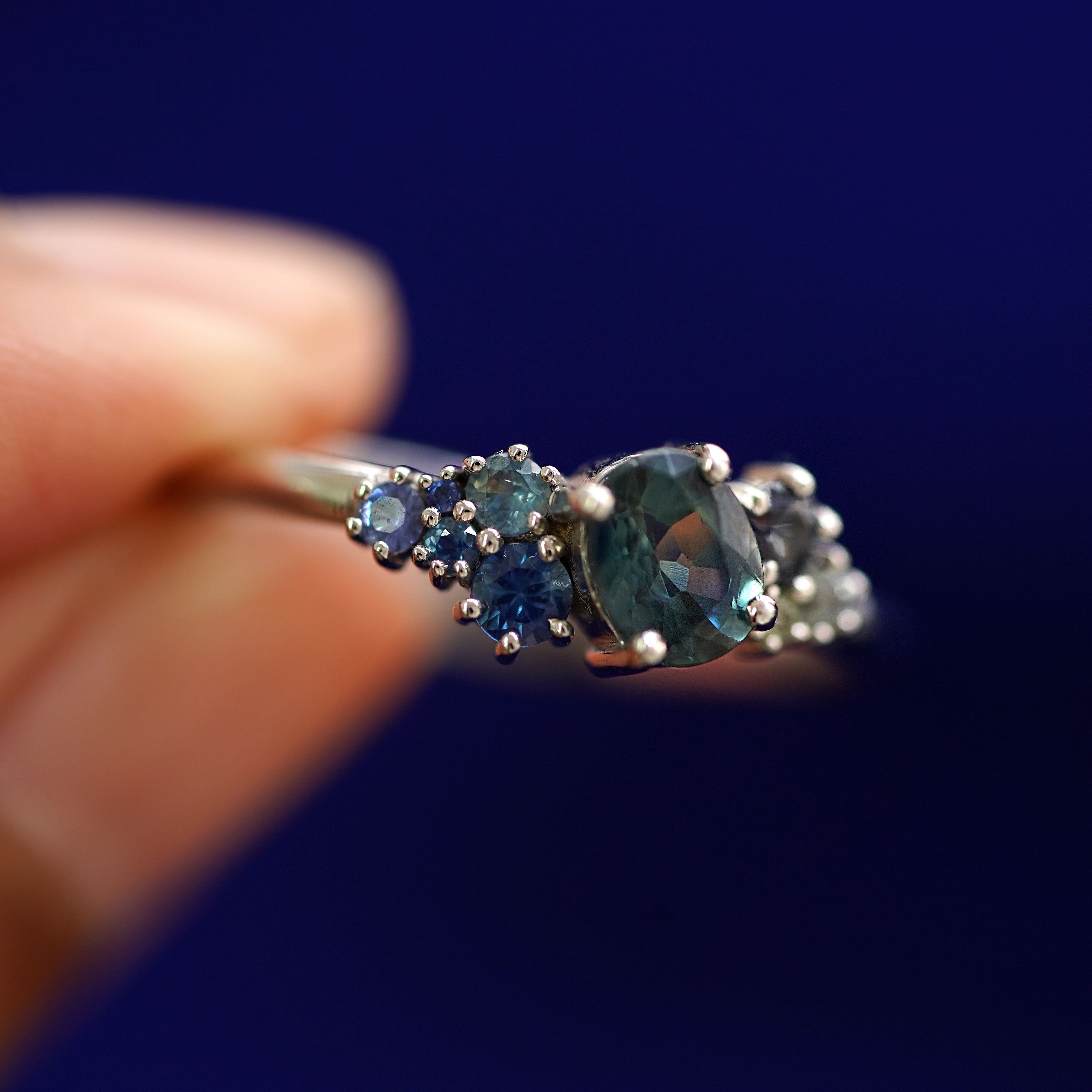 Sapphires are strong and gorgeous stones that come in every color of the rainbow! When our founder AL designed this collection, they wanted to showcase the stunning variety of blue-green-gray Montana sapphires that the mine is famous for. The center of this gemstone cluster ring holds a blue, teal, or green oval sapphire with green, purple, and blue sapphires on the sides for a gorgeous gradient. With such an interesting sophisticated look, this piece is a great genderless everyday ring or non-traditional engagement ring.