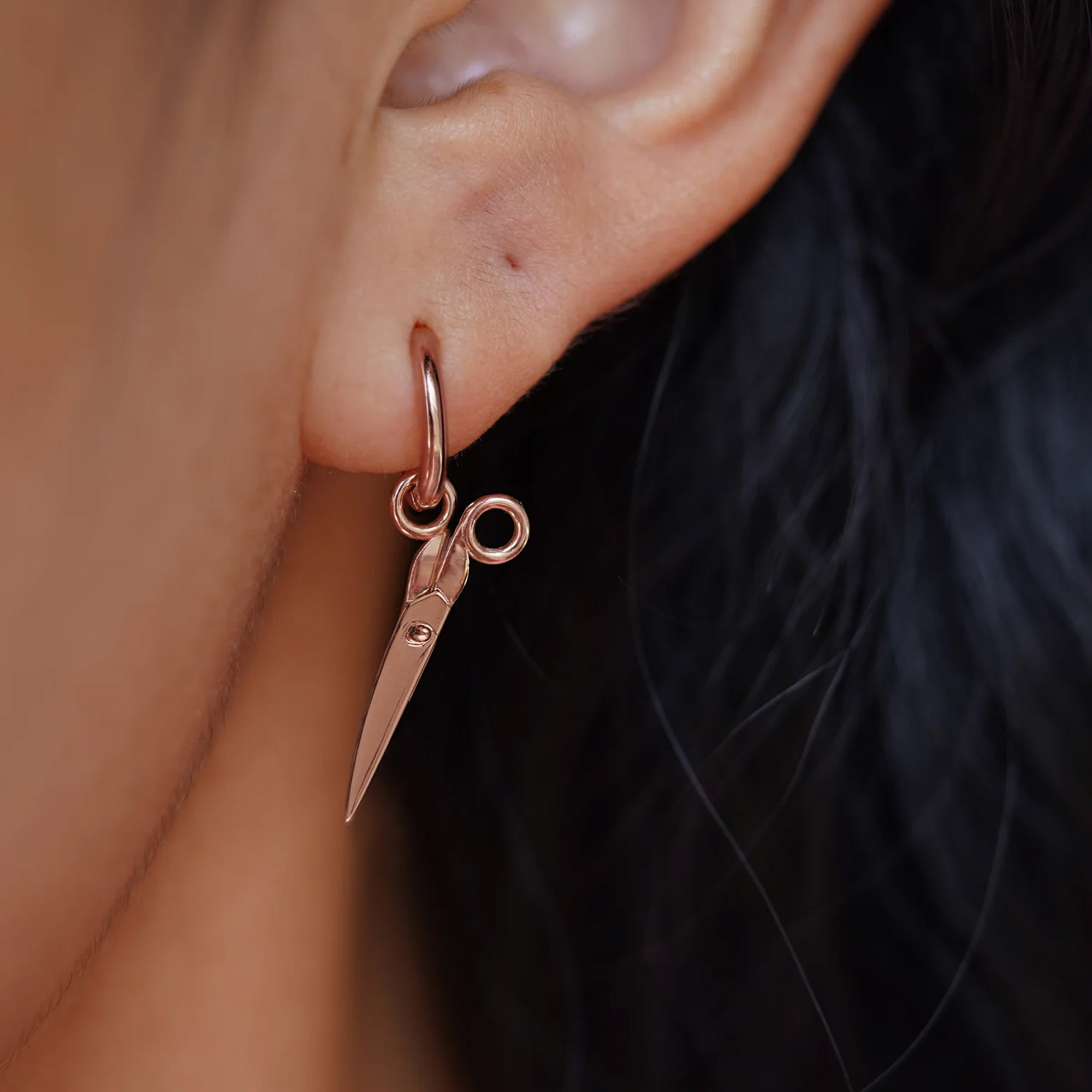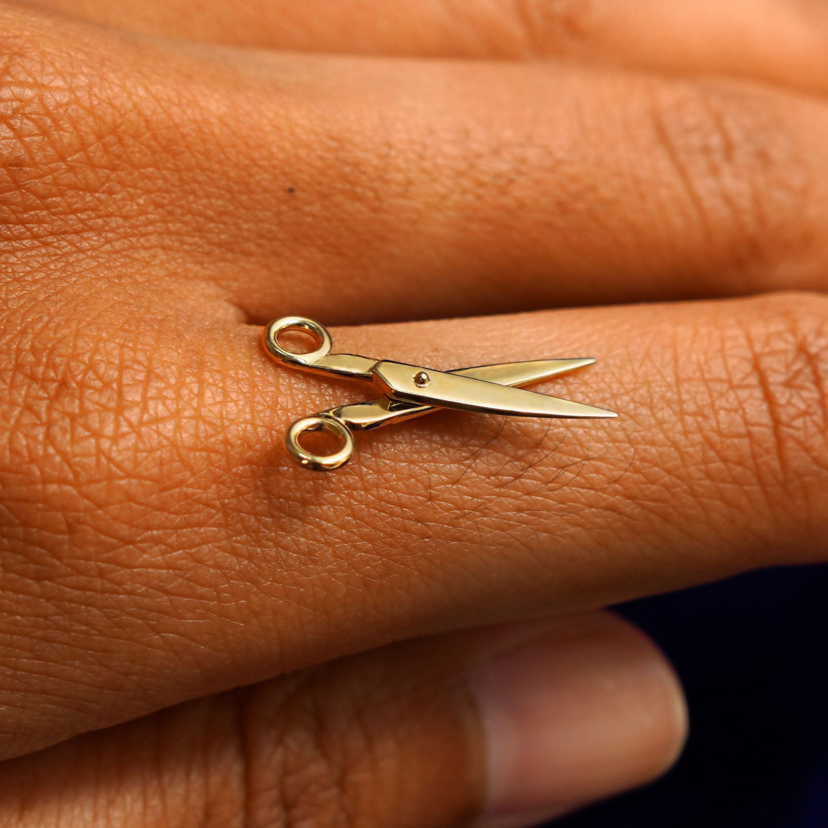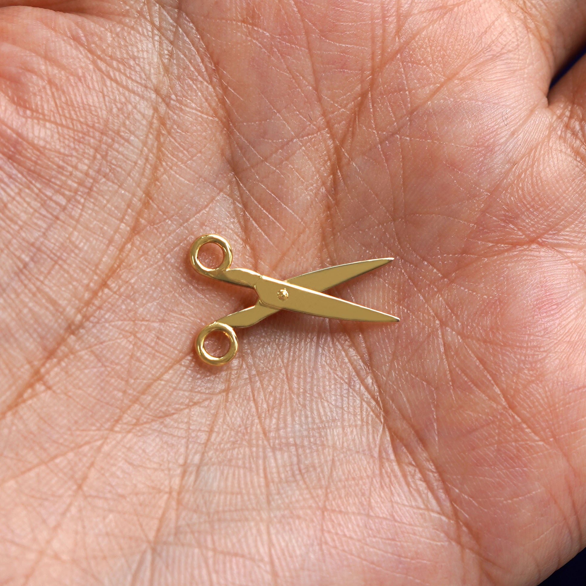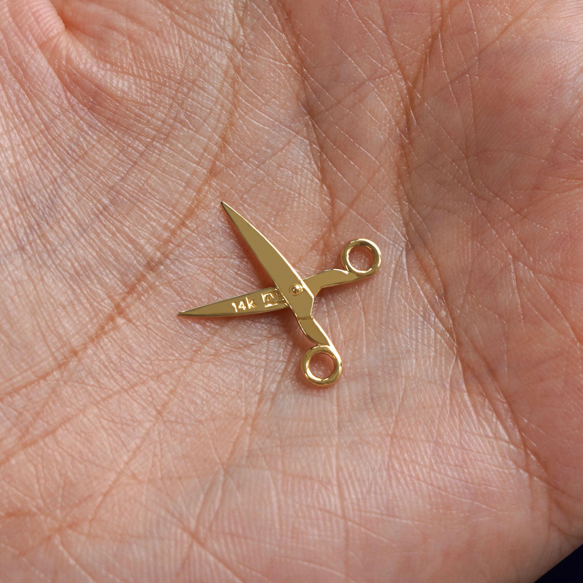 This 14 karat gold scissors charm is the perfect gift for any DIY lover, seamstress, hairstylist, or anyone who wants a subtle sapphic / lesbian charm. A golden pair of scissors that actually open and close, this solid gold jewelry piece is designed to be worn in multiple ways. Put this dainty, minimalist charm on a gold chain, on a hoop earring, or on a charm bracelet.