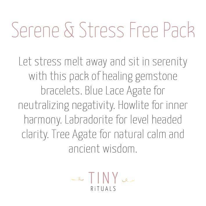 Say yes to serene living and cut out the stress factor with this special pack of serenity gemstone bracelets. Calling on the calm and nurturing nature of gentle Blue Lace Agate, heavenly Howlite, the mystical light of Labradorite, and the tried and tested natural power of Tree Agate, together this pack is perfect harmony.