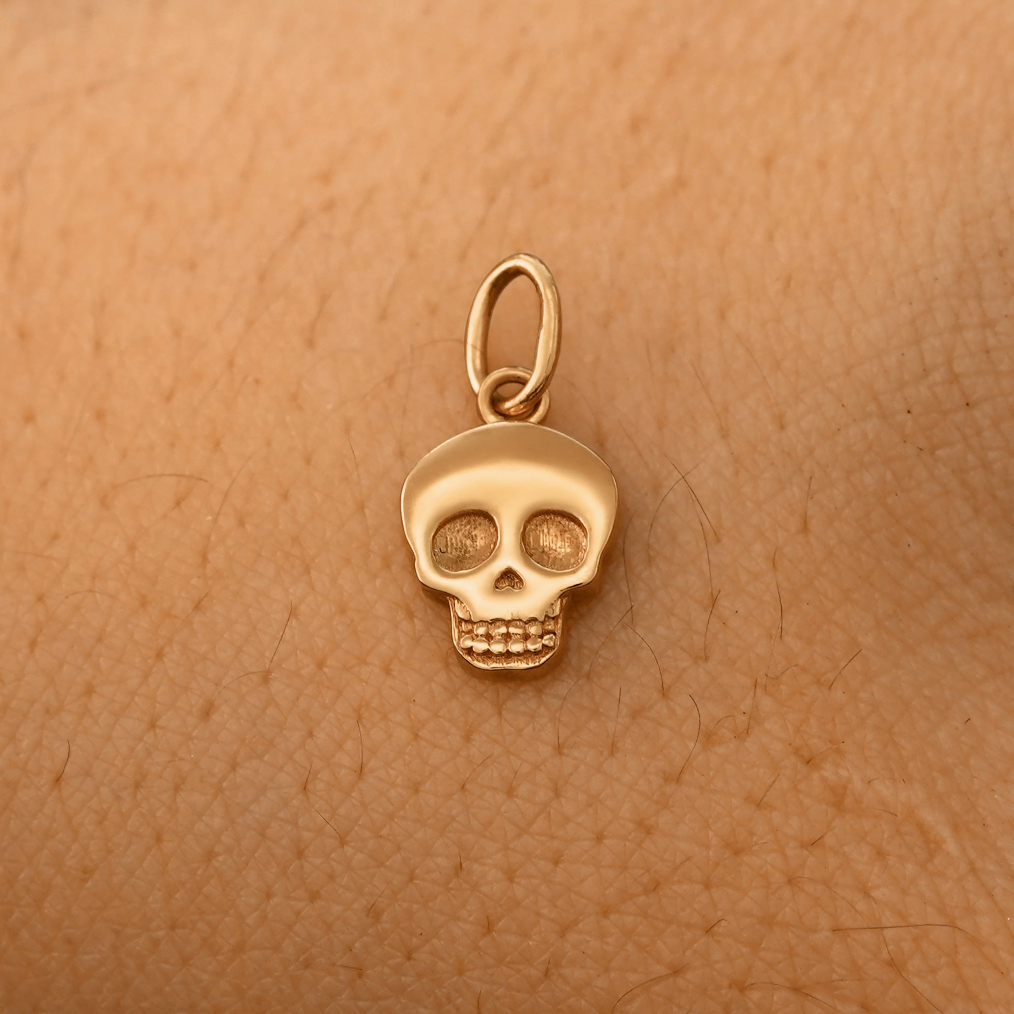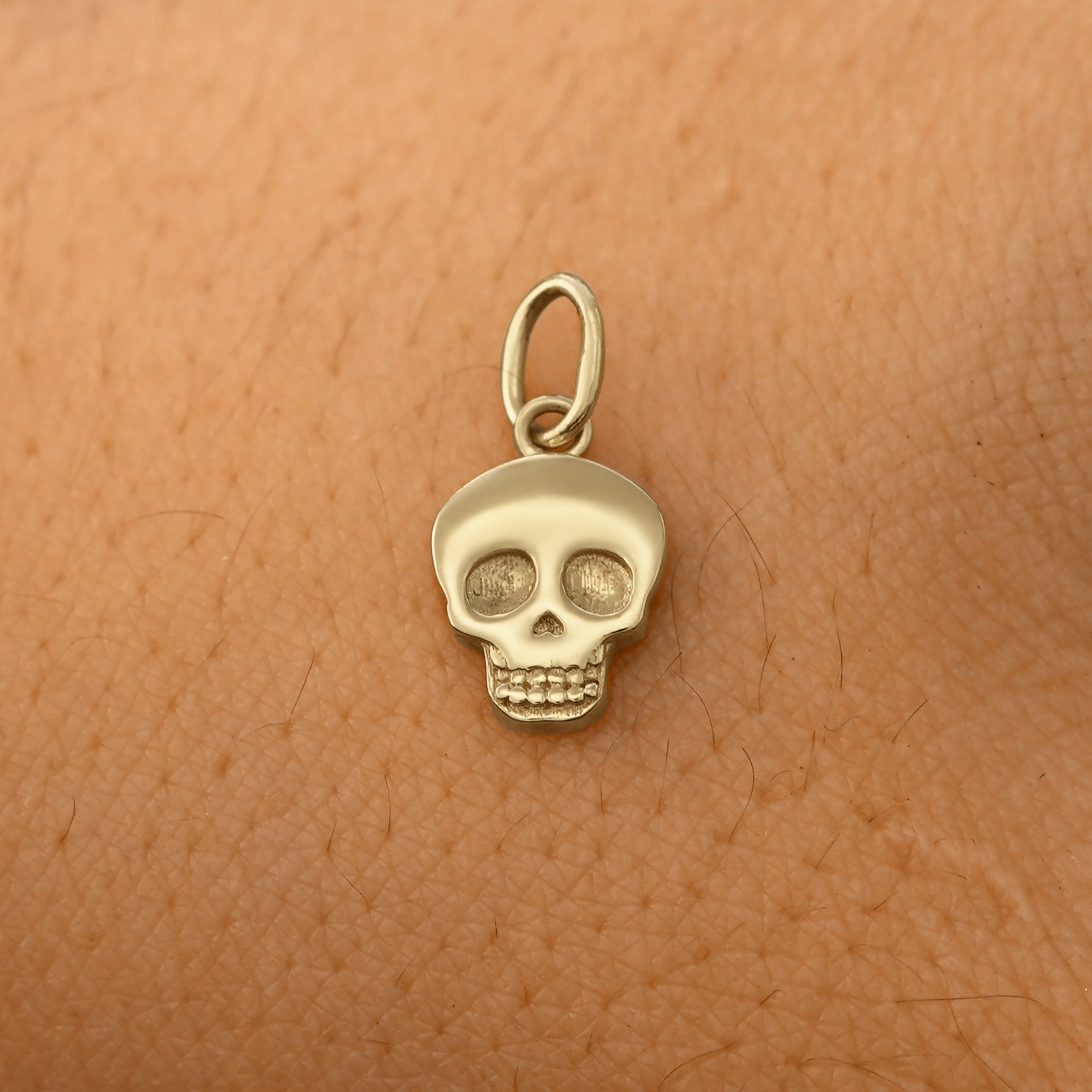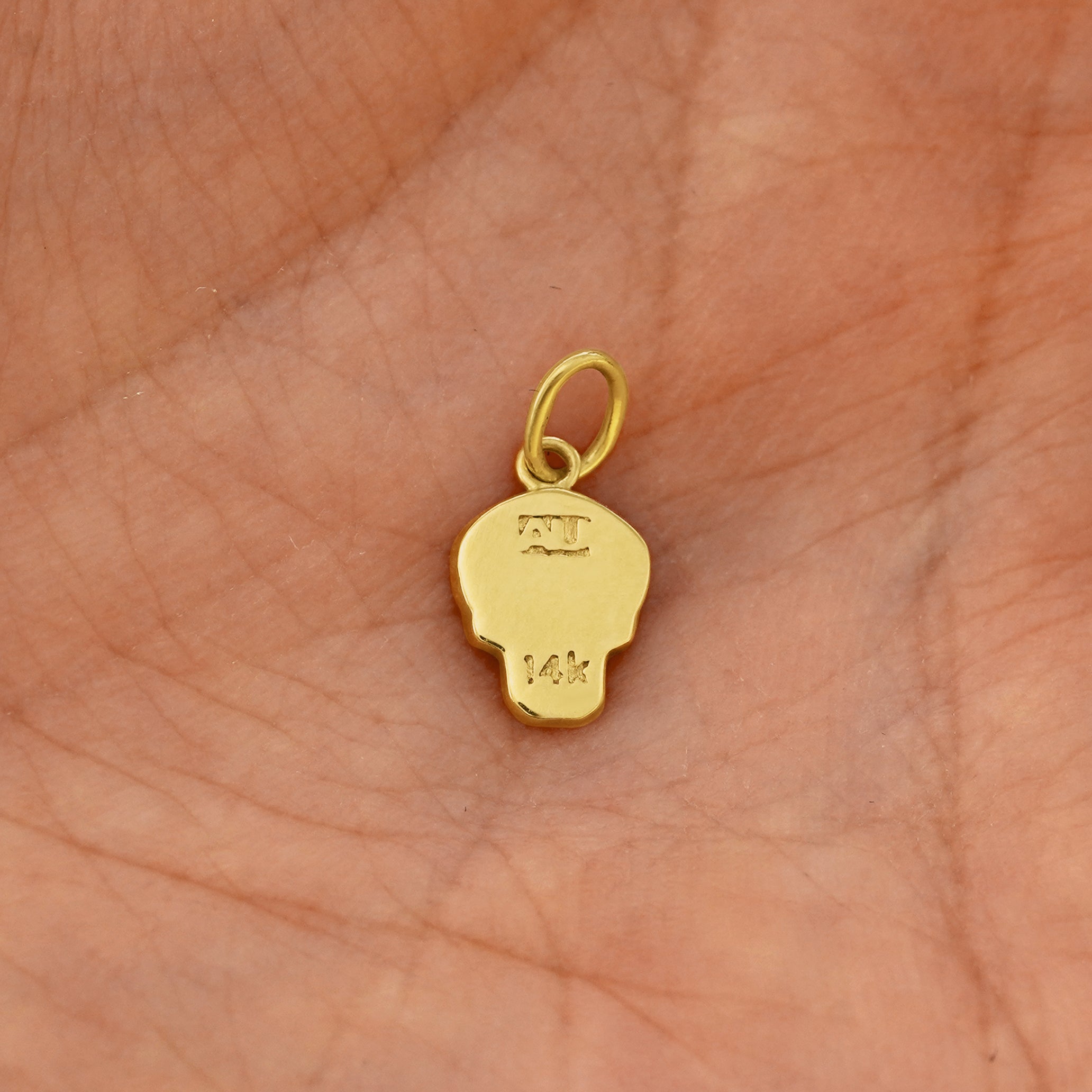 Edgy and chic, this skull charm is the perfect piece to add to your collection. This 14k solid gold charm is in the shape of a skull with cool details in the eyes and teeth that make it stand out on your hoops, chain, or bracelet.