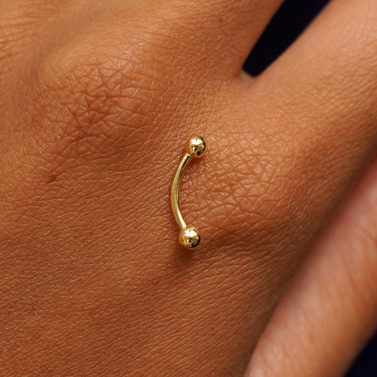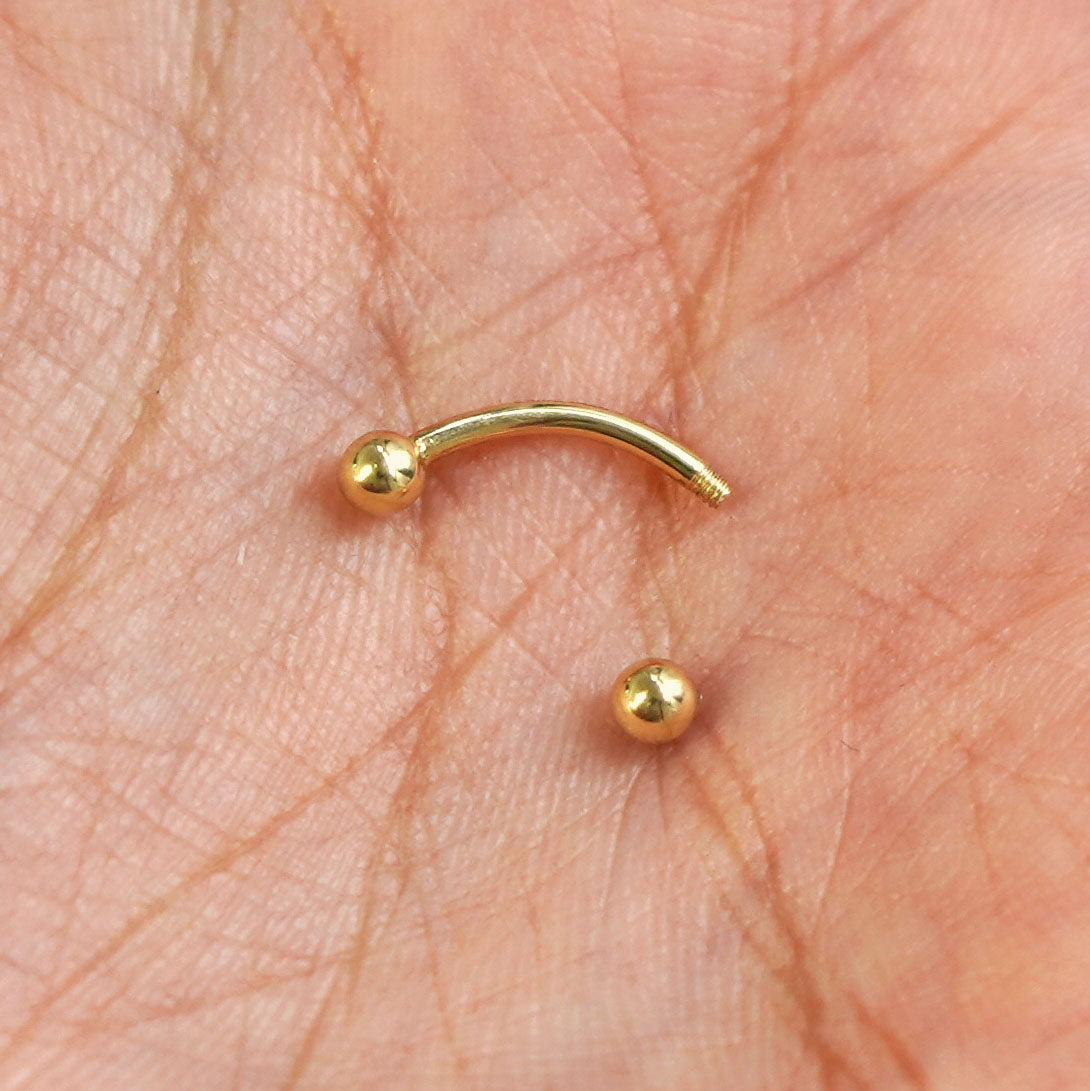 This tiny curved barbell packs an edgy punch. Strong and solid, this 14k gold piercing is perfect for your rook, eyebrow, vertical labret, daith, anti-tragus, or wherever! You’ll never want to take off your cute gold body jewelry.