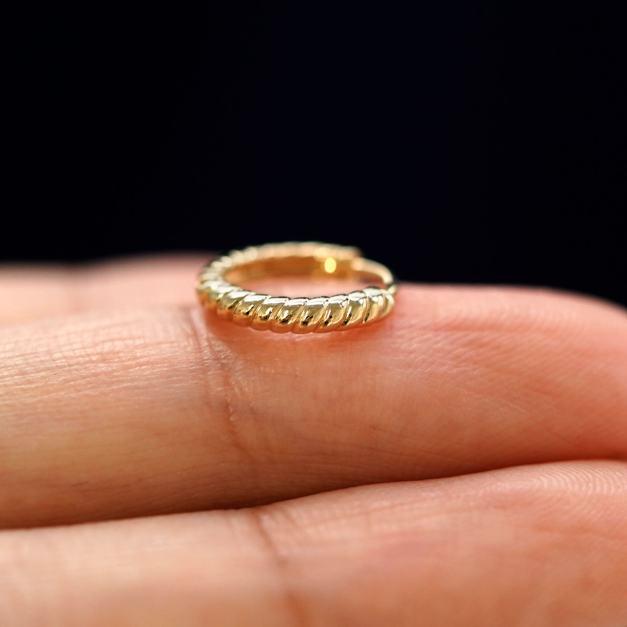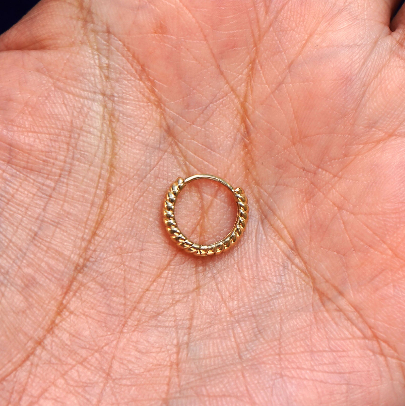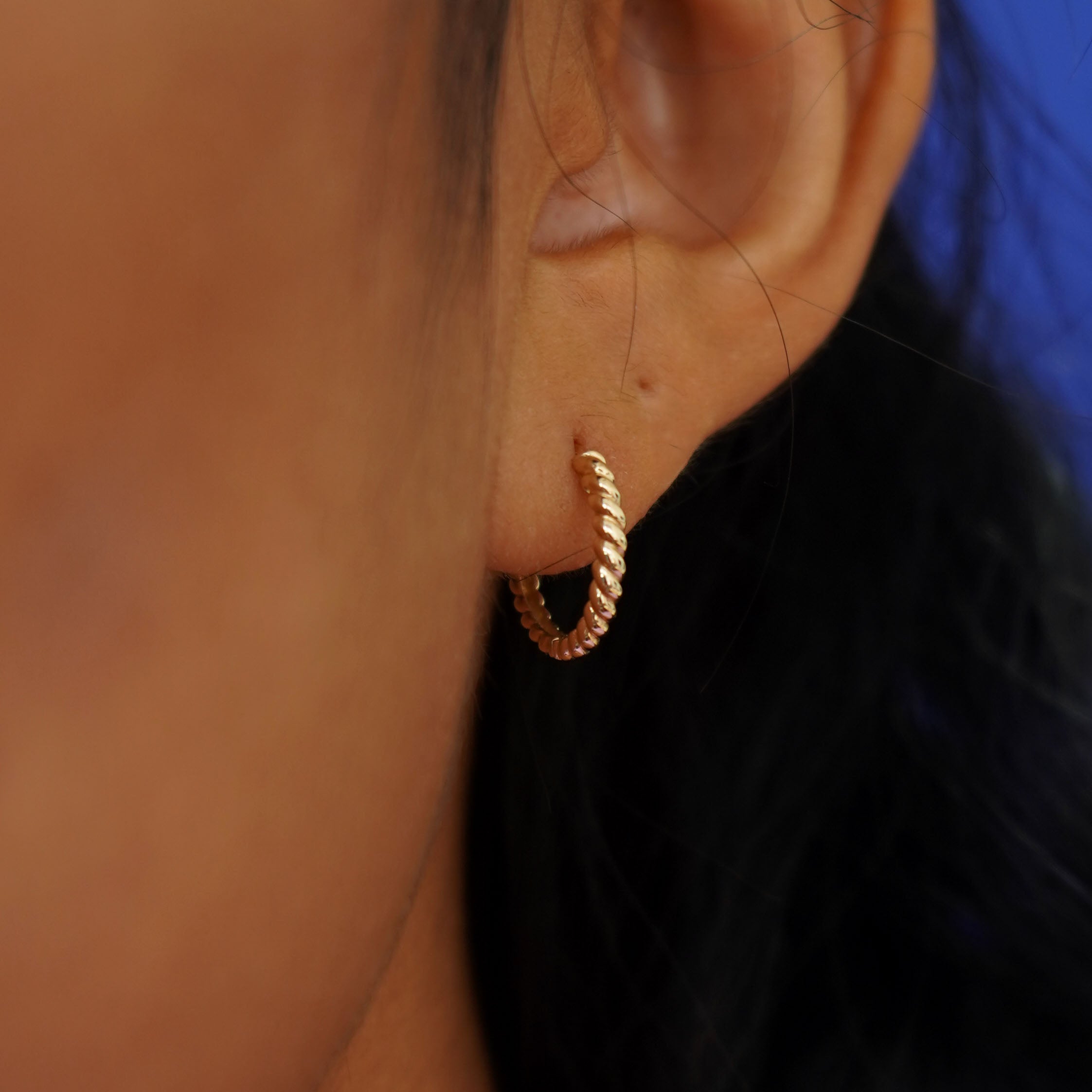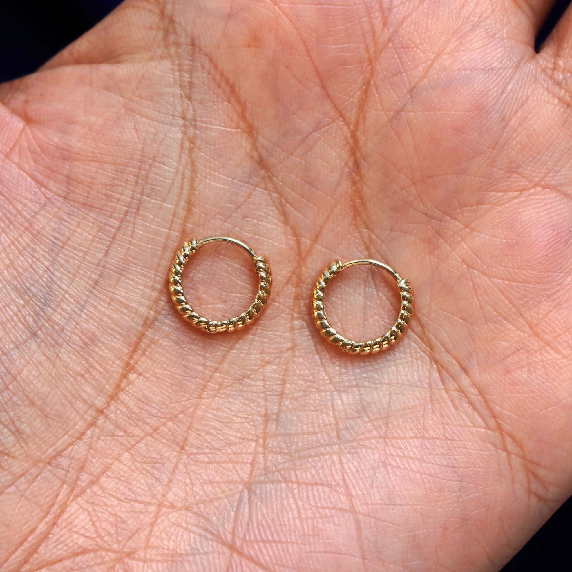 The perfect elegant twist to a pair of classic 14k solid gold hoops. These rope detail on these small gold clicker hoops lets these minimalist earrings shine. Close these tiny huggie earrings with a click and wear them everyday.