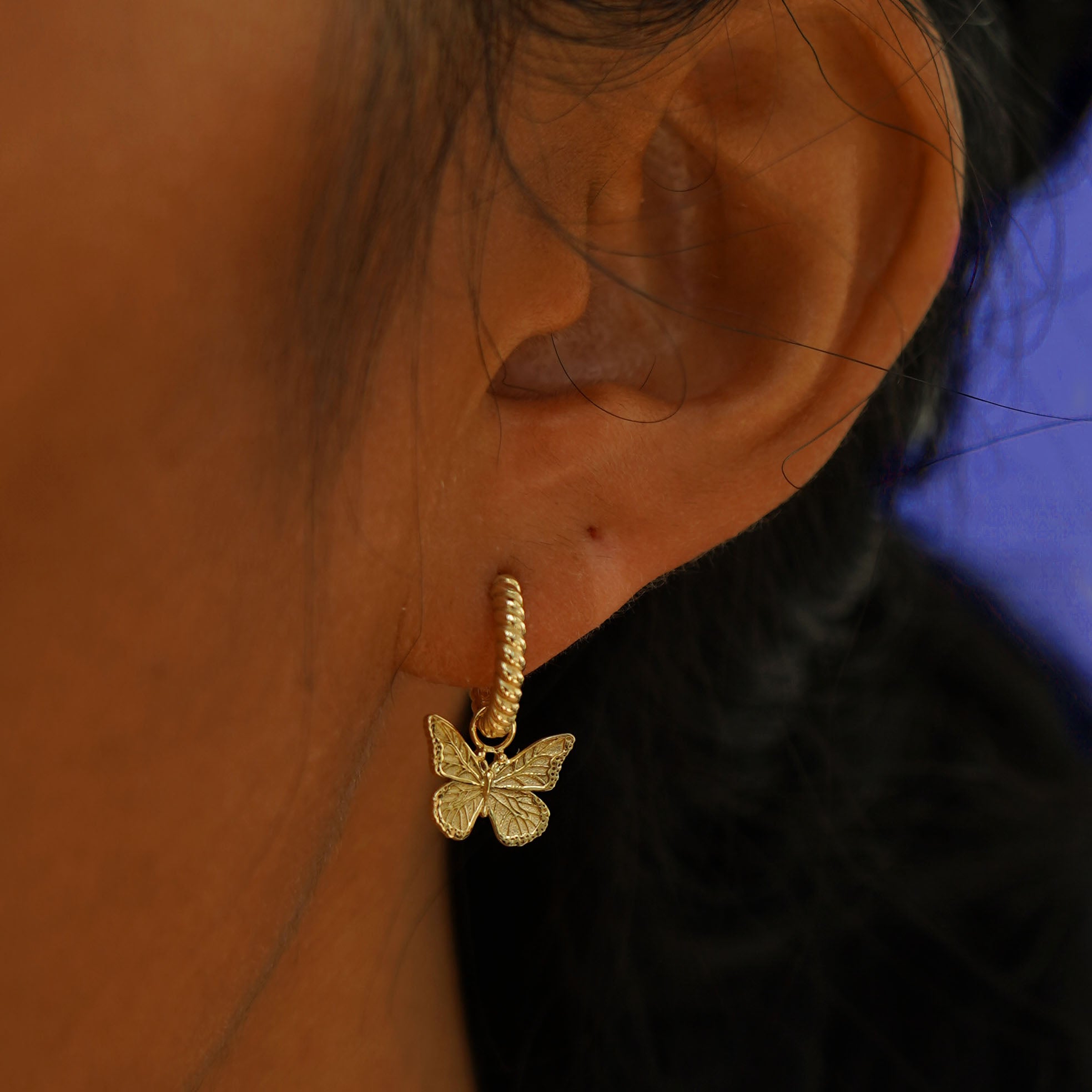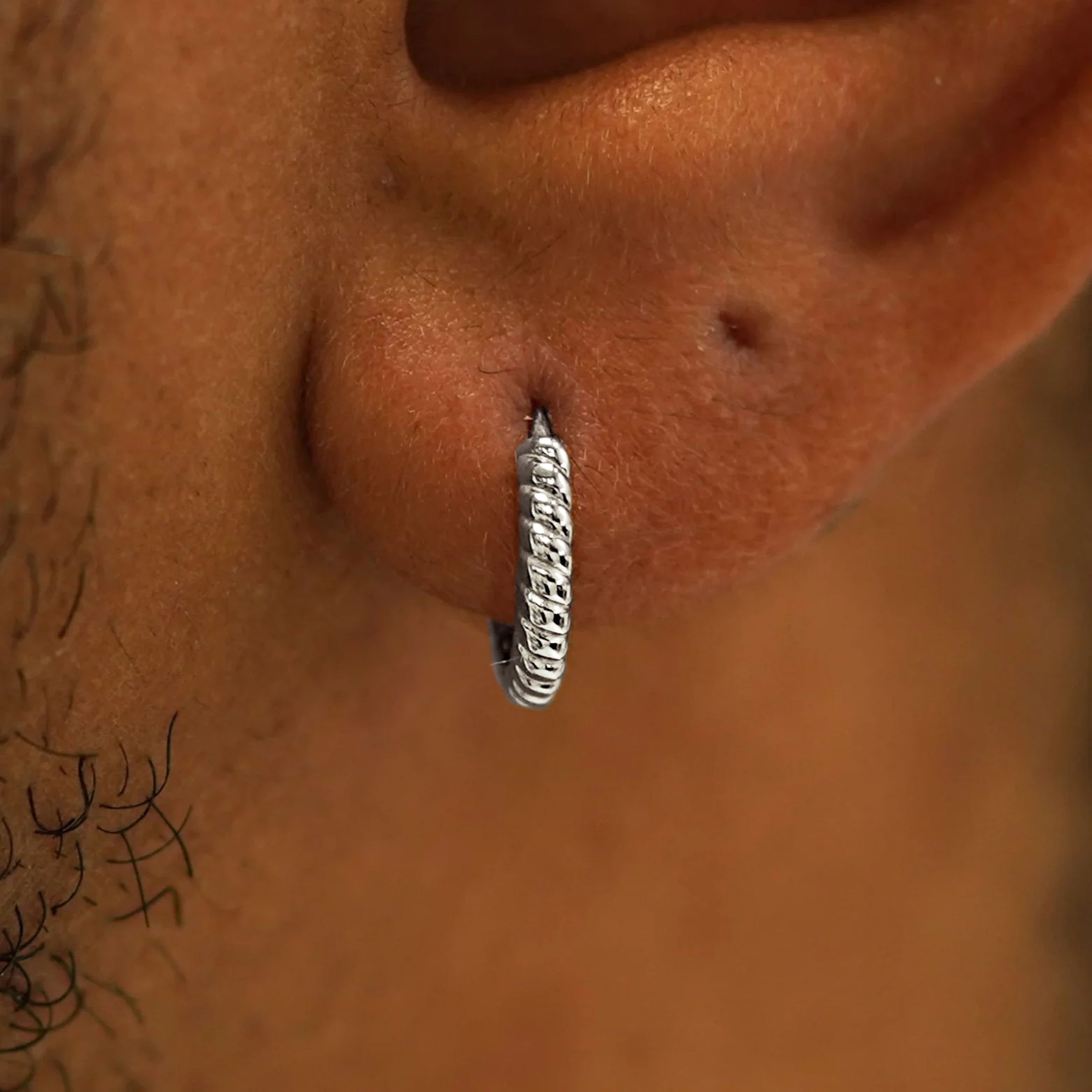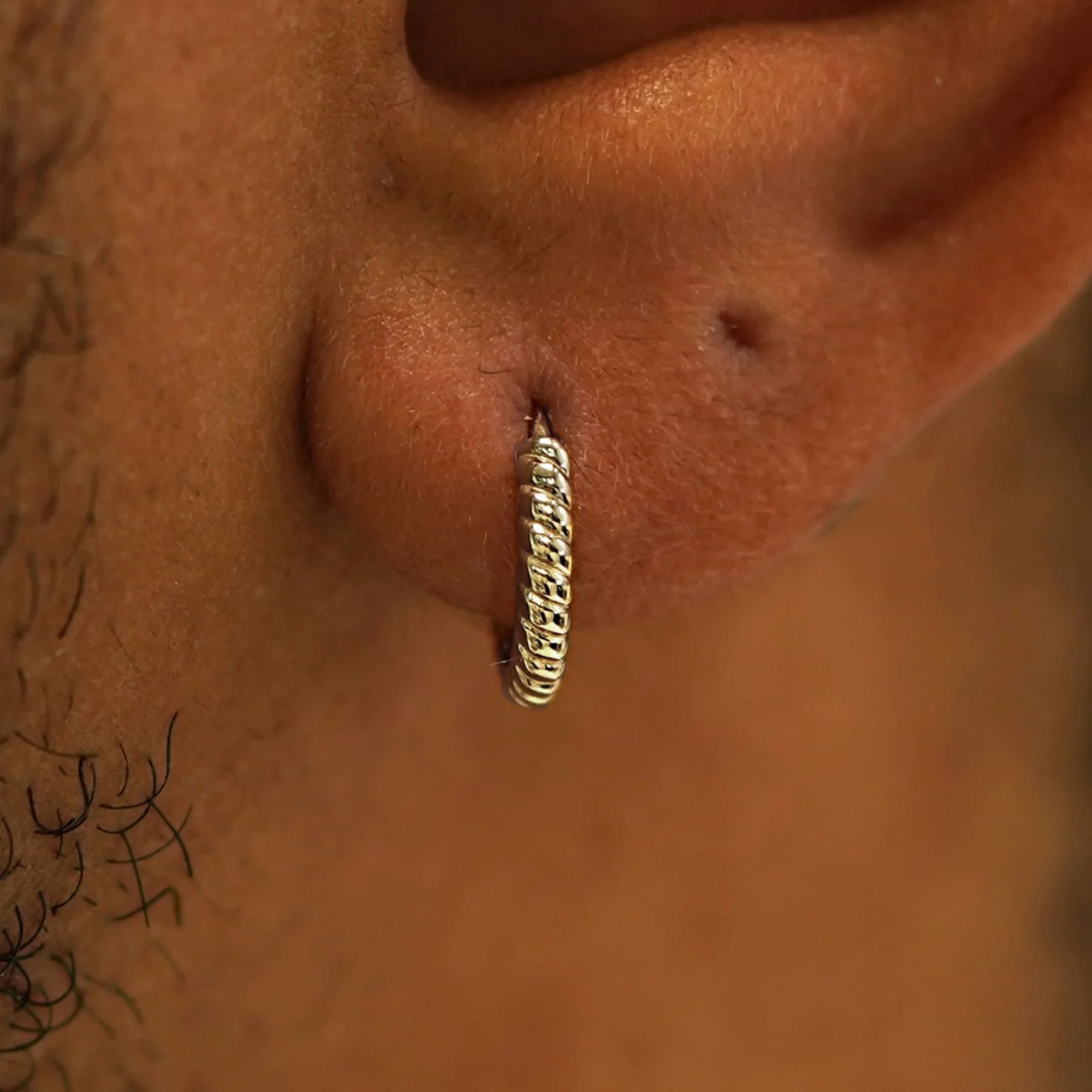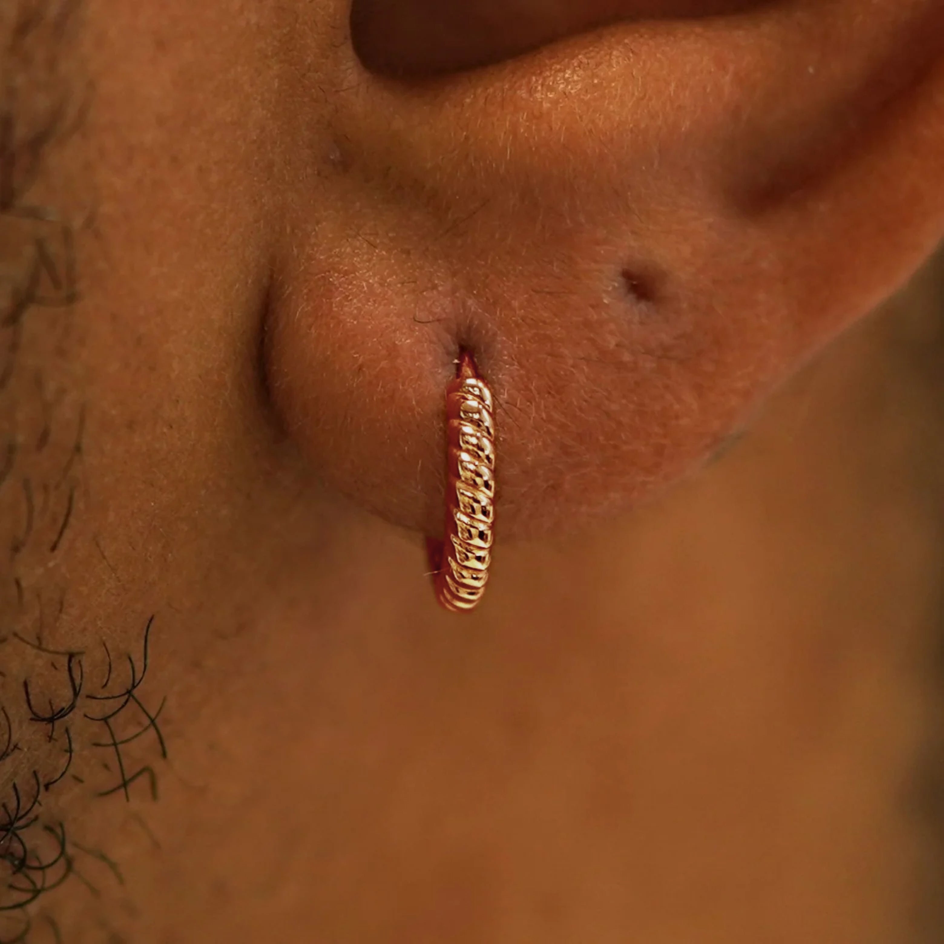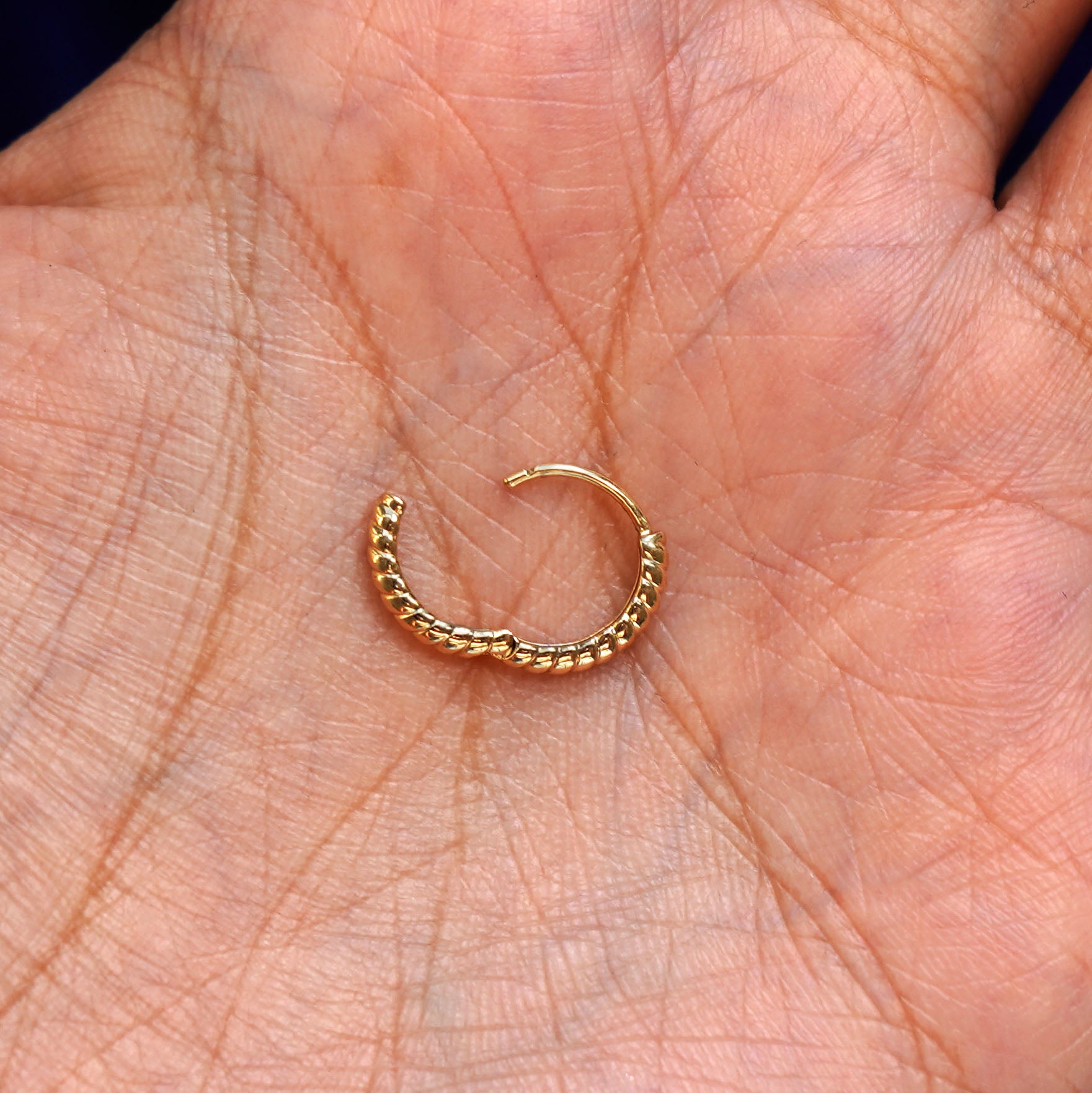 The perfect elegant twist to a pair of classic 14k solid gold hoops. These rope detail on these small gold clicker hoops lets these minimalist earrings shine. Close these tiny huggie earrings with a click and wear them everyday.