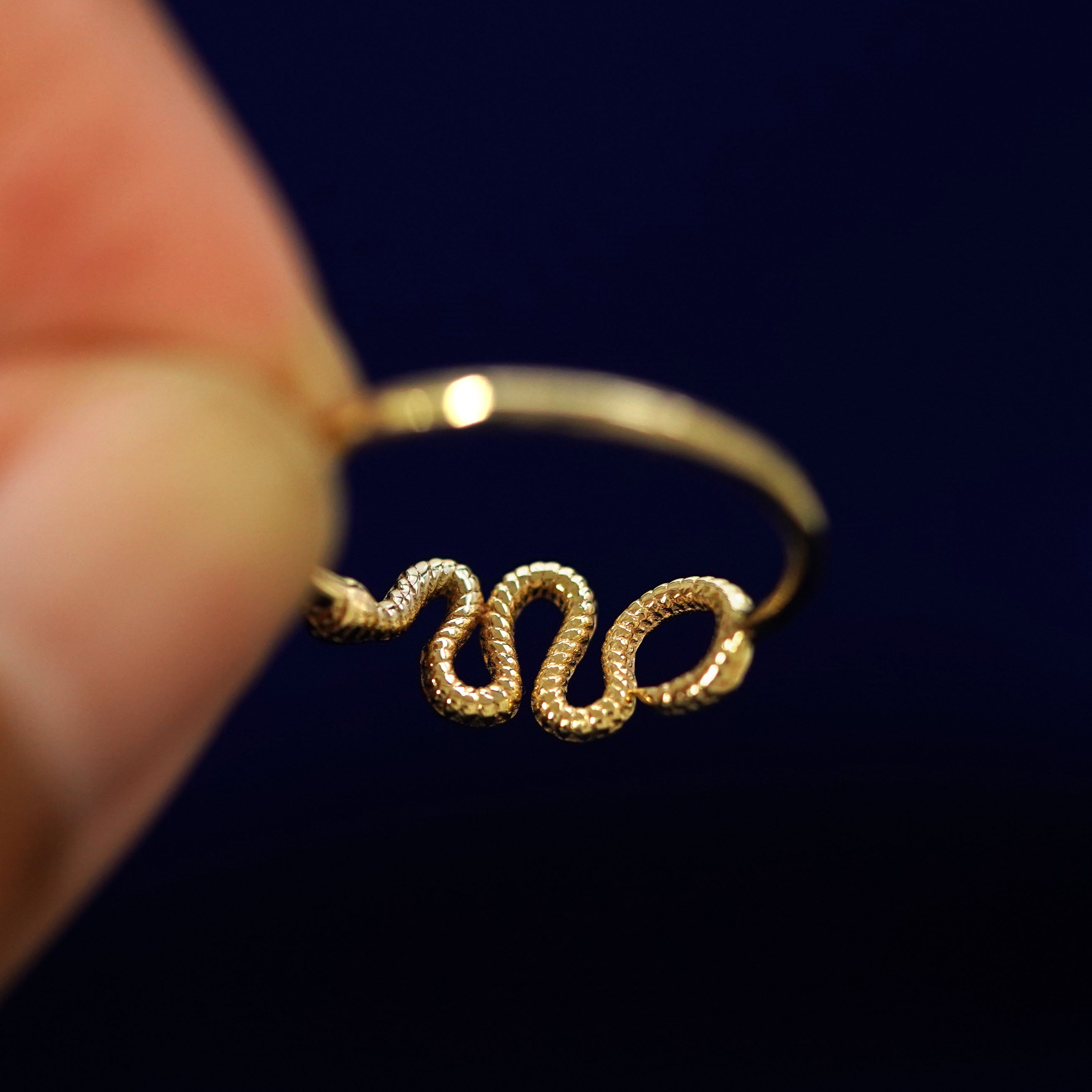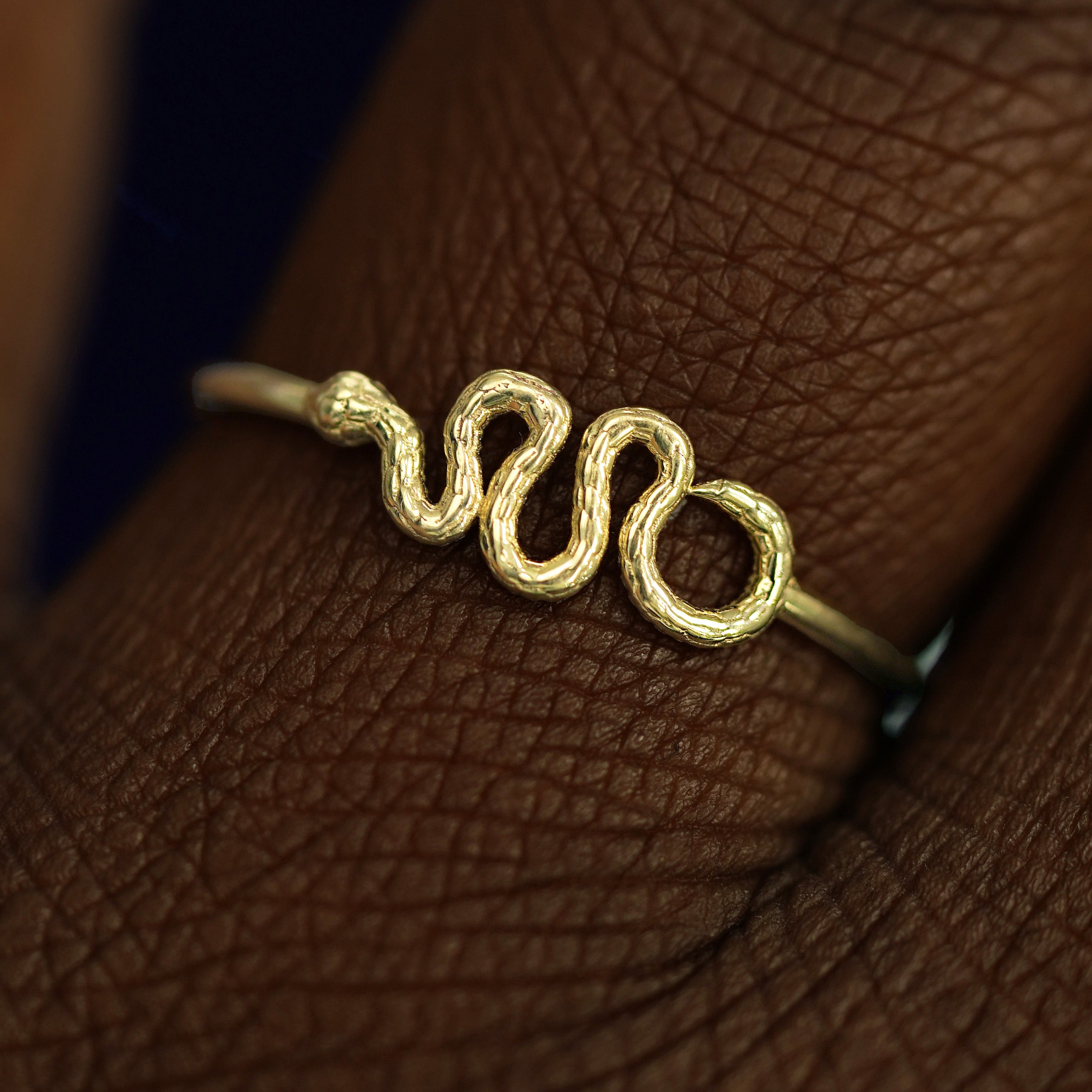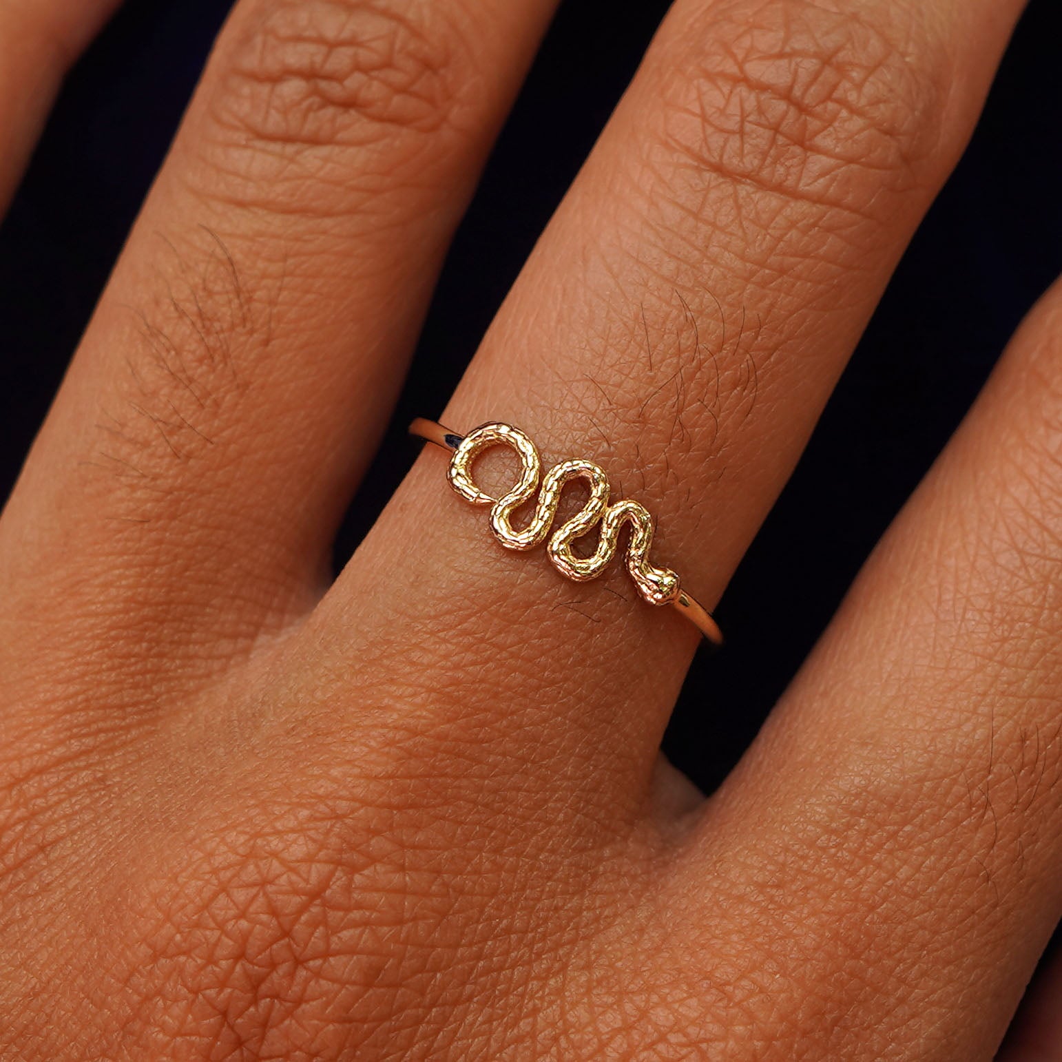 Show off your wild side with this dainty snake ring. This sensational serpent ring is cast in 14k solid gold and incredibly detailed. Comfortable and stylish, this minimalist ring is perfect for stacking with our other gold rings.