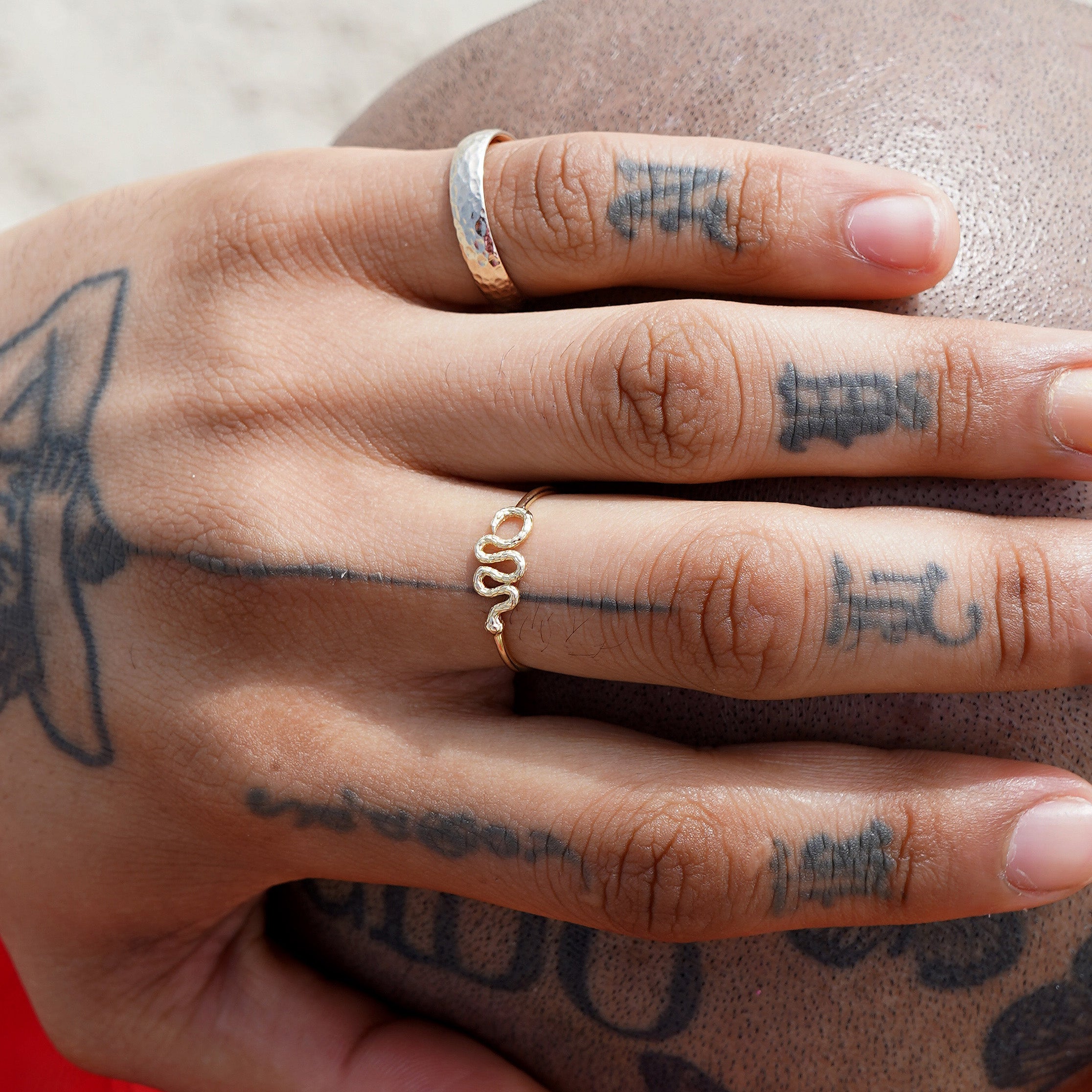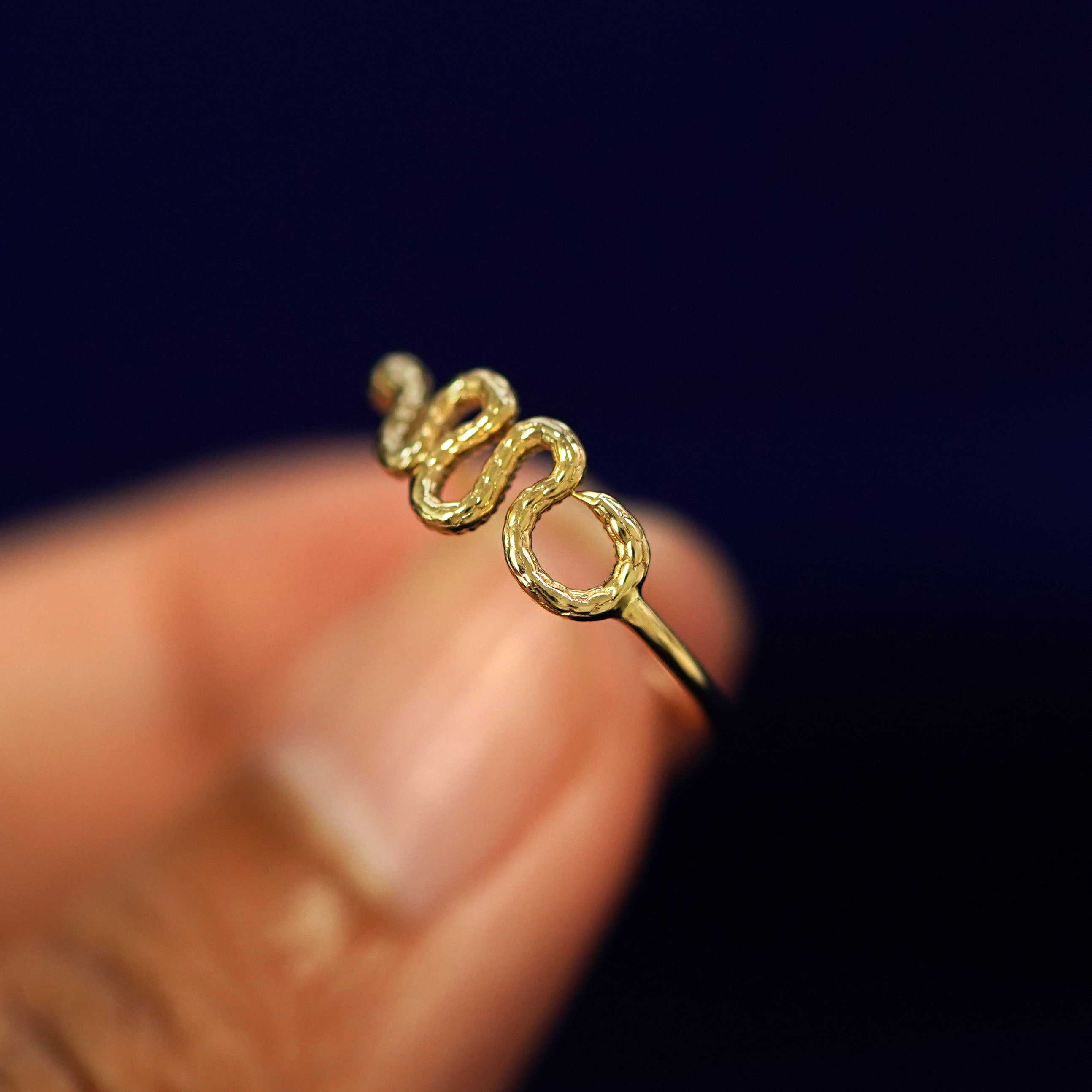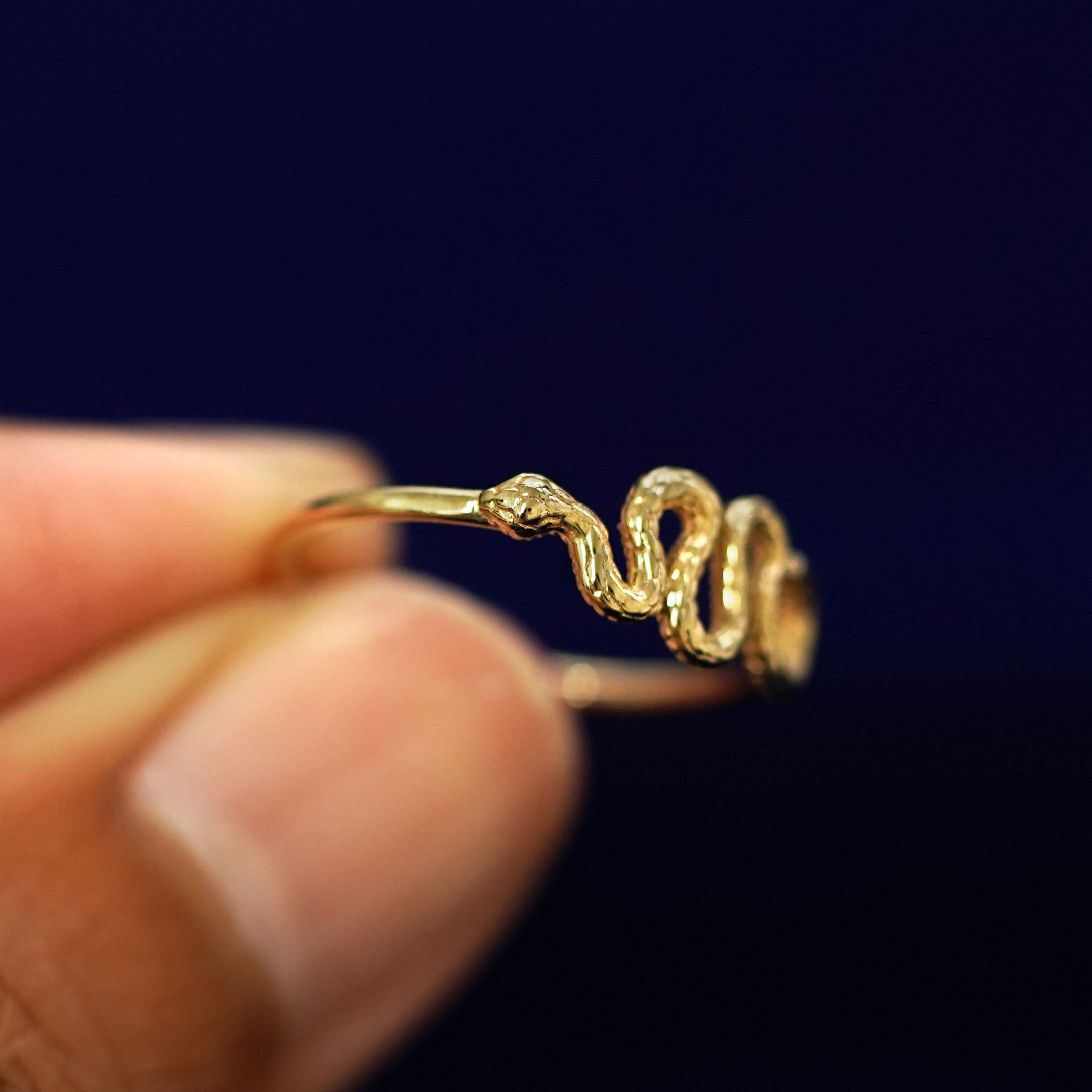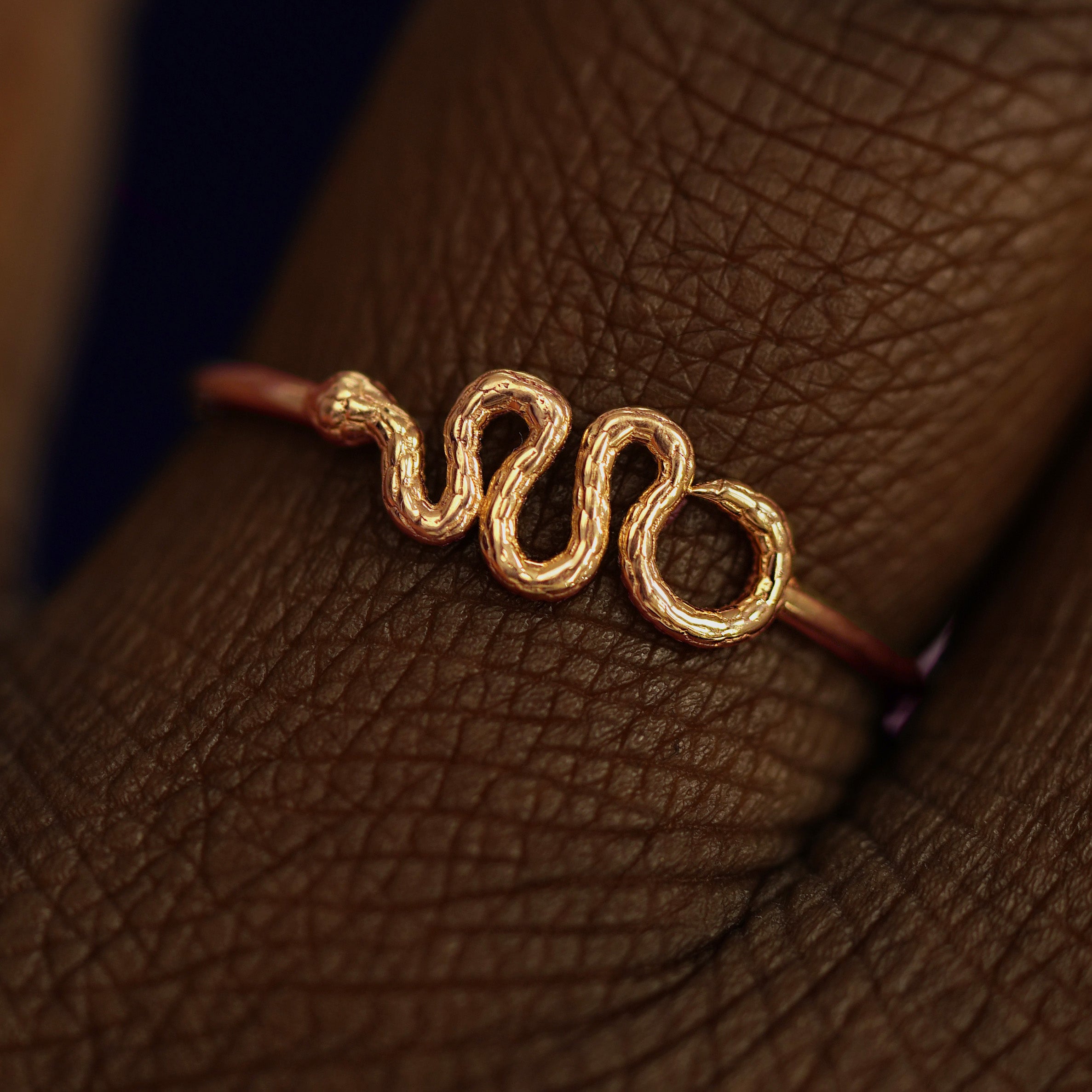 Show off your wild side with this dainty snake ring. This sensational serpent ring is cast in 14k solid gold and incredibly detailed. Comfortable and stylish, this minimalist ring is perfect for stacking with our other gold rings.