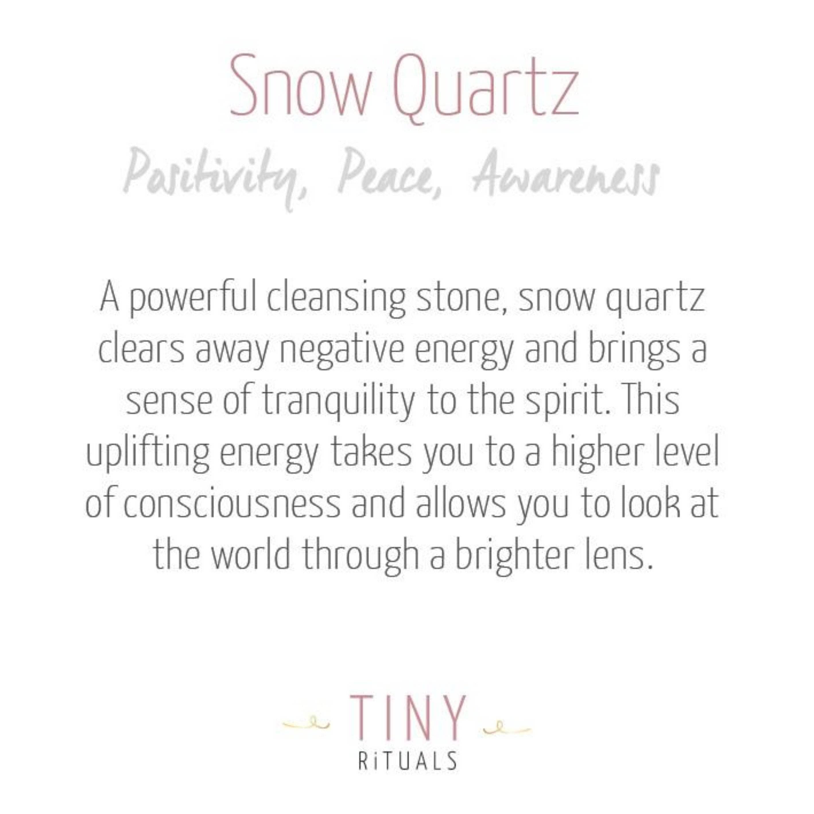 Snow Quartz is a powerful cleansing stone and can coat the heart with a blanket of beauty, clearing away negative footprints and bringing a sense of stillness to the spirit. A crown chakra stone, the milky glow of Snow Quartz is also known for its ability to take you to a higher level of consciousness. Its gift of seeing the world through brighter eyes opens your whole body and being to receive whatever the universe needs to give you.