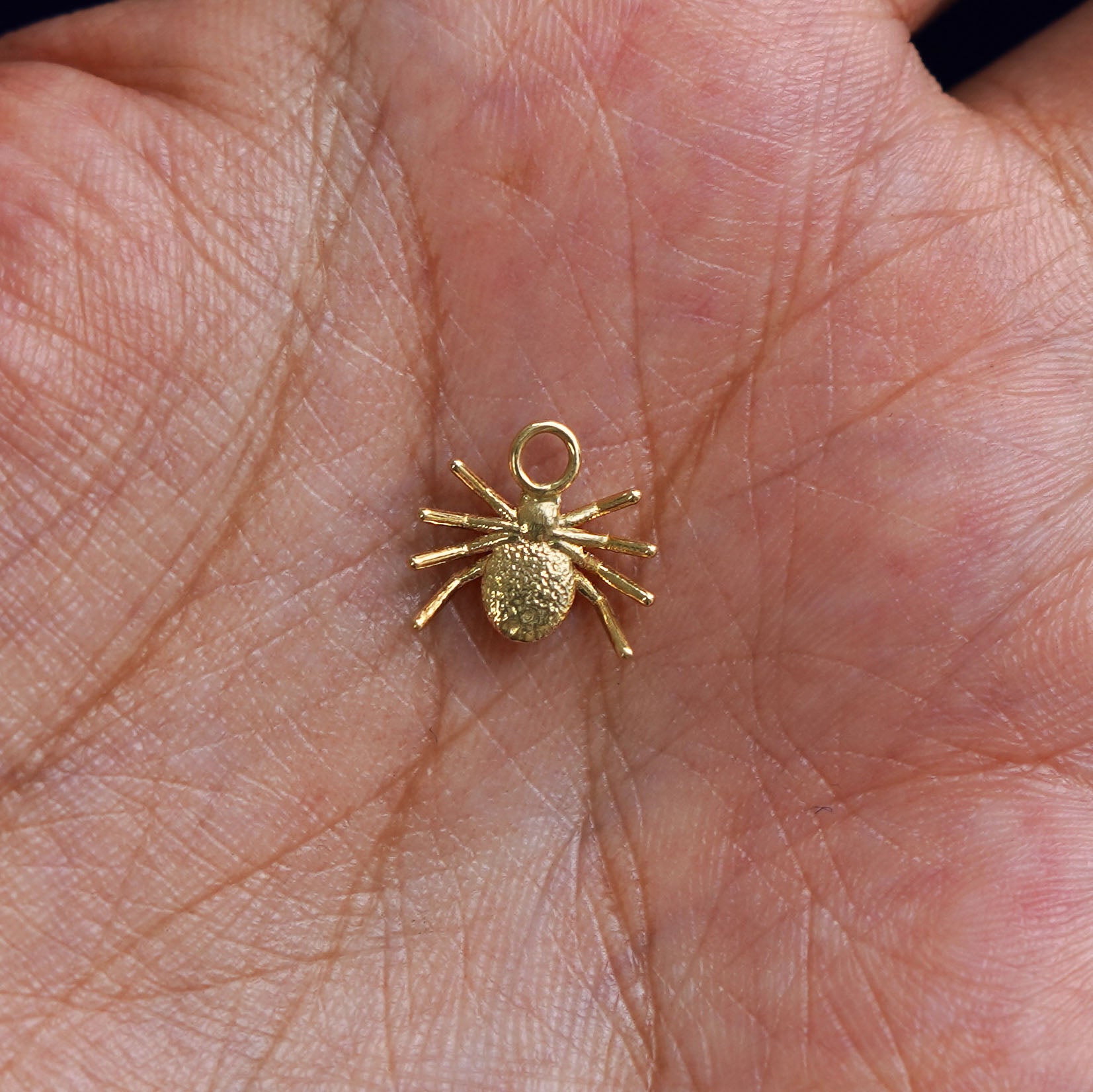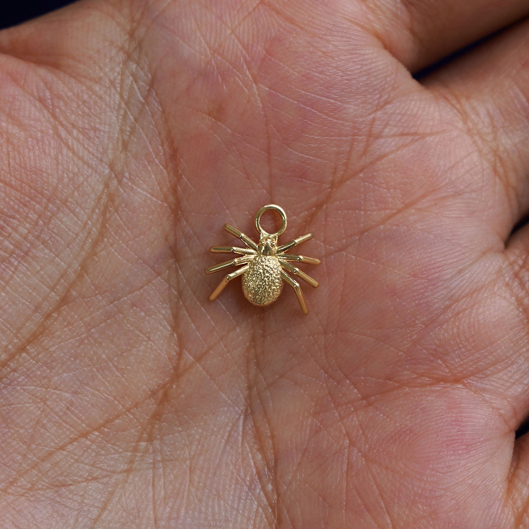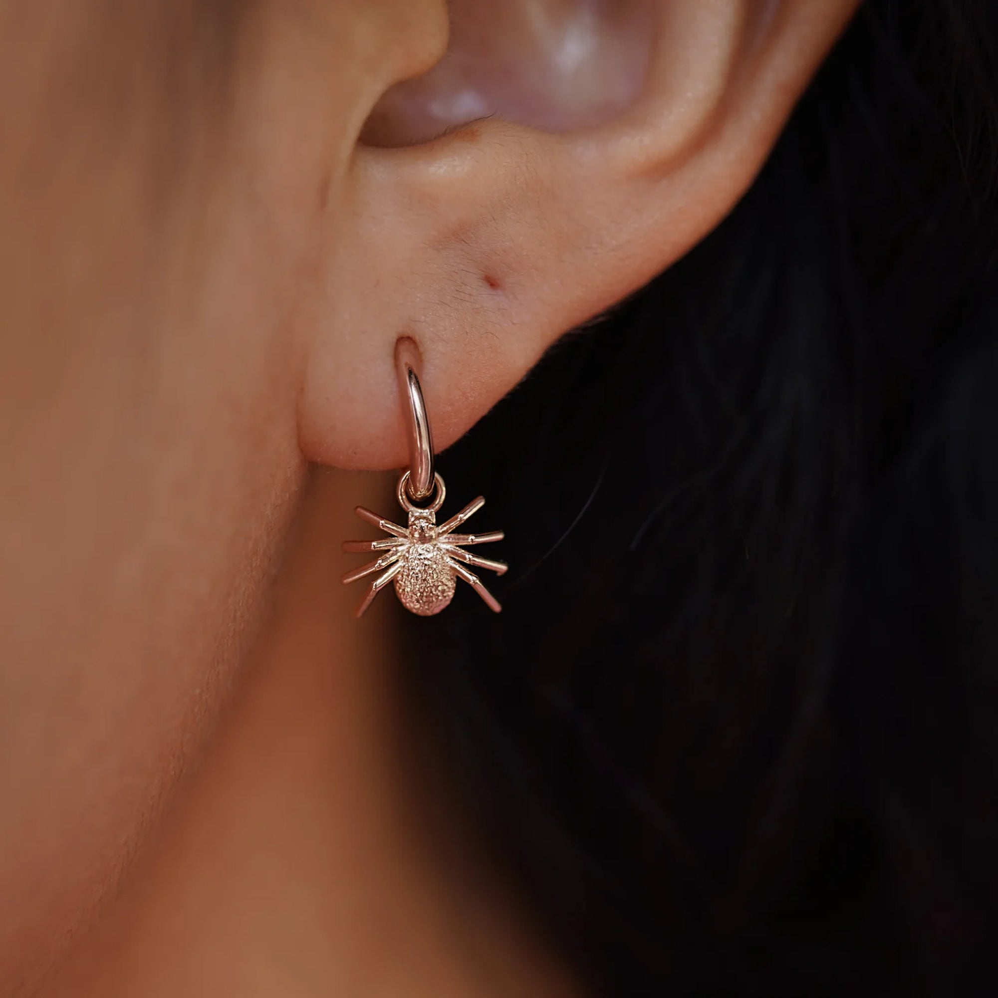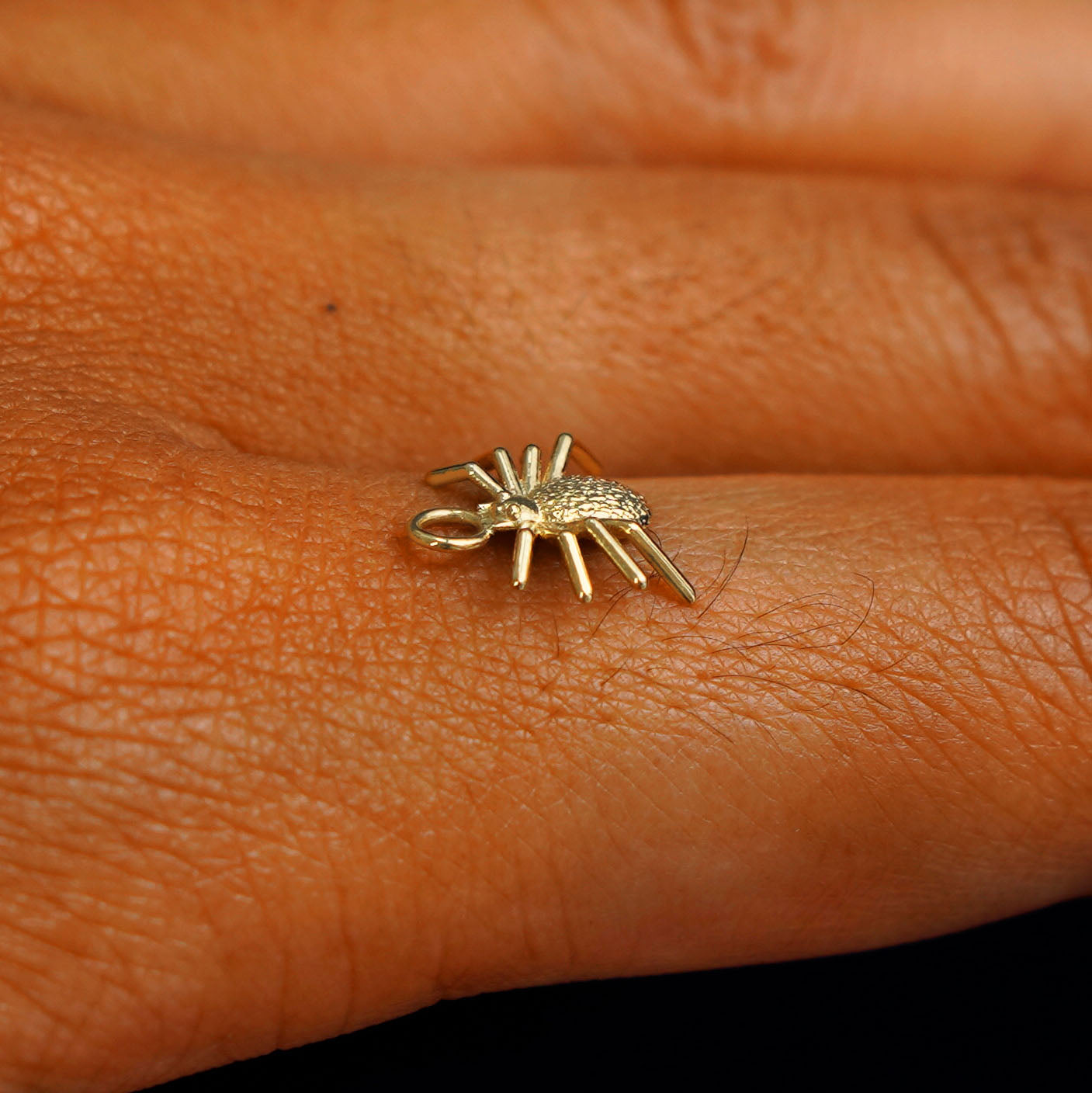 An artfully crafted arachnid, this dainty little critter is meticulously detailed in recycled, sustainable gold. This 14 karat gold spider charm comes in yellow, white, champagne and rose gold and with options to wear it on earrings or on a chain. A fully customizable jewelry piece that you can wear your way.