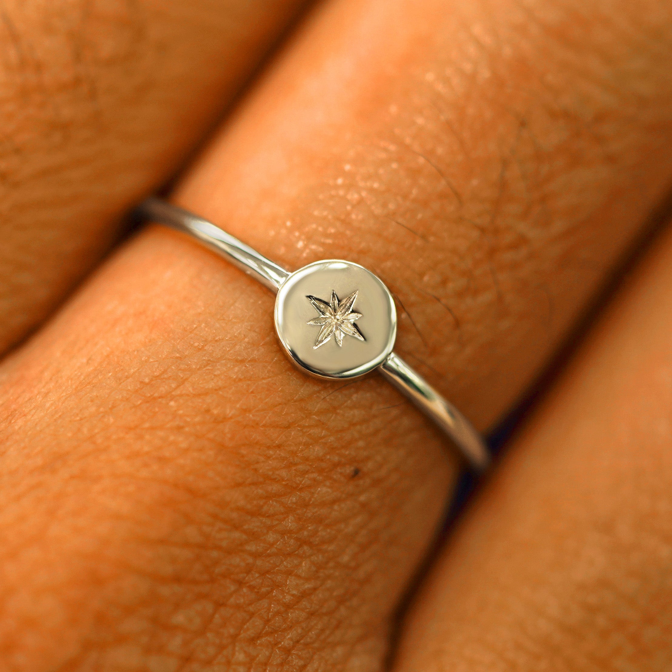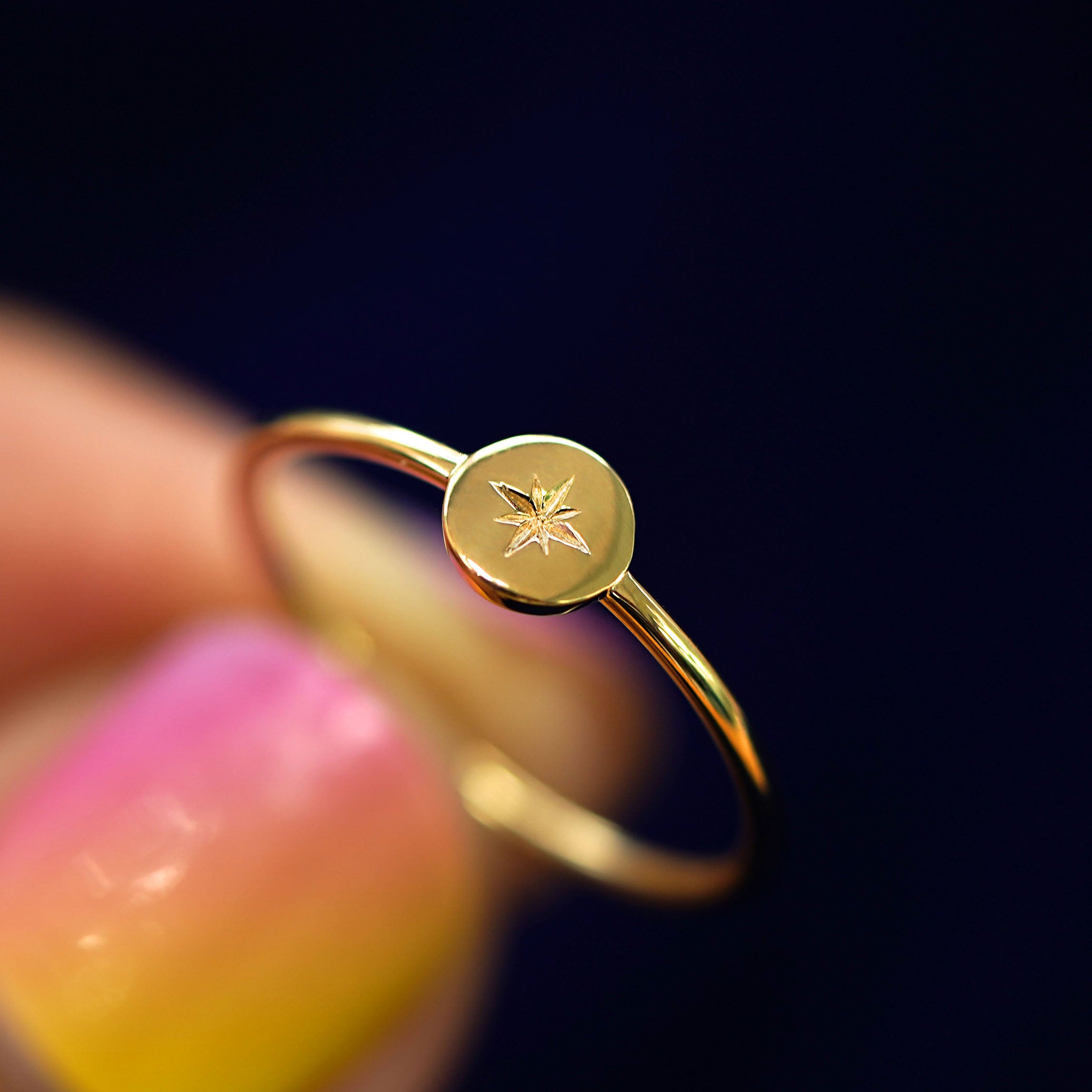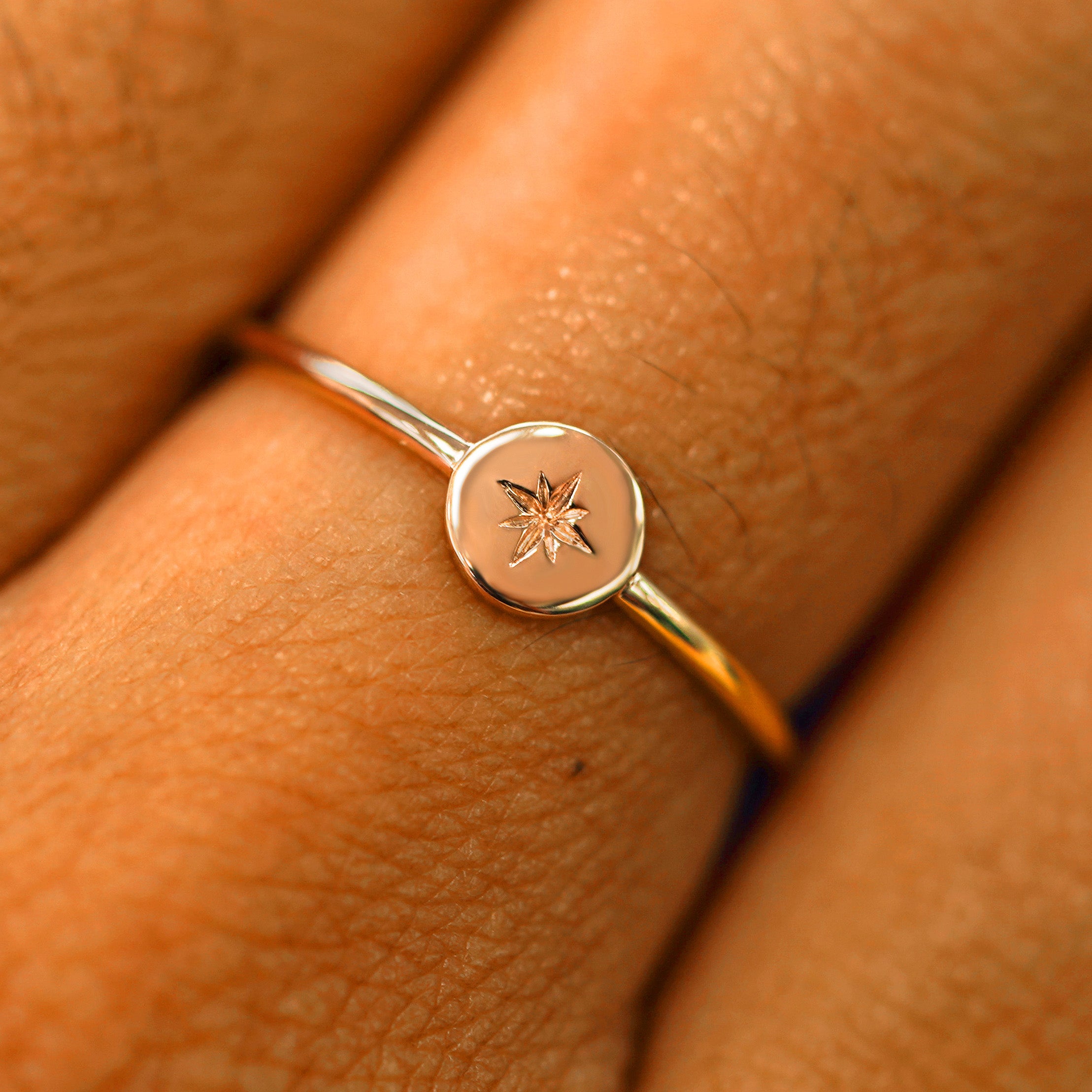 You are the star, so show it off by putting this celestial ring on your finger. Each star is carved by hand into this 14k solid gold ring and each will be unique. The perfect minimalist jewelry staple. You can swim, sleep, and party with this dainty gold ring on without a care in the world.