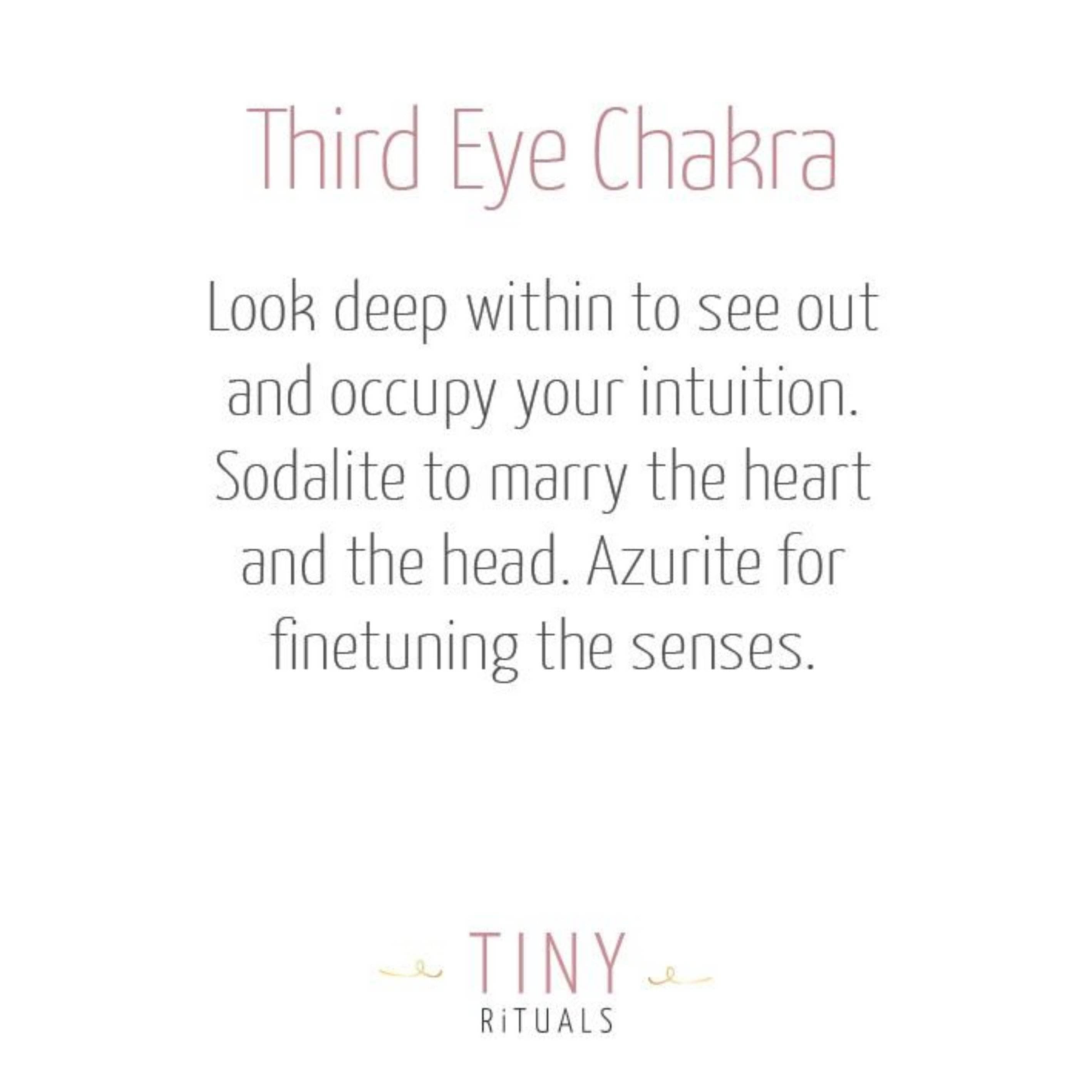 The indigo wash sitting in the center of your brow, the third eye chakra is where we start to enter our own universe of intuition and understanding. For those who feel like they need a little help understanding their purpose, either in a higher sense or with both feet firmly on the floor, the big picture stones of Sodalite, Azurite, Chrysocolla, and Dumortierite come together to open the vault.
