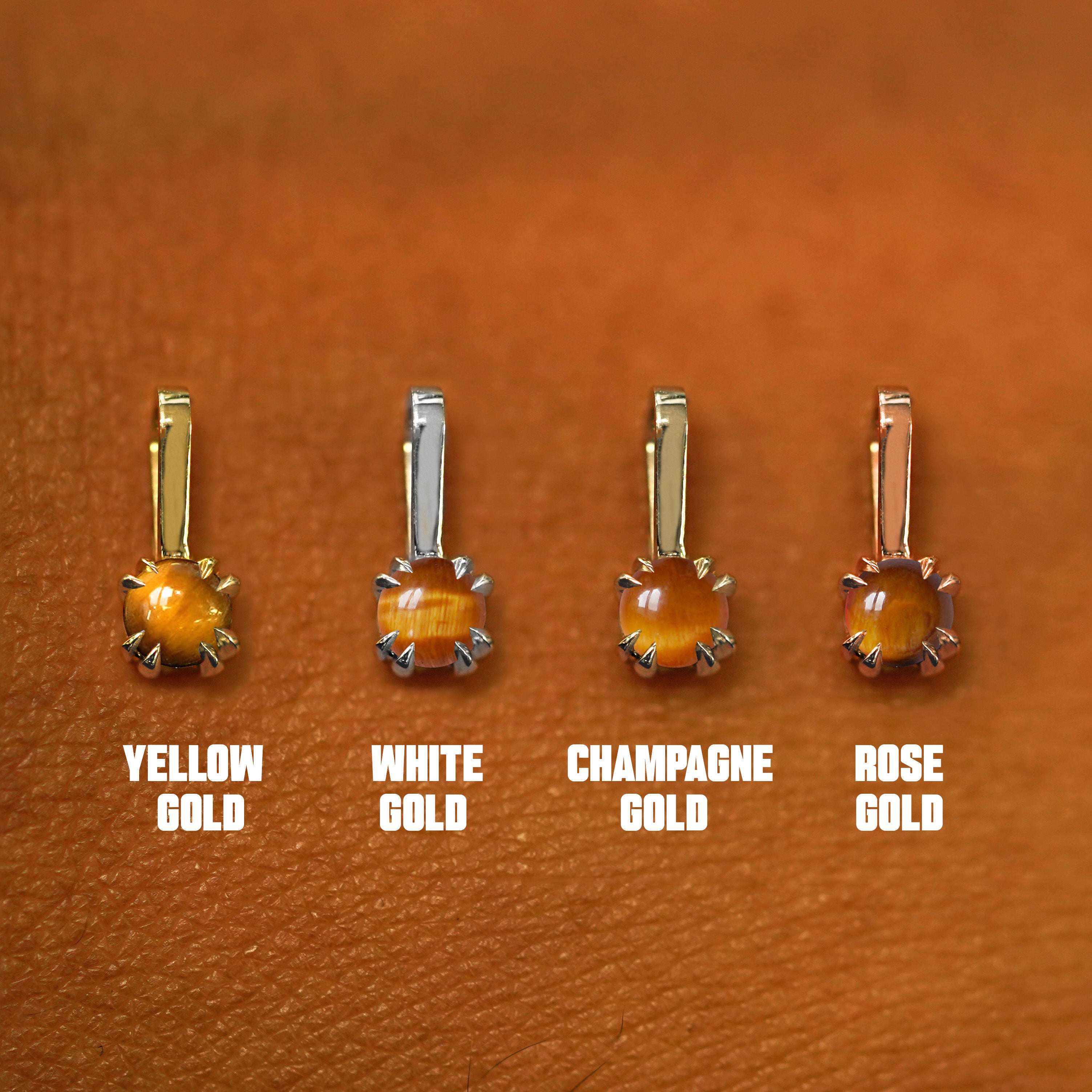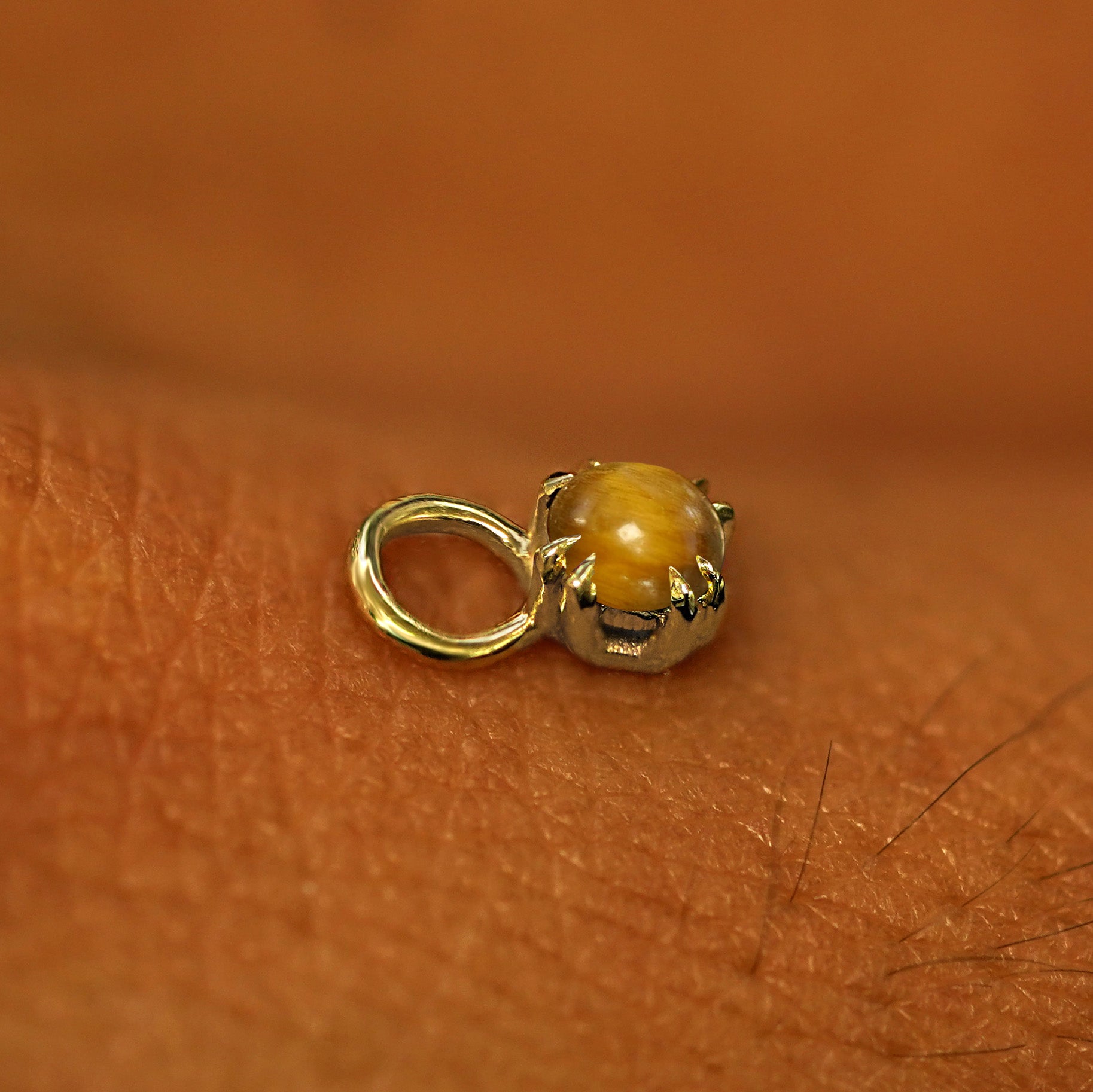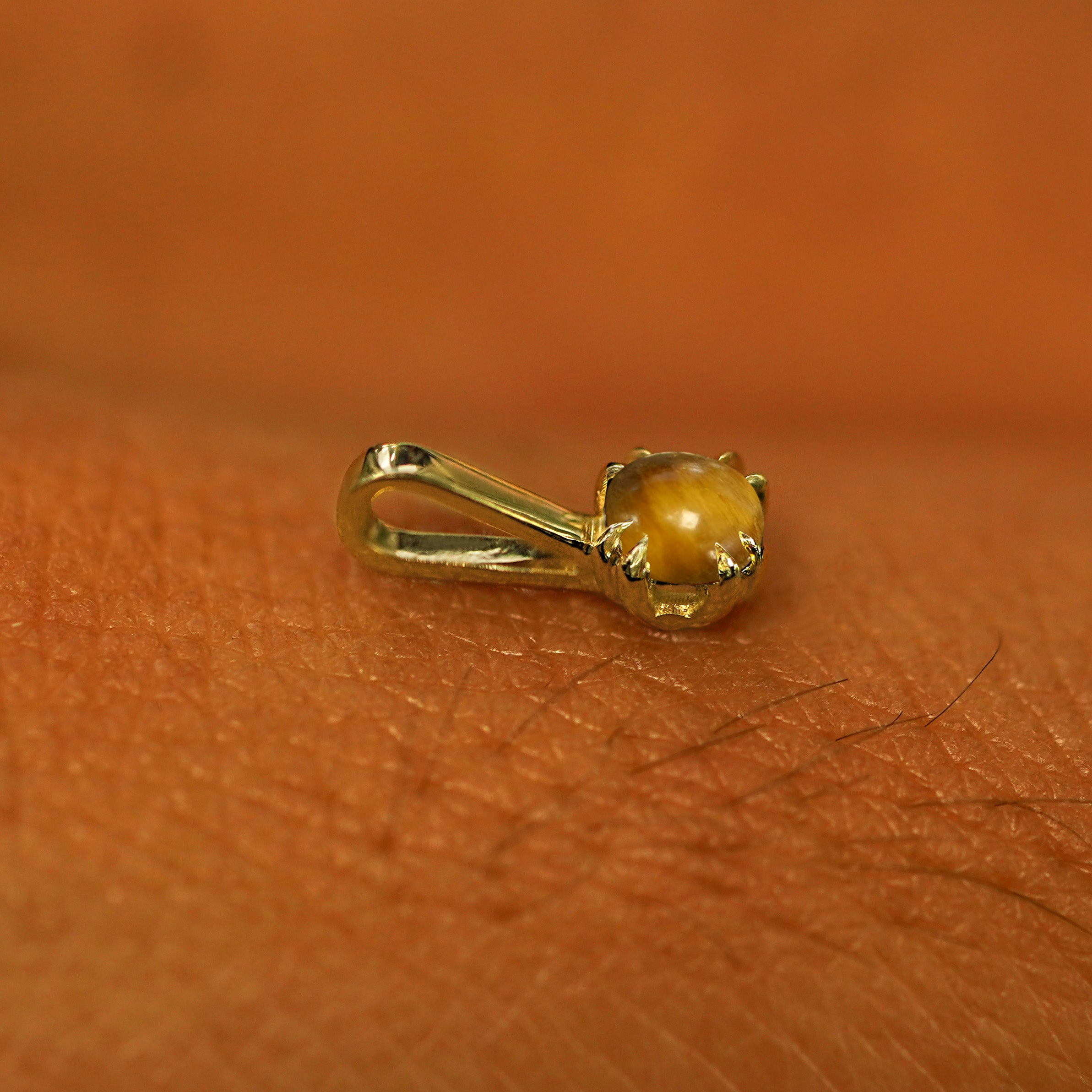 Charming color, dazzling shine, this tiger eye charm has it all. The mesmerizing sheen in these gemstones makes this solid gold charm the perfect companion piece to any necklace, bracelet, or earring.