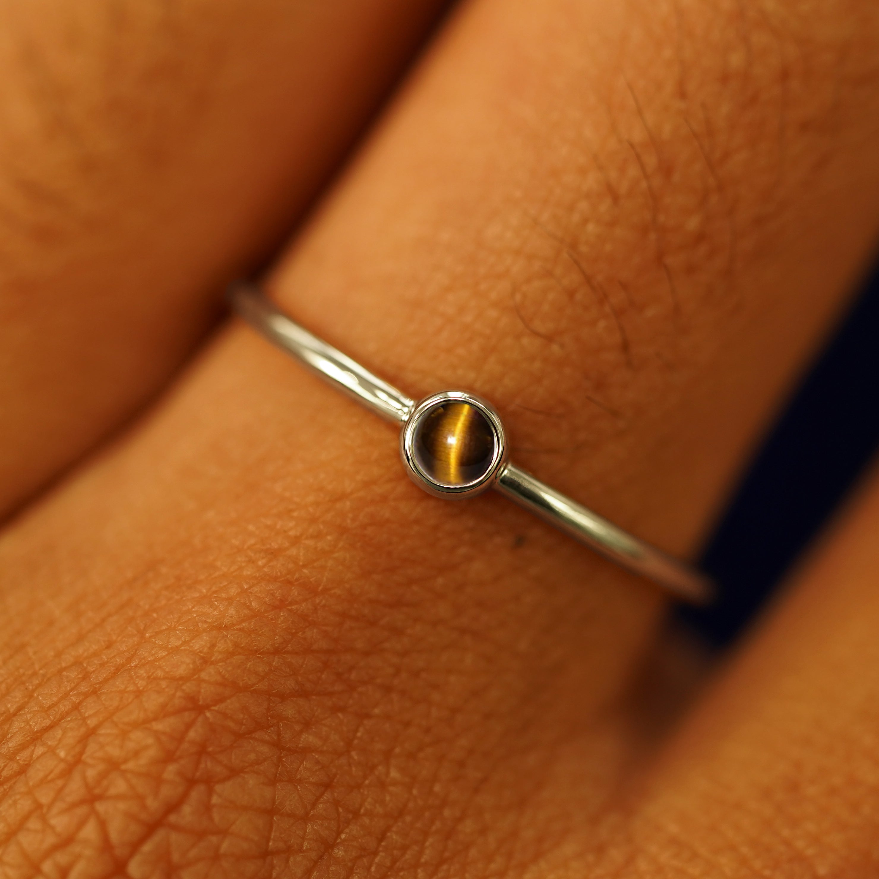 This shimmering chatoyant tiger eye ring is unique and mysterious. You can get lost staring at the flashy stripes of this unique gemstone ring. Wear this solid gold ring alone or stack it with our other gemstone rings. Whether proposing to your partner or celebrating yourself, this dainty ring is a 14k solid gold investment.