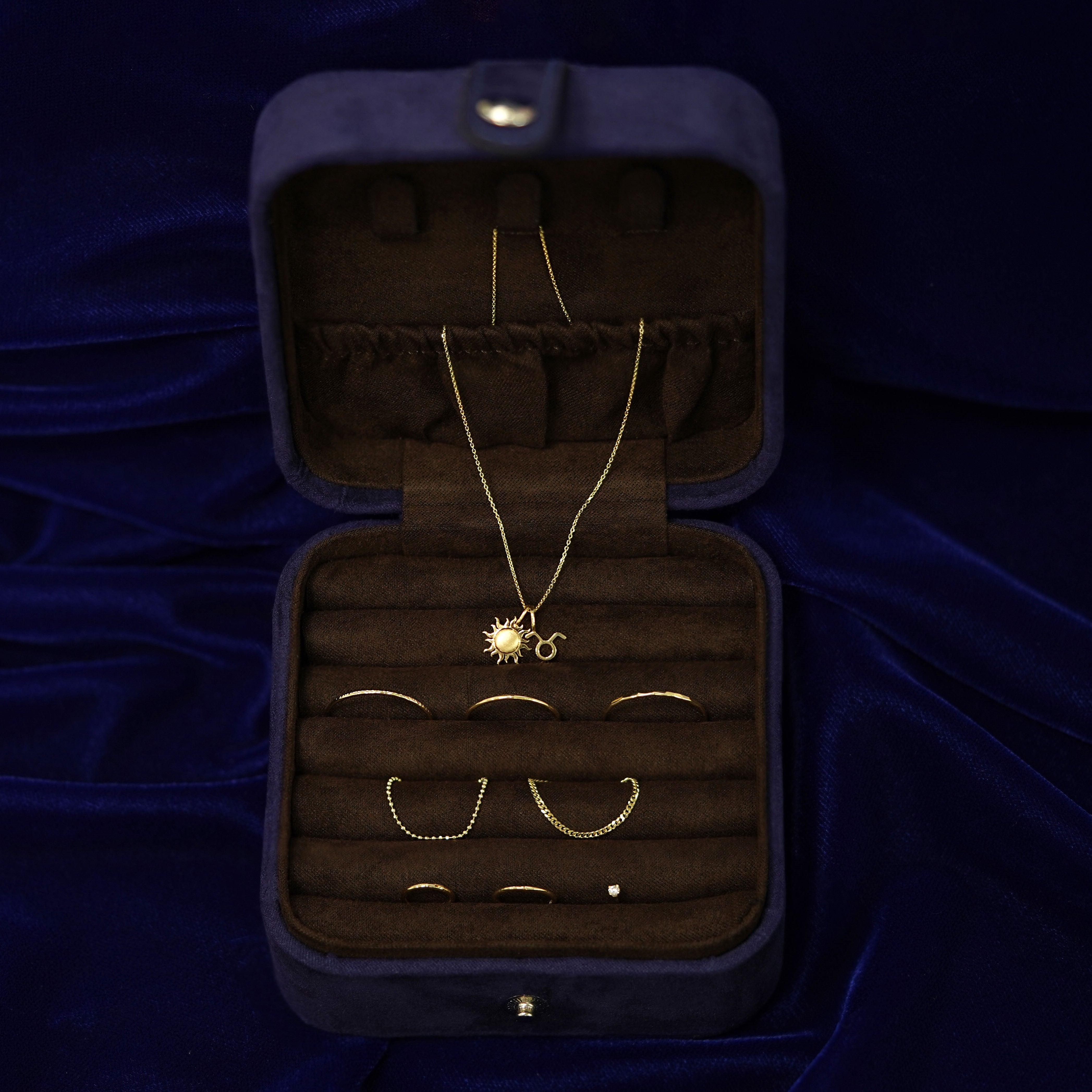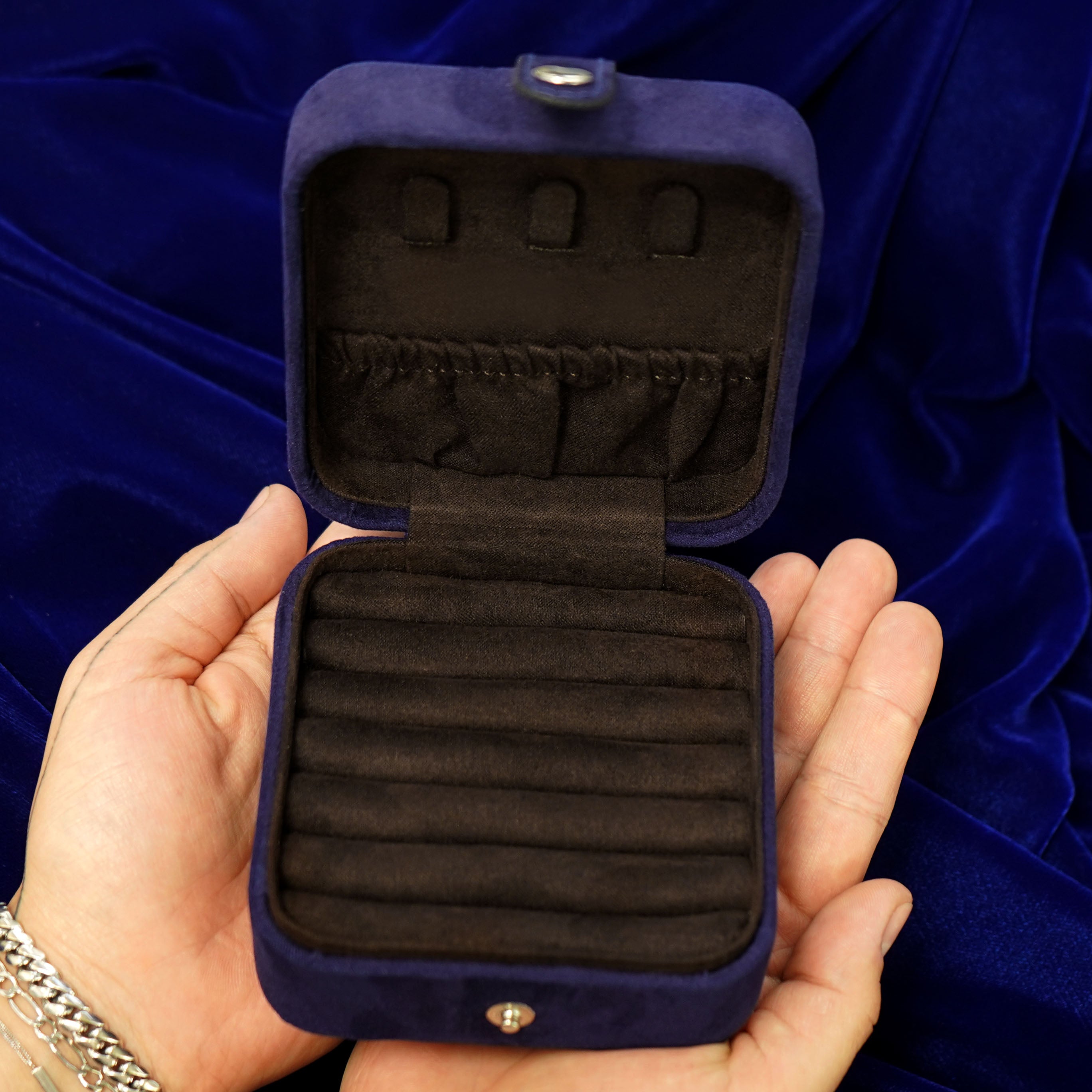 Perfect for storing your Automic Gold jewelry at home or on the go. This chic little box has room to fit multiple pairs of earrings and rings in the bottom. You can hang your necklaces or bracelets on the three hooks inside the lid and they'll rest inside the little pouch so they won't dangle and get knotted. Secures with a button snap.