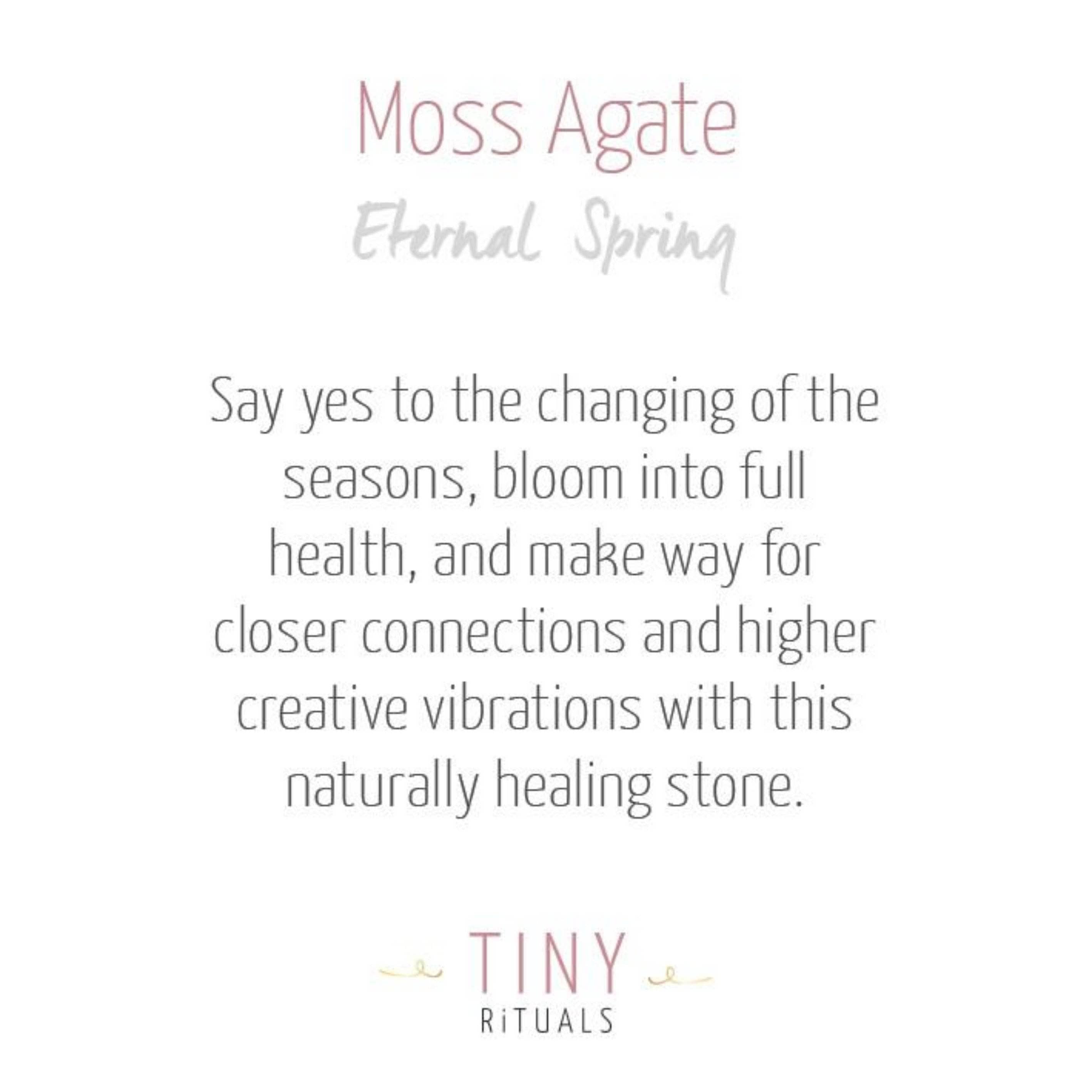 Gaia gifts us sunlight through the trees, water singing over rock, and the shimmering natural delight of tumbled Moss Agate. This gemstone is the vision of Mother Nature and is soaked in spring and deep summer vibes. Moss Agate brings balance, heart-healing, and quiet contemplation to all who hold this tumbled gemstone close and celebrate the shifting of the seasons.