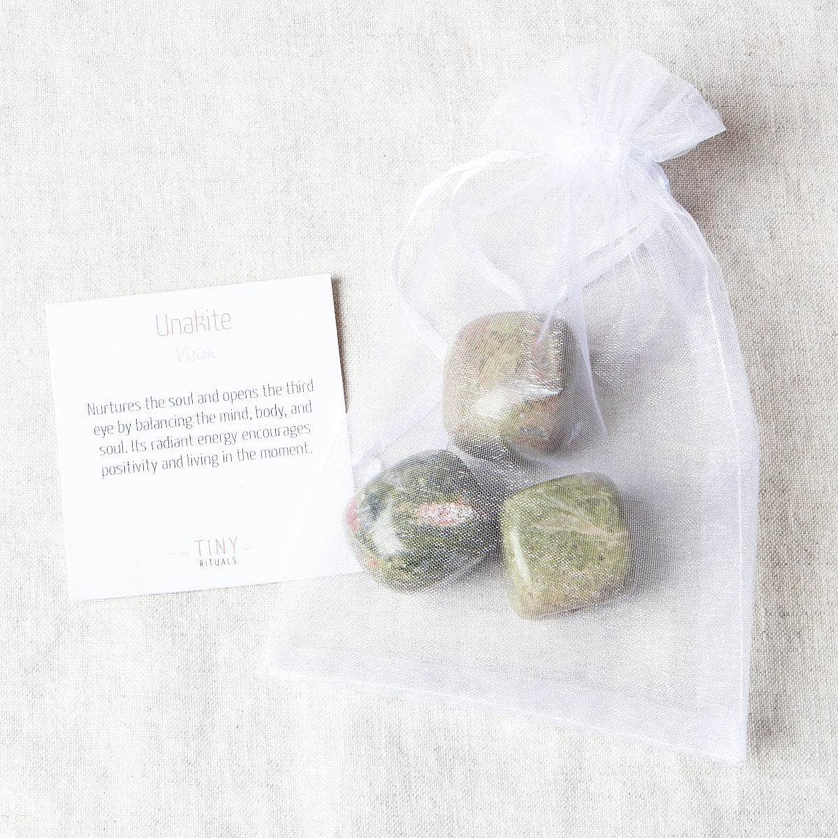 It’s easy to fall in love with the colorful calm of Unakite. This tumbled Unakite Stone Set balances emotions, protects against electromagnetic pollution and cleanses the heart chakra so you can surrender to all shades of love, trust, and leap higher. These tumbled stones are all American - first found in the mountains of North Carolina. A stone of vision and potent crystal healing, the tumbled stone of Unakite can help you rise up as solid and magnificent as the mountains from which it is born.