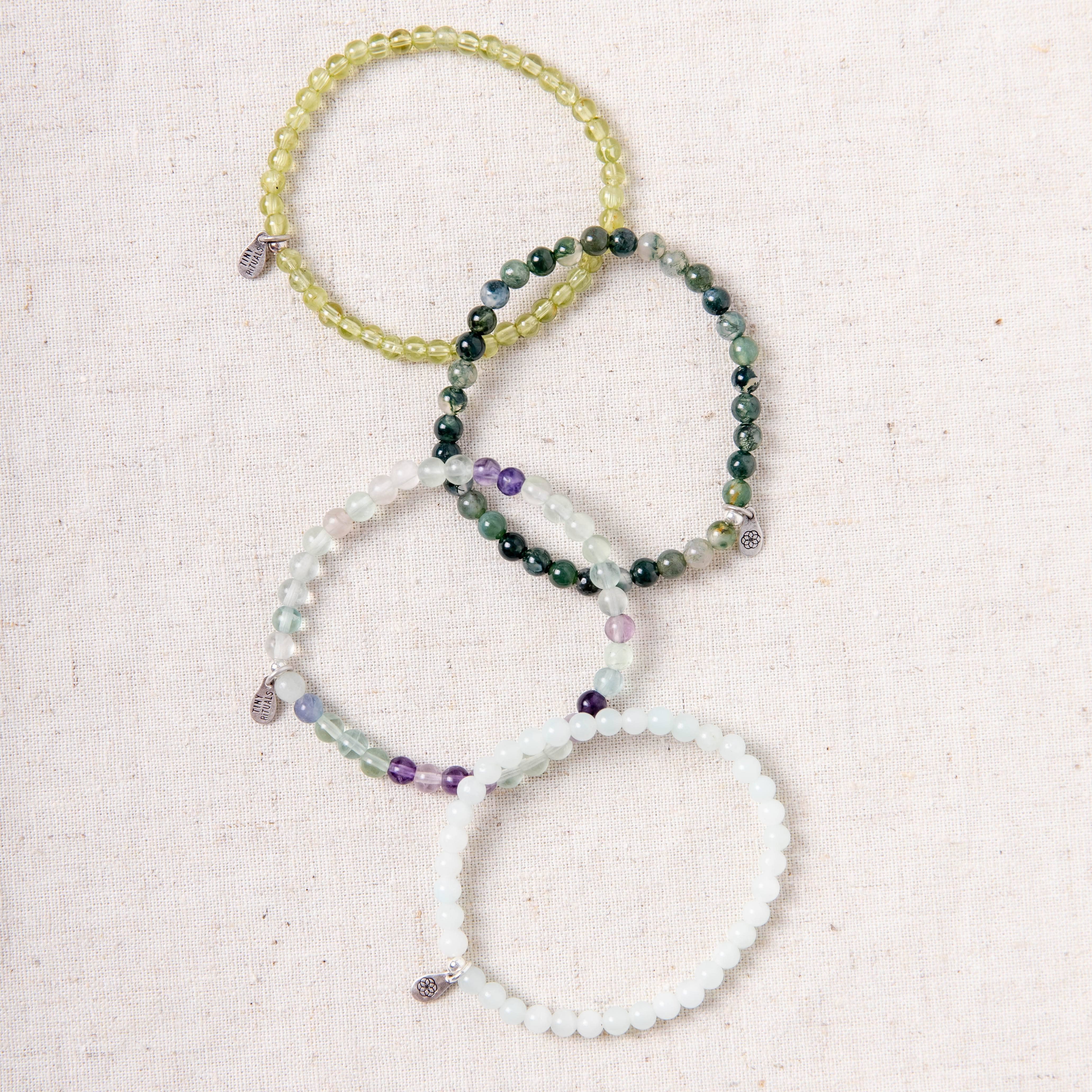 - Peridot, Moss Agate, Rainbow Fluorite, Amazonite