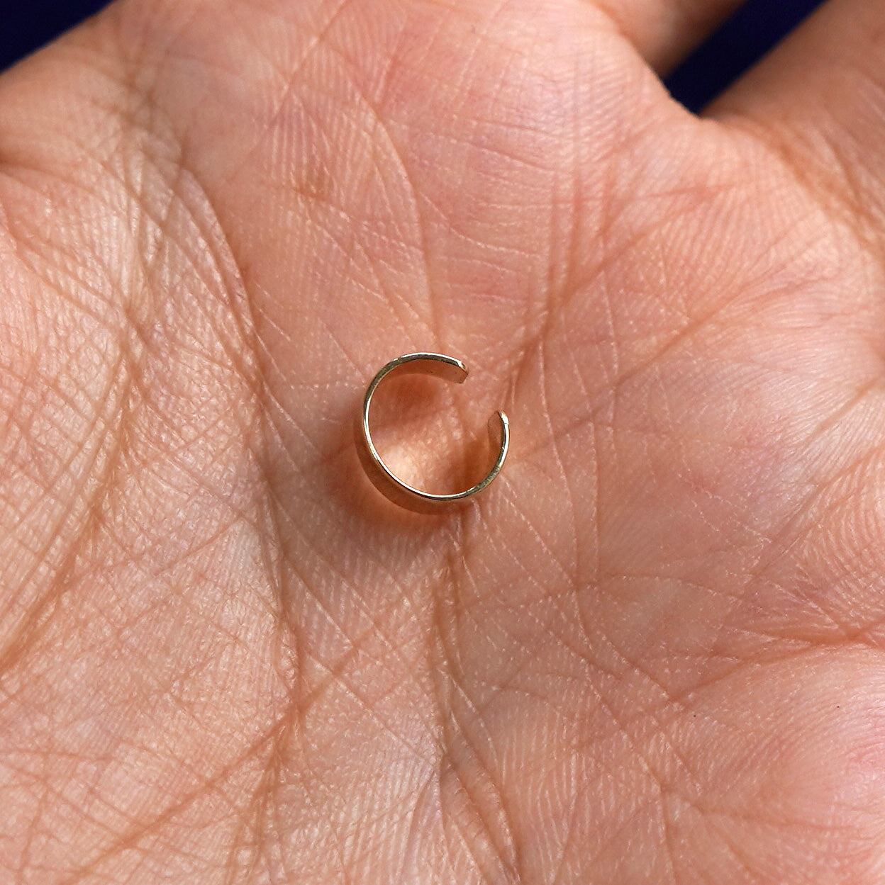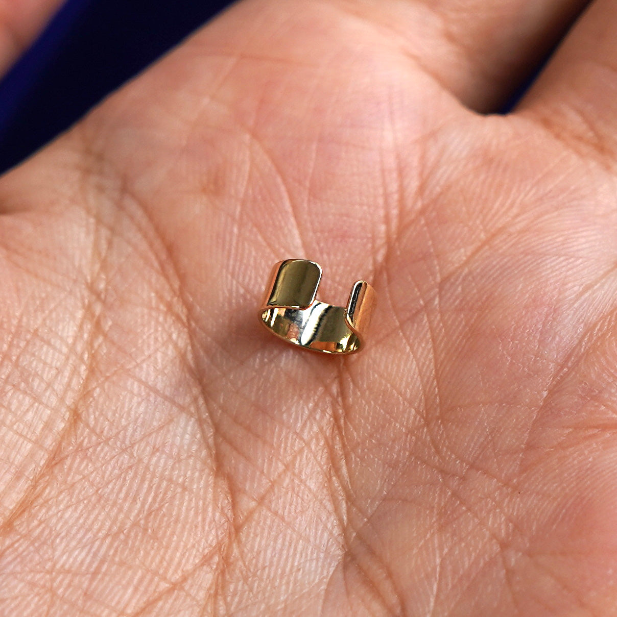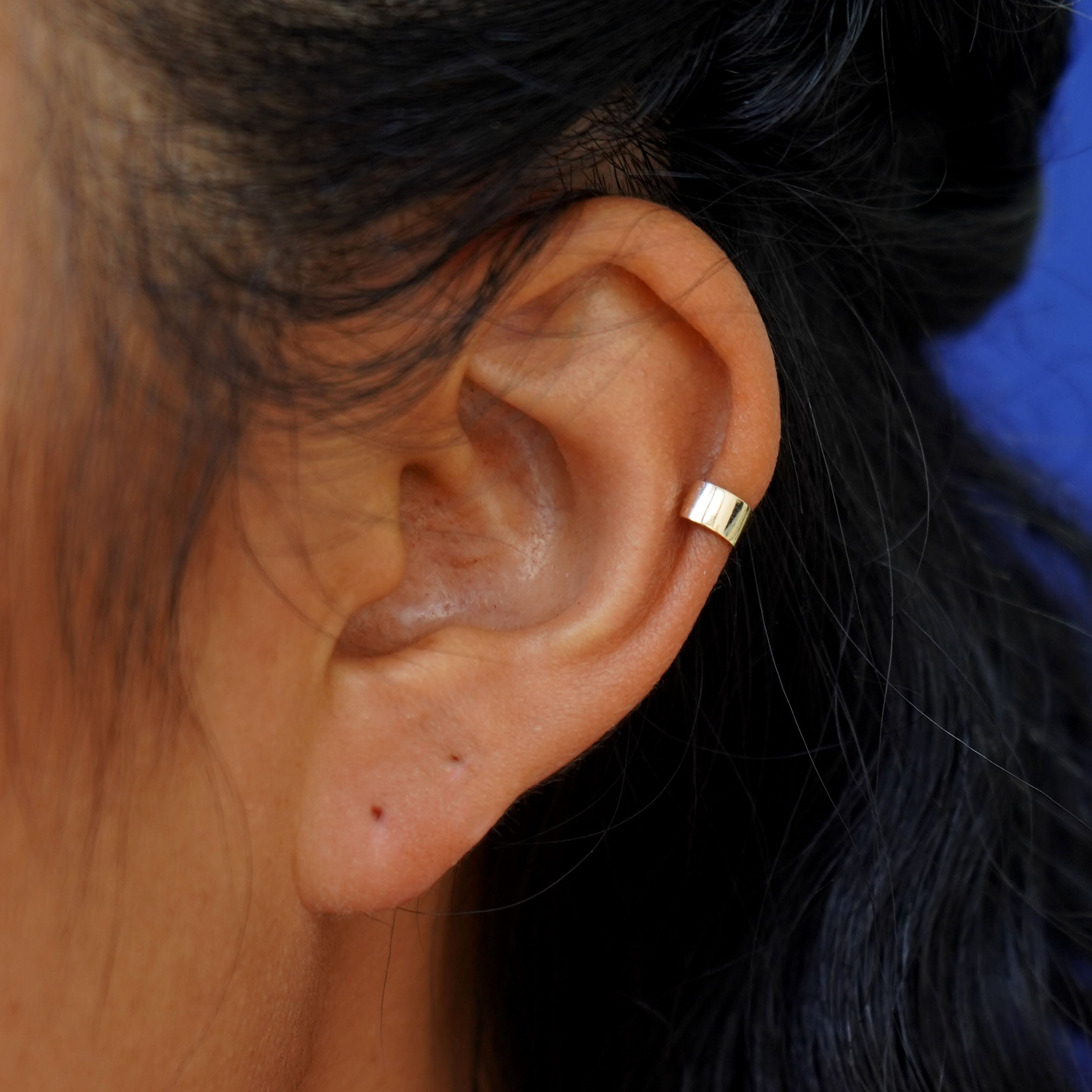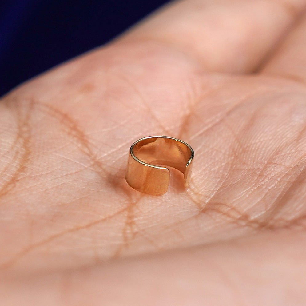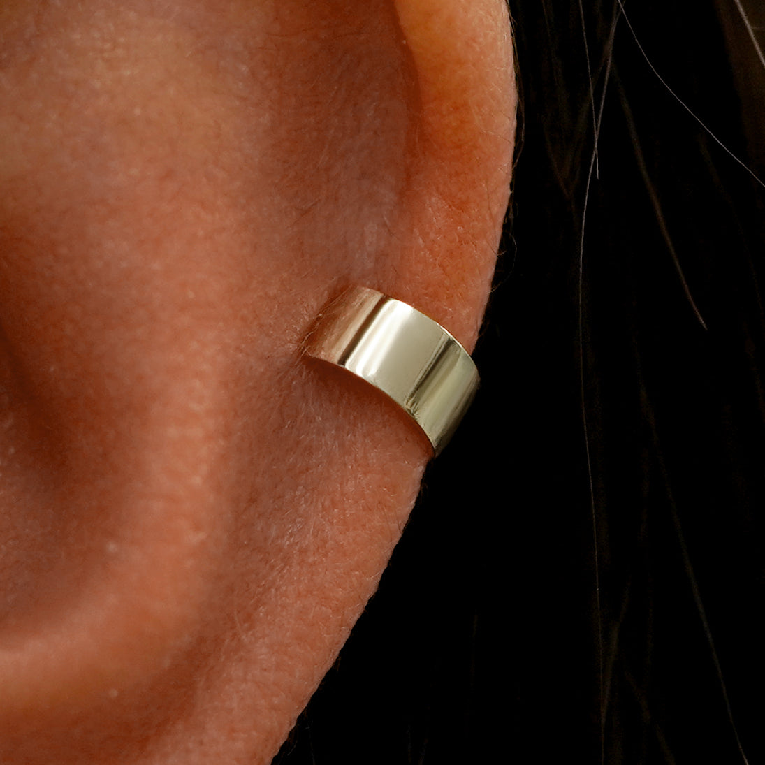 A cute gold earring without the commitment, no piercing is required for this stunning ear cuff. This wide cuff earring easily hooks onto your ear for every day flair. Wear this delicate 14k solid gold beauty alone, or in all three colors along your cartilage for a truly bold look.