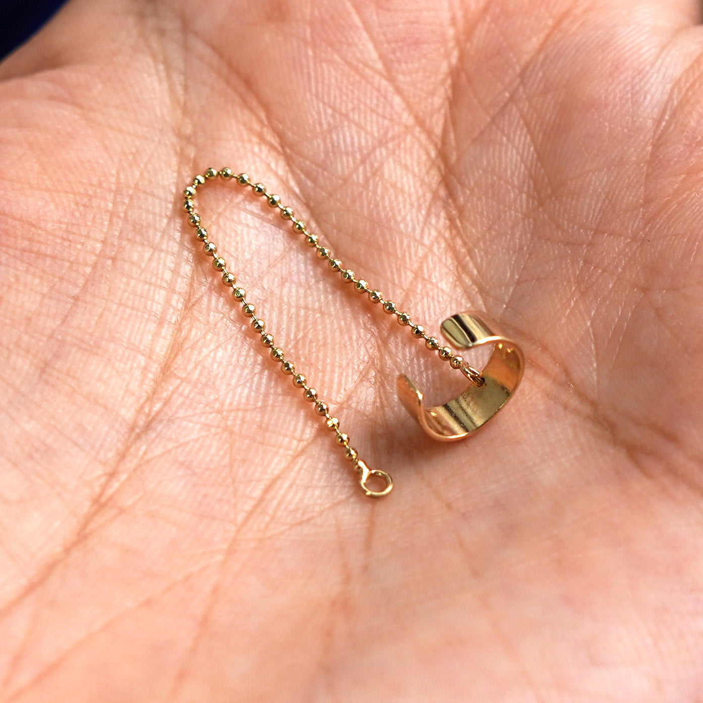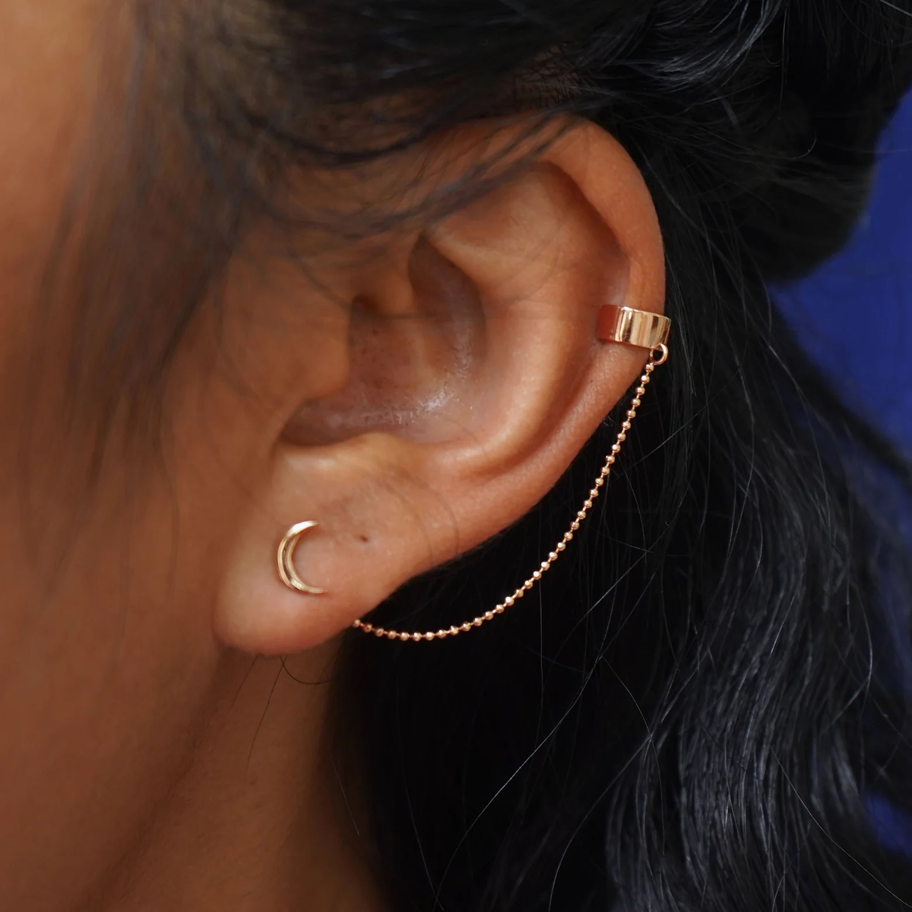 No piercing required for this sweet little detail. Our classic Wide Cuff with added flair! Attach the 14 karat gold bead chain to our other sustainable gold earrings for a look as unique as you are! These delicate cuff earrings easily hook onto your ear for a comfortable, chic style, no matter what the day (or night) brings.