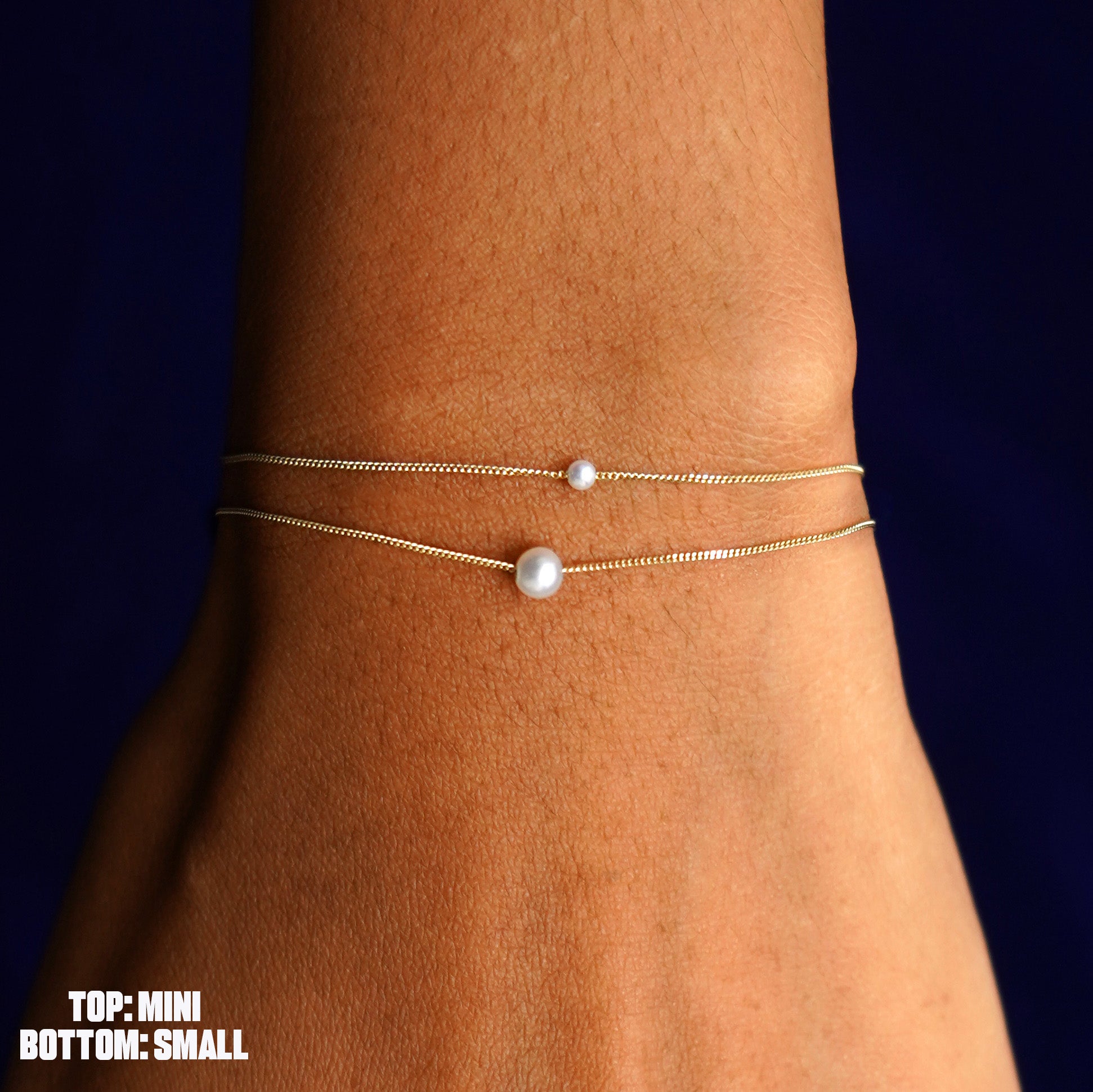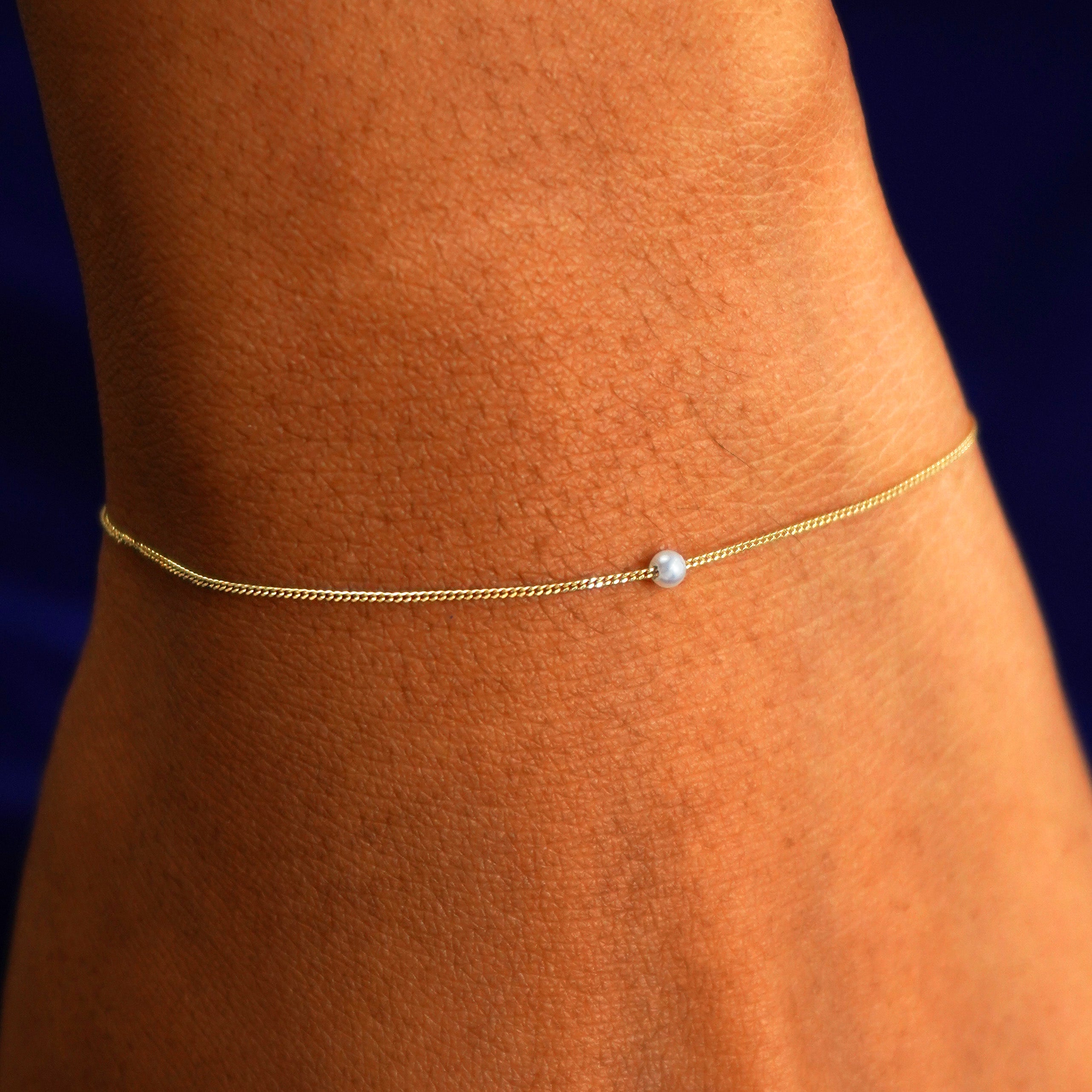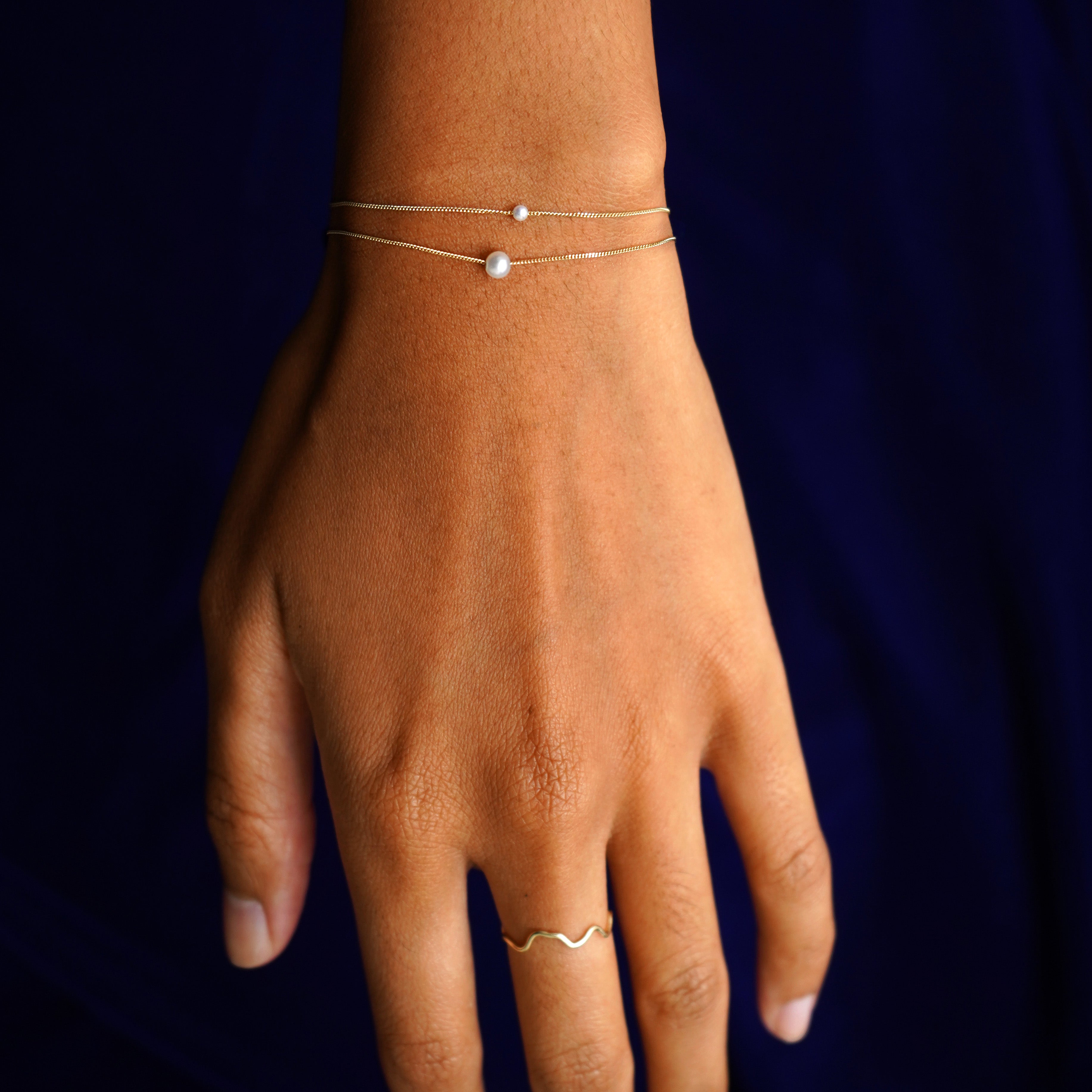 Just like people, no two pearls are exactly the same. Wear a symbol of your uniqueness with our cute tiny pearl slide bracelet. Inspired by our Small Pearl Slide Bracelet, this chic piece features a 2mm white freshwater pearl that sits on our 14k solid gold Essential Chain bracelet with a strong and elegant spring ring lock with an easy-to-grip Automic Gold AU plate.